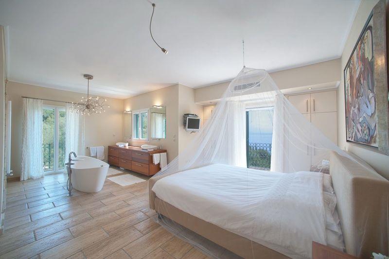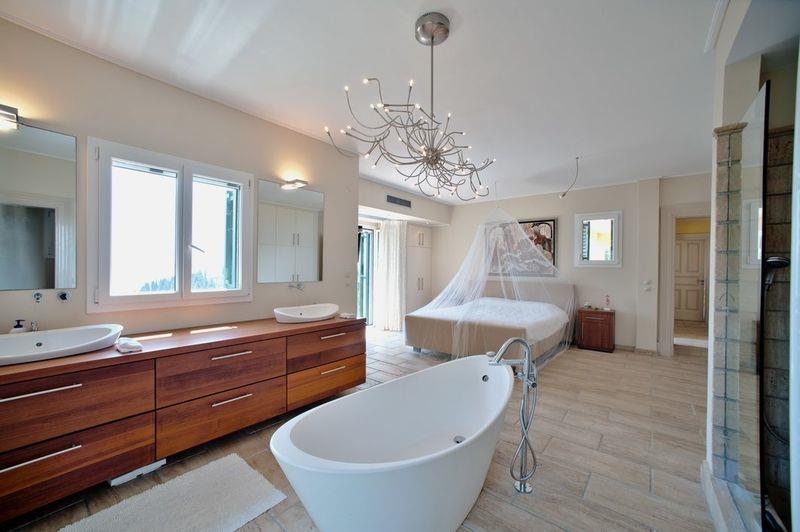 Designed and finished to offer all modern comforts, the main villa has 450 sqm of living space spread over 3 levels. The ground floor of 178 sqm is the main living space – there is a spacious living room with beautiful wooden beamed ceilings and fireplace, a dining area and a large, separate fully fitted modern kitchen. Large windows and doors on this level are a dominant feature that give access to the covered exterior areas that boasts the stunning views of the bay and the Corfu Channel. This level also features a bedroom with ensuite bathroom and a guest WC.