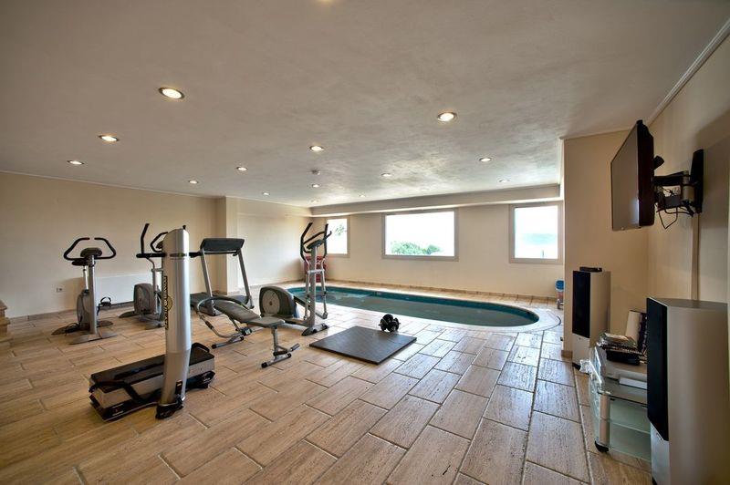The upper level of 80 sqm is where we find the master suite bedroom with a large ensuite and fitted wardrobes and a further bedroom with bathroom. Both have access to balconies. The lower level is 190 sqm in size and has a large open plan space which is set out as a gym and indoor pool. There are also 2 ensuite bedrooms on this level, a utility room, storage area, a further bathroom and a fully fitted kitchen that has convenient access out to the outdoor pool.