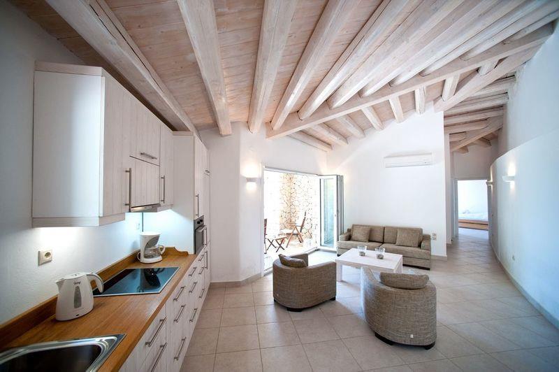 On the level below the pool is a separate independent guest house of 102 sqm with 2 bedrooms and bathrooms. There is a good sized living room with fully fitted kitchen – a lovely area with high wooden beamed ceilings that has access to a veranda as well as private garden.