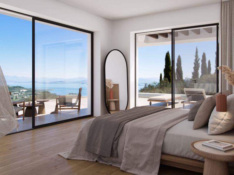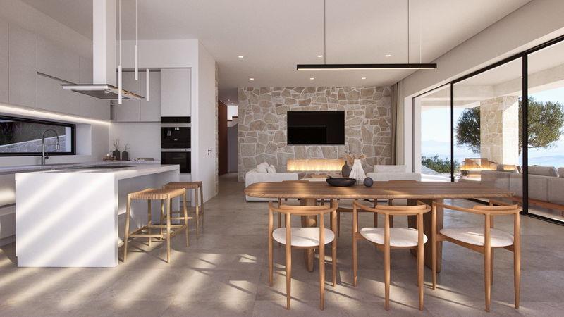 Blending traditional craftsmanship with modern architectural design, the villa achieves a rare harmony between timeless elegance and contemporary luxury. Expansive openings allow natural light to flood the interiors, seamlessly connecting the indoor spaces with the endless blue of the Ionian. The living areas are spacious and functional, thoughtfully designed to meet the needs of a family while also providing an ideal setting for entertaining guests.