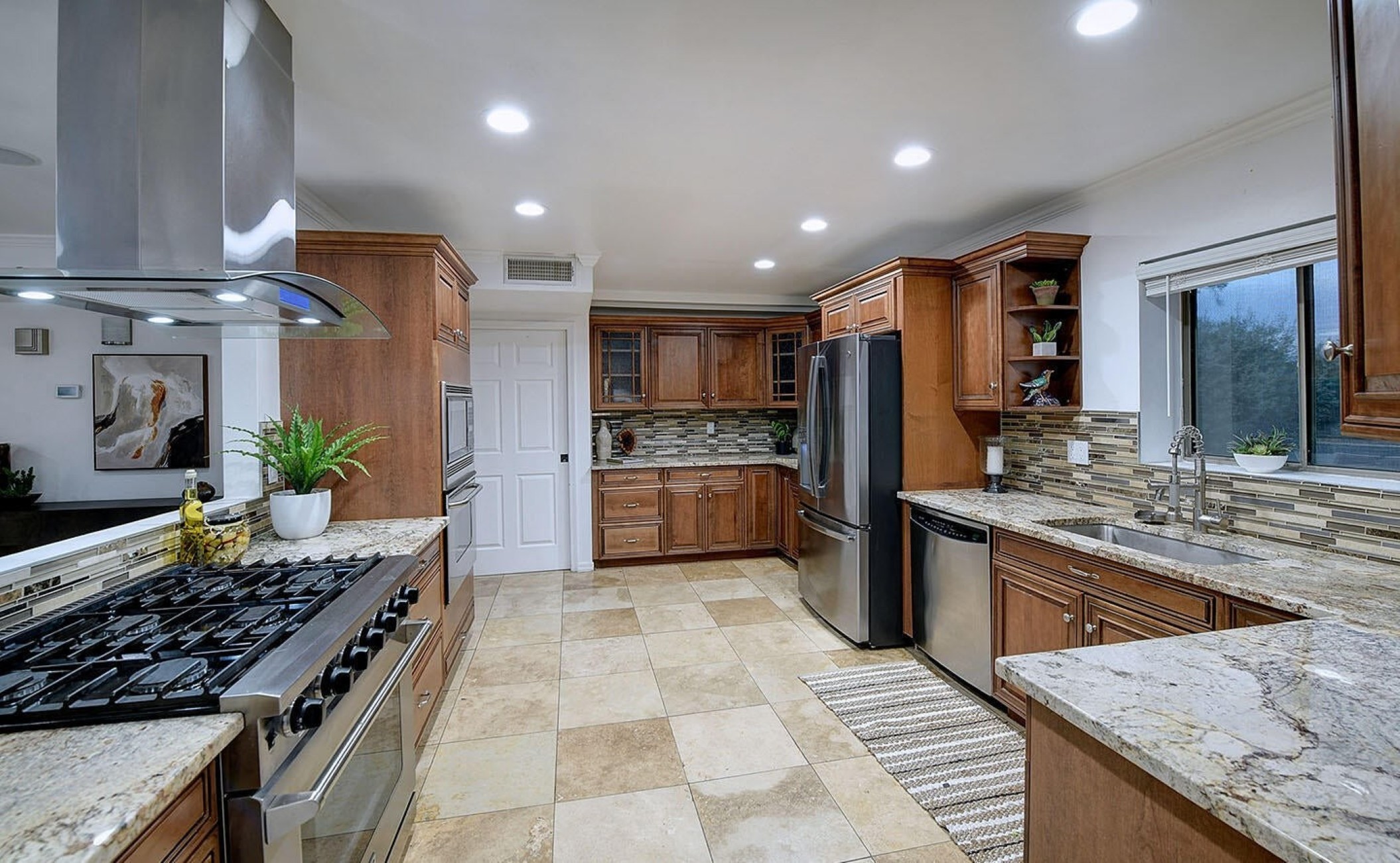 Stunning beautifully remodeled end unit -townhouse overlooking the 14th fairway of the prestigious gated OMNI Tucson National Golf Club. A privately gated front courtyard, exquisite Great room with walls of windows and French doors, lovely dining area, sophisticated gourmet kitchen with granite countertops, designer backsplash, custom cabinets, incredible gas range with dramatic glass lighted hood, stainless steel appliances, travertine tile floors throughout (no carpet), 3 bedrooms ( split plan), 2 baths including primary suite with sitting area, luxurious updated bath with granite countertops, double vanities, Jetted tub, large walk-in closet and private entry to the rear patio. Laundry room with washer & dryer and oversized one car garage w/storage room.