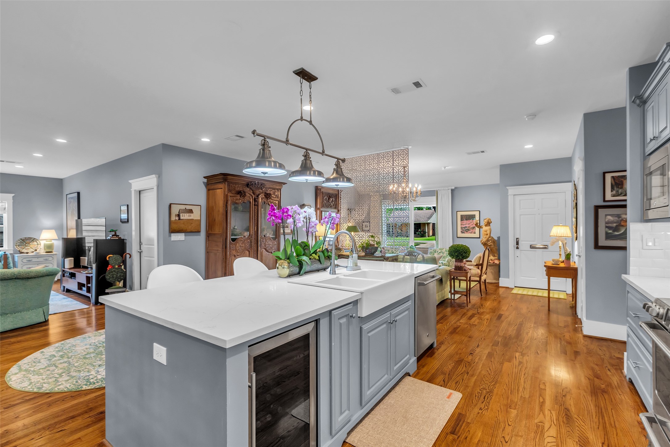 Redesigned home that has had a full renovation. 9' ceilings, open kitchen, dining and living, 3 bedrooms and 3 full bathrooms, custom cabinets, GE cafe Series appliances including a five-burner gas range with pot filler, microwave, dishwasher, and wine fridge, quartz counter tops, irrigation system and custom front door. When renovated all electrical, plumbing, HVAC, and ducting replaced. Zoned to Sinclair Elementary. This home has never flooded. Amazing, manicured back yard with stocked pond and zoysia grass. This one is a must see.