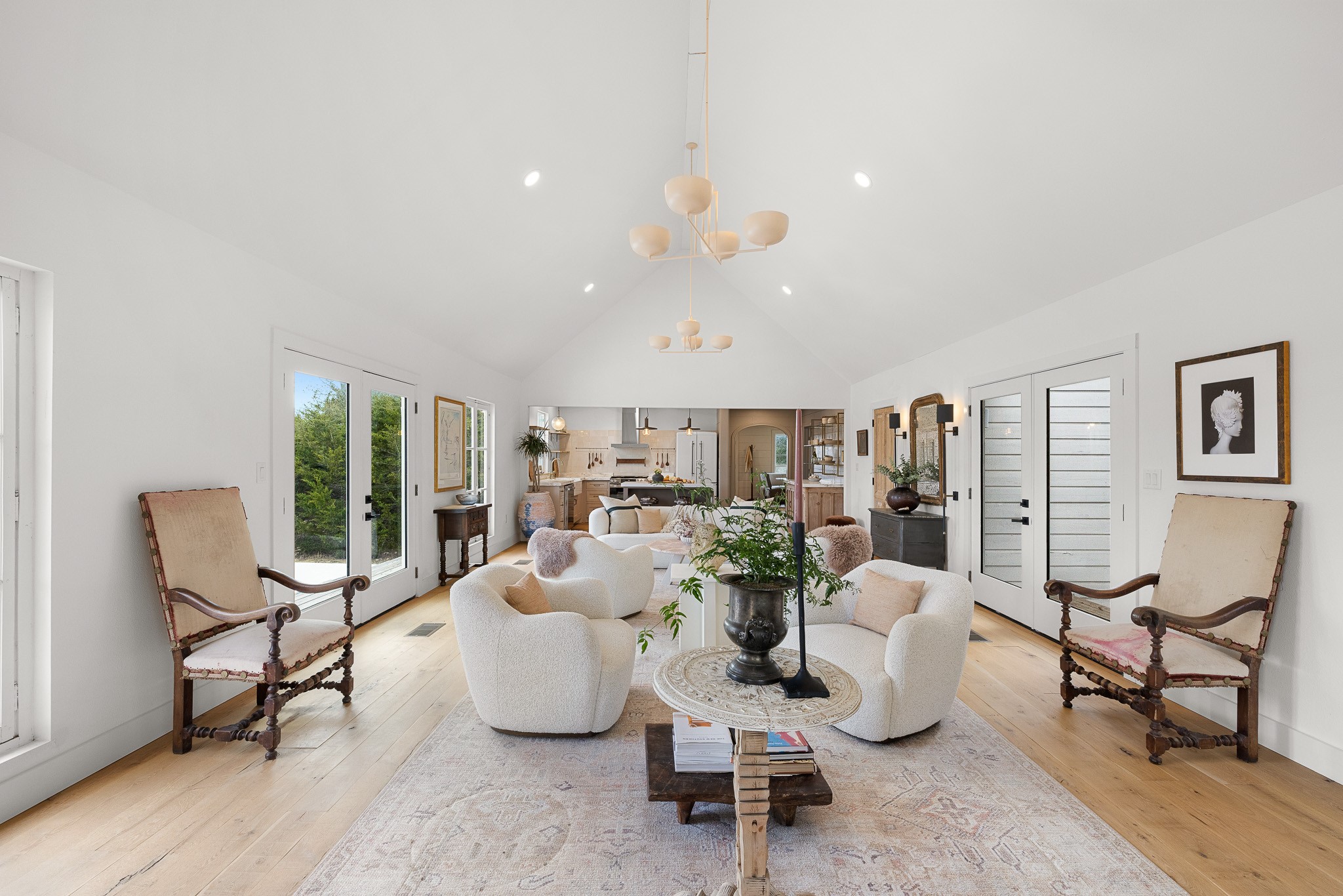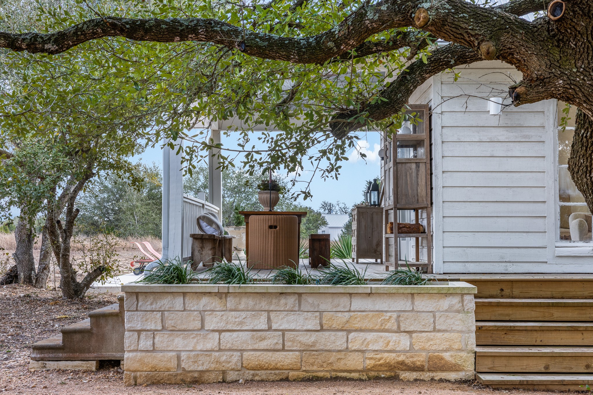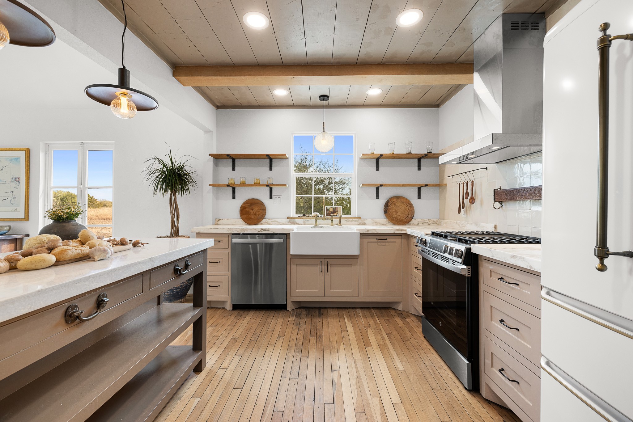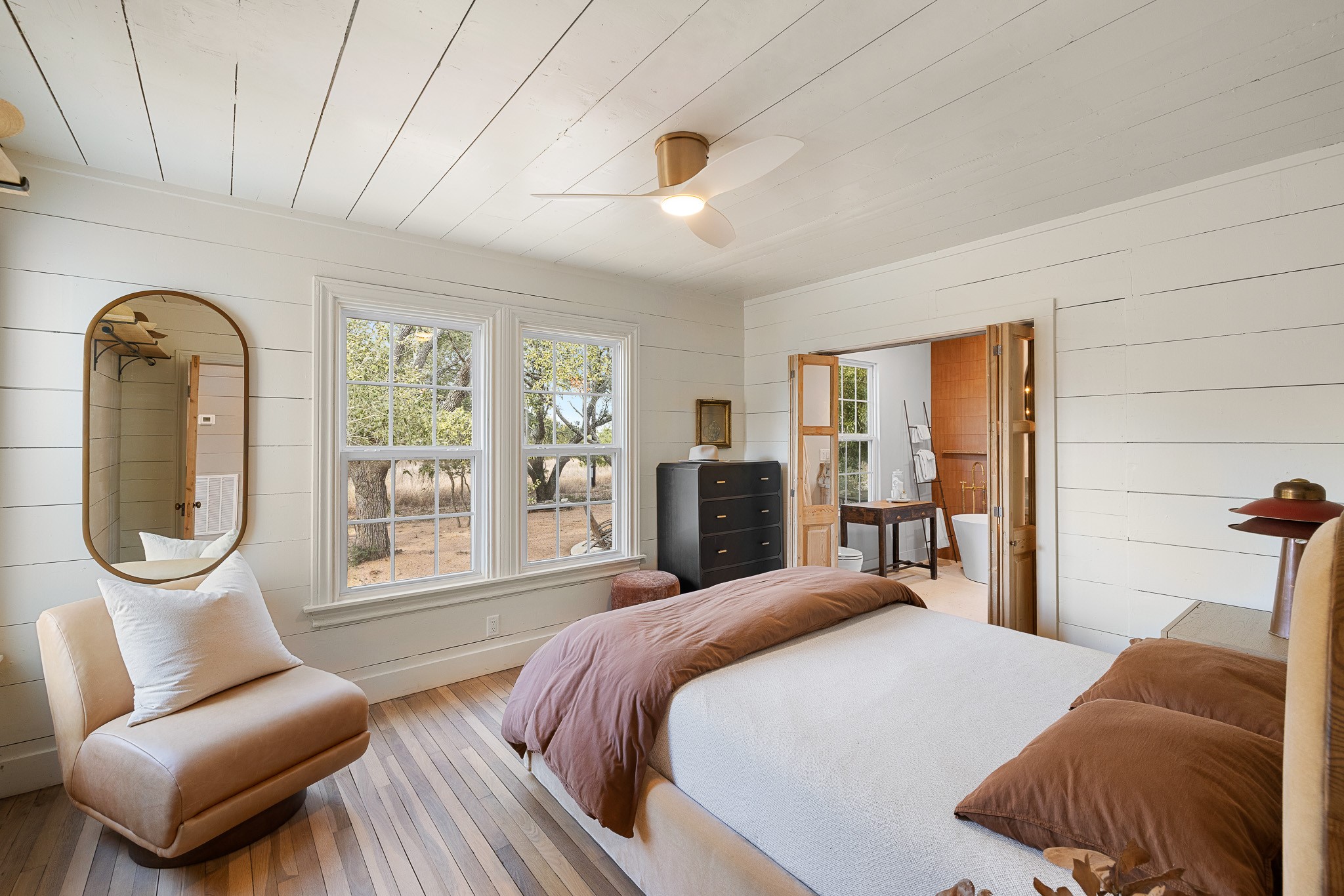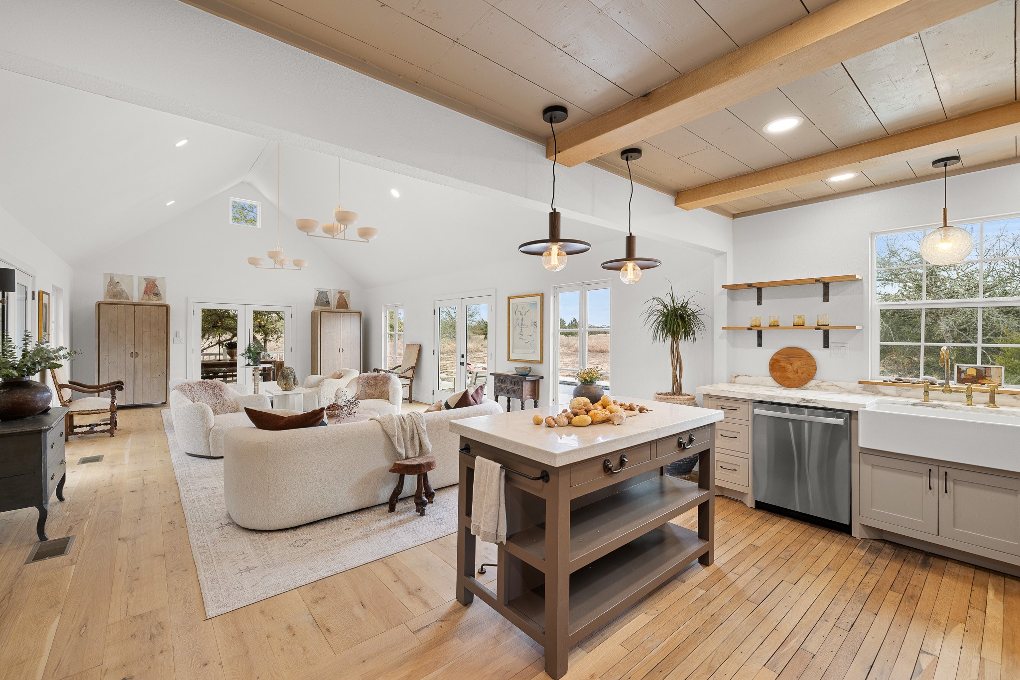 Set on 6.8 scenic acres in Round Top, this beautifully reimagined vintage farmhouse blends timeless charm with thoughtful modern design. The home features both a welcoming formal living area and a stunning great room with vaulted ceilings and peaceful views, creating multiple spaces for relaxing and entertaining. A spectacular, designer kitchen anchors the home with style and functionality. The downstairs primary suite offers a serene retreat, while the upstairs bedroom/loft area provide flexible accommodations for multiple beds and sitting area and include a full bath—ideal for guests. Outside, mature trees, 2 tranquil ponds, and excellent privacy from the road surround the home. Covered porches invite year-round enjoyment, while a recently added pool and gorgeous outdoor spaces complete this private escape. Property can be offered fully turn-key (for additional consideration) Enjoy being just minutes from the renowned shopping, dining, and iconic events of Round Top and Warrenton.