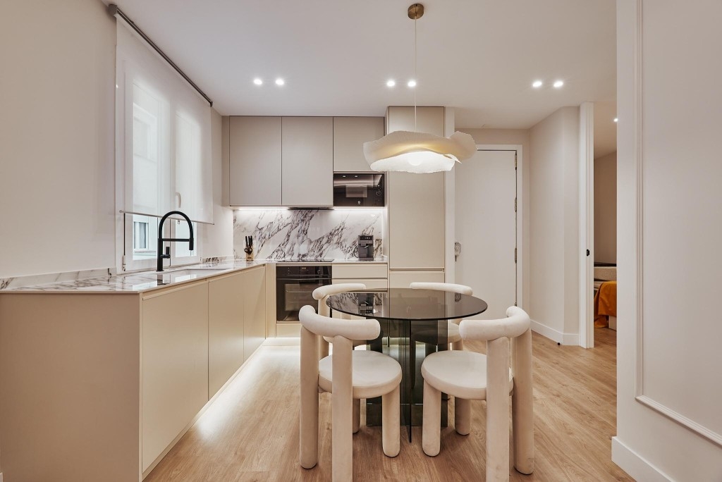 We offer for sale this magnificent interior flat facing a large sunny and quiet courtyard, with an area of 68 cadastral square meters and two bedrooms, renovated brand new, located on the first floor of a property with classic facade, located in the most sought after and exclusive area of the Salamanca neighbourhood - Lista in José Ortega y Gasset. The building was built in 1920 and the property has great advantages that make it a very attractive option due to its excellent location and the quality of the refurbishment carried out.This property is distributed in an entrance hall, a living-dining room with two windows facing a large quiet courtyard that provides a magnificent natural light. Integrated in the living room and next to the dining area there is a kitchen which is fully fitted and equipped with top of the range electrical appliances. In the rest area we have the two bedrooms that are equipped with fitted wardrobes and are oriented to a bright and quiet courtyard. The master bedroom is a suite with bathroom and dressing room. A complete and spacious bathroom serves the second bedroom and is used as a guest bathroom..It is worth mentioning the quality of the refurbishment carried out in which the best materials have been used with air conditioning with independent splits in each room and a great thermal and acoustic insulation. The property is sold furnished and decorated by a prestigious interior design studio. All this makes it an opportunity as a family home or investment.