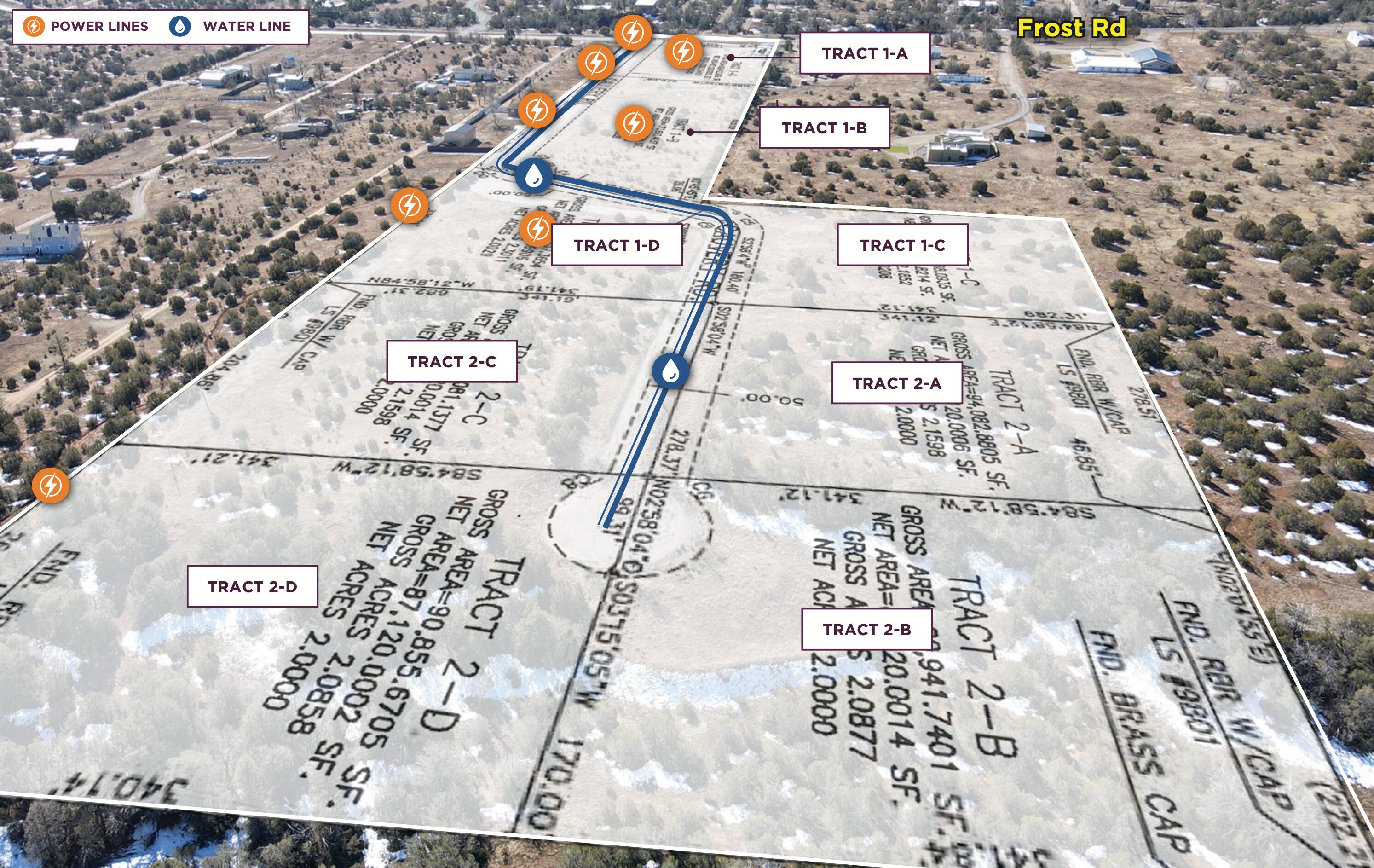 Cauvery Land unfolds across 19.42+/- acres zoned A-2 in the heart of Bernalillo County's East Mountain growth corridor, where demand for larger parcels and flexible development continues to accelerate. As you enter through the fully gated frontage with partial block wall perimeter, a paved internal road guides circulation from the southern ingress/egress point, already establishing the framework for phased neighborhood lot layout. The first lot has electricity piped in, providing immediate operational capability, while water is available at the street for the balance of the tract--minimizing early infrastructure friction and preserving capital efficiency.Just off Frost Road (8,225 VPD) and less than a mile from the San Antonio roundabout, the site sits at a key access node within an