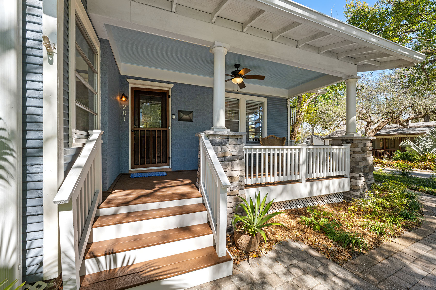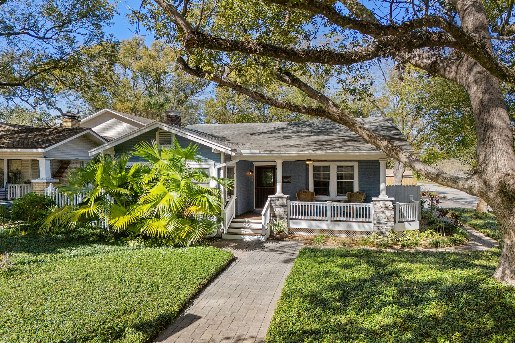 Welcome to this captivating bungalow residence offering 3 bedrooms, 2 baths, and an office in the Seminole Heights neighborhood of Tampa. Exceptional curb appeal invites you in with a welcoming covered from porch while the real highlight is the backyard retreat accomplished with this oversized 140ft deep lot, all of which is not in a flood zone. The fenced backyard is surrounded by lush landscaping and a versatile detached building, while the front is accented by a majestic camphor tree, complimented by a fragrant jasmine front lawn. Step inside to discover a beautifully detailed interior that seamlessly blends historic character with modern conveniences. Elegant oversized baseboards, classic crown molding, and charming wood framed windows and doors flow throughout the home. The warm living room is anchored by a decorative mantle, while the adjacent dining room is bathed in natural light from a beautiful skylight. Stylish interior barn doors add a touch of rustic chic flair to the versatile layout. The thoughtfully updated galley kitchen showcases stainless premium appliances, stone countertops, elegant glass display cabinets, and a pocket window over the sink. The double convection oven is from 2022, the refrigerator from 2025, and a brand new 2026 dishwasher make cooking a pleasure. The luxurious primary bedroom boasts a wall of custom built-ins and an en-suite bathroom complete with a dual faucet sink vanity and a sleek walk-in shower. The secondary bedrooms are of generous size and share a beautiful updated bathroom. One bedroom offers a convenient murphy bed and there is a sizeable office full of windows off the main living space. Enter the outdoors through a screened and covered lanai before exploring the spacious backyard to enjoy Florida living at its absolute finest. This unique space showcases a large detached building with two separate sections, a stand alone storage shed, an expansive wood deck, and a cozy stone fire pit sitting on top of pavers that blend into the foliage, all of which is complimented by the mood setting string lights. Behind the scenes, practical upgrades provide ultimate peace of mind and energy efficiency, including connected natural gas, a gas tankless water heater, comprehensive rain gutters, 3 paver parking spaces and a zoned irrigation system that utilizes cost-effective reclaimed water. Located in the heart of Old Seminole Heights, this sought after vibrant neighborhood is just a few blocks away from the many local options on Florida Ave like Trip's Diner, Mekenita Cantina, Rooster & Till – while being just a short drive away ZooTampa at Lowery Park and Downtown Tampa.