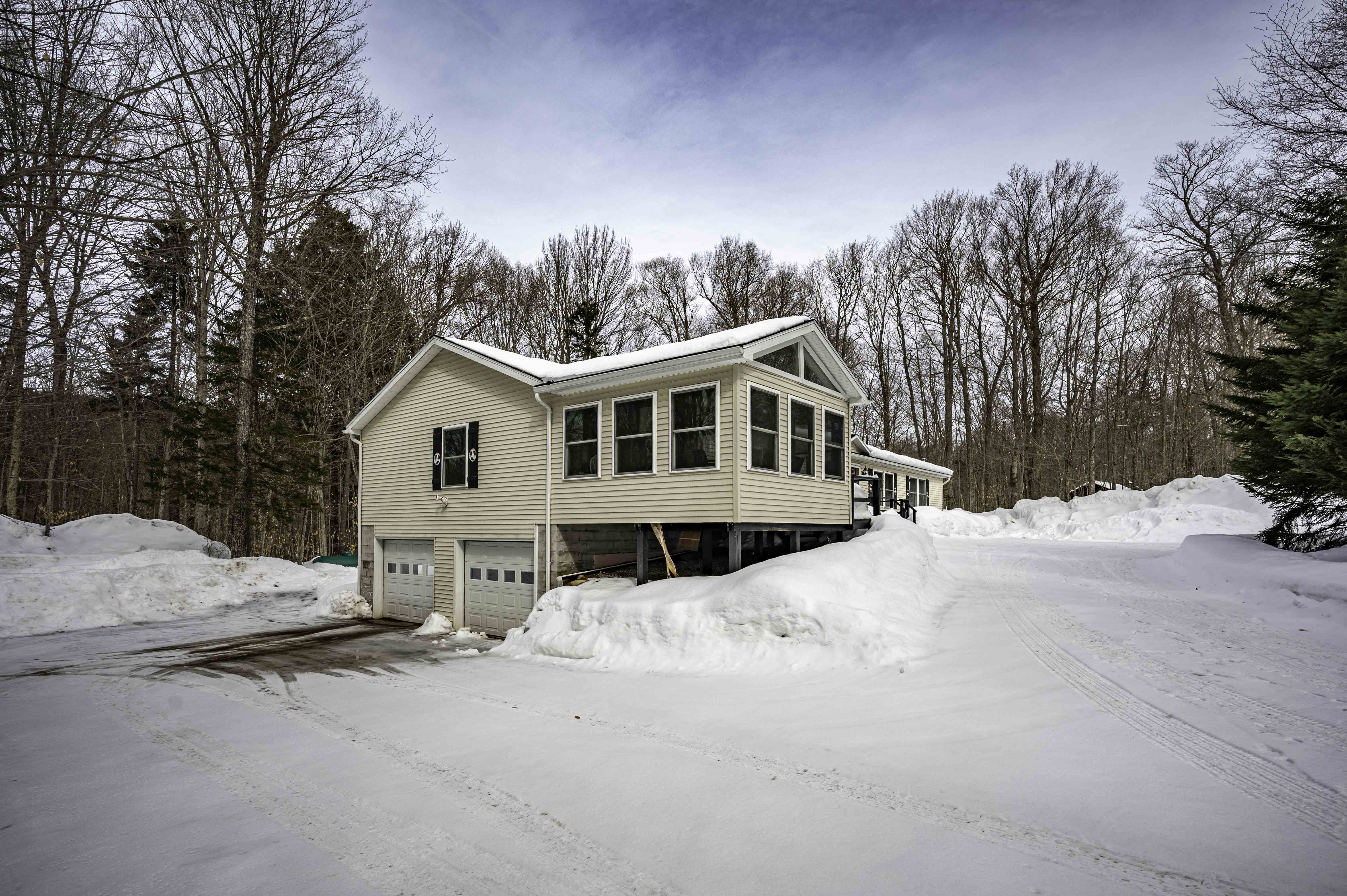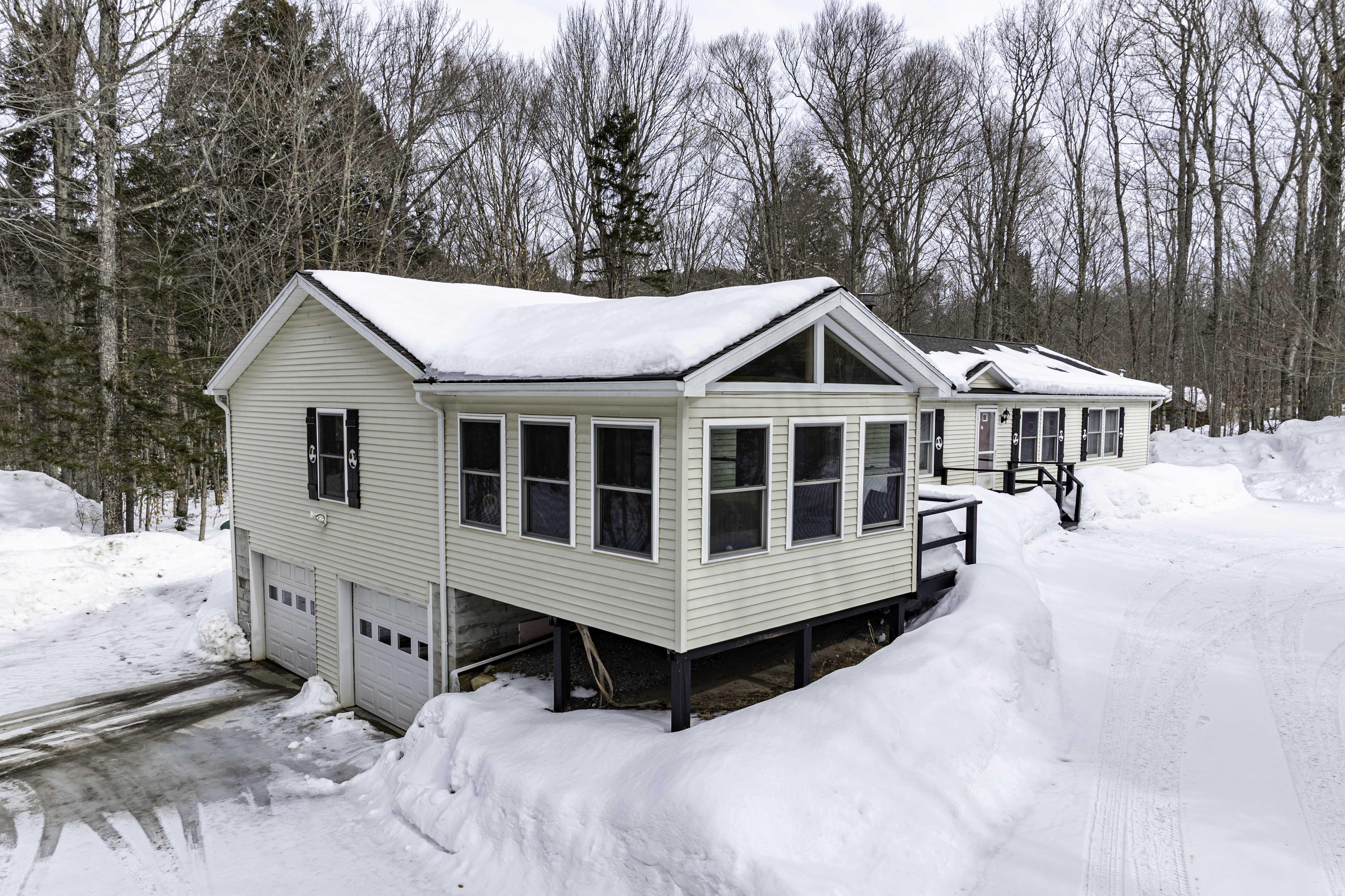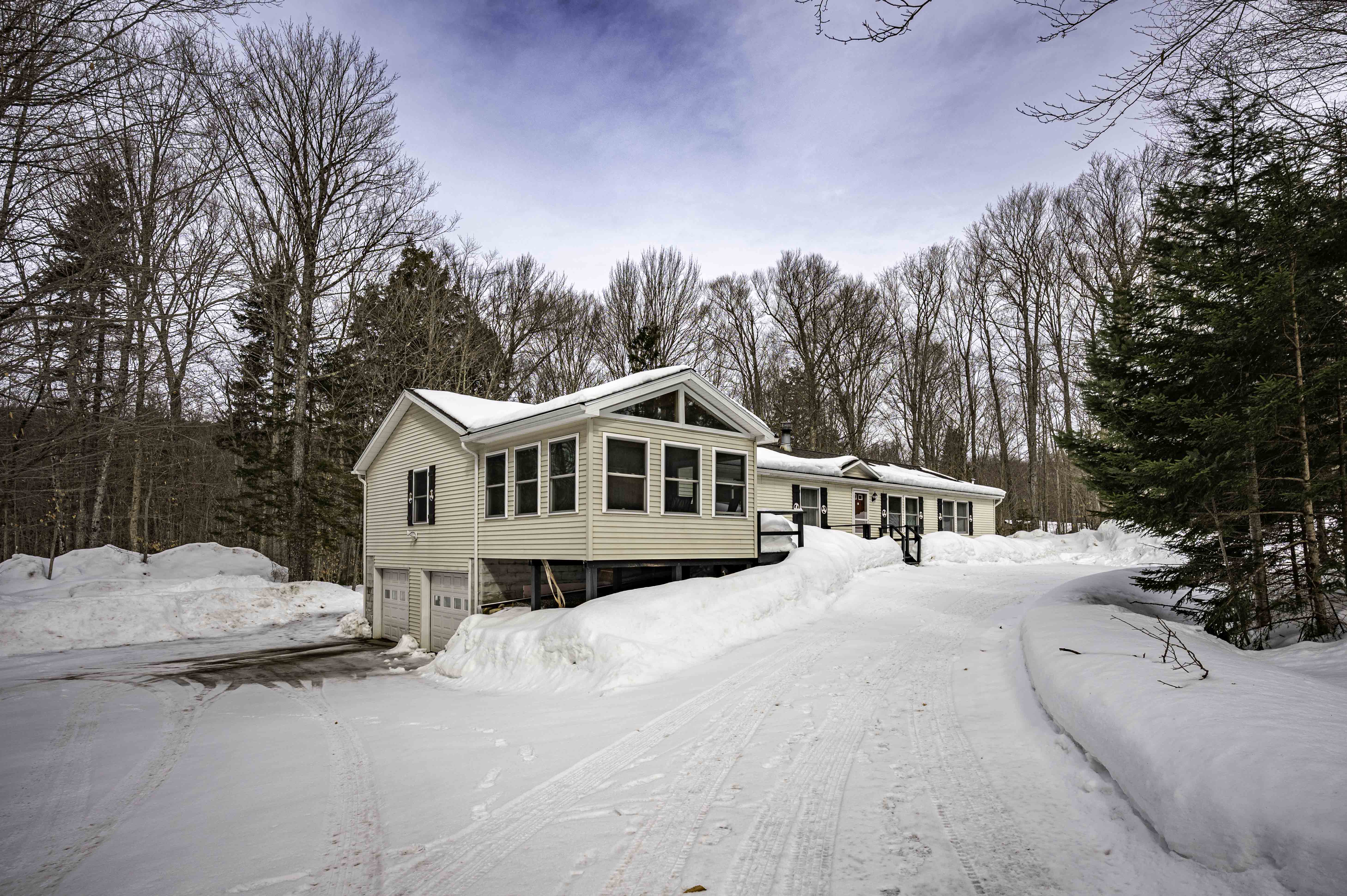 This year-round ranch sits on a private 3.6-acre wooded lot bordering New York State lands, offering exceptional privacy and direct access to the natural beauty of the Adirondacks. This year-round home features 3 bedrooms, 2 full baths, a living room with a wood-burning fireplace adjoining a spacious eat-in kitchen, and a dedicated office. A beautiful addition provides an expansive entertainment area featuring a propane fireplace and dining room. Relax on the inviting three-season porch or enjoy the peaceful wooded setting from the 8' x 32' rear deck. Additional highlights include a drilled well, hot-air heat, a full, unfinished basement, an oversized two-car garage, abundant parking, and a generator. Located in a highly desirable area for snowmobiling and just minutes from Eagle Bay and Inlet.