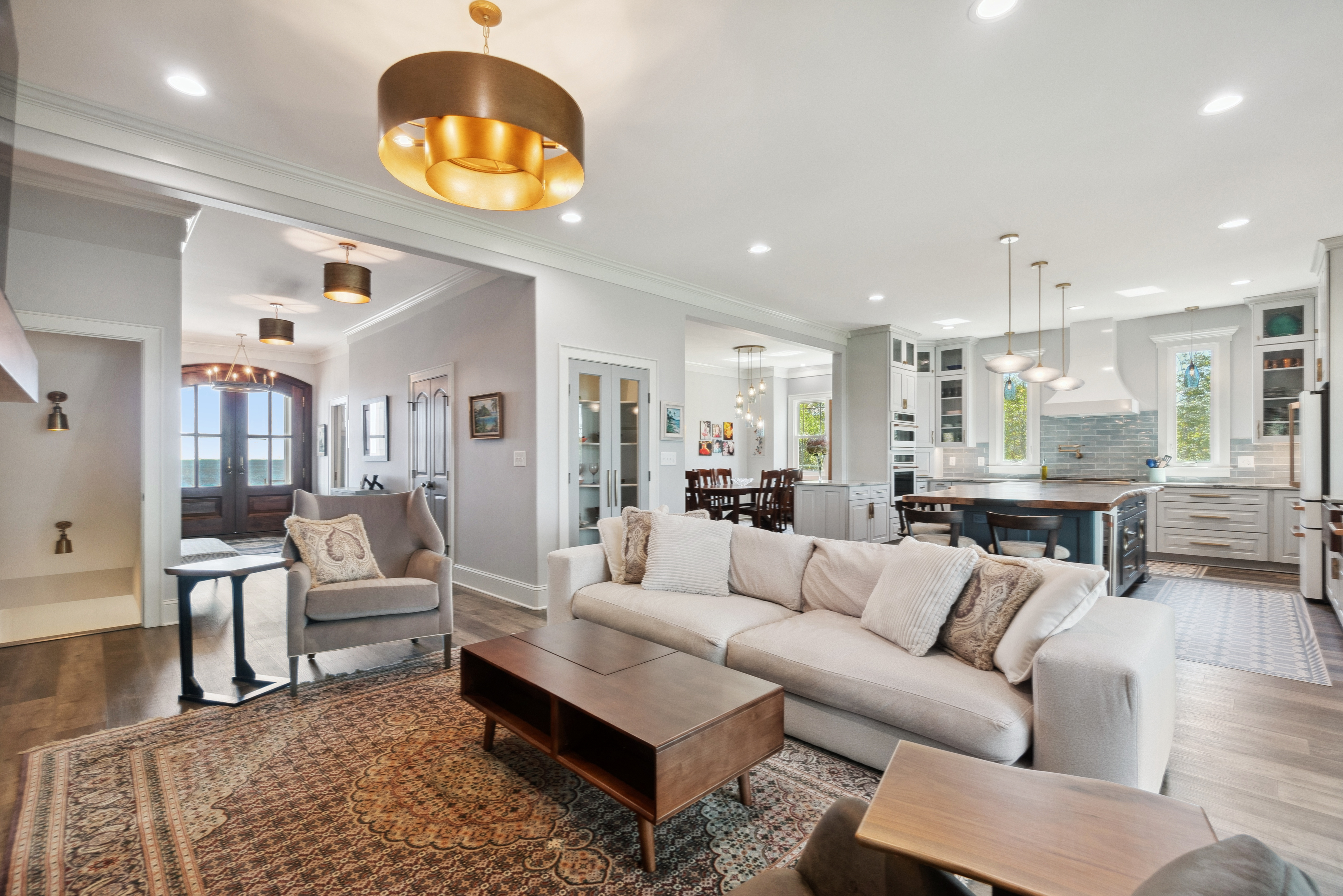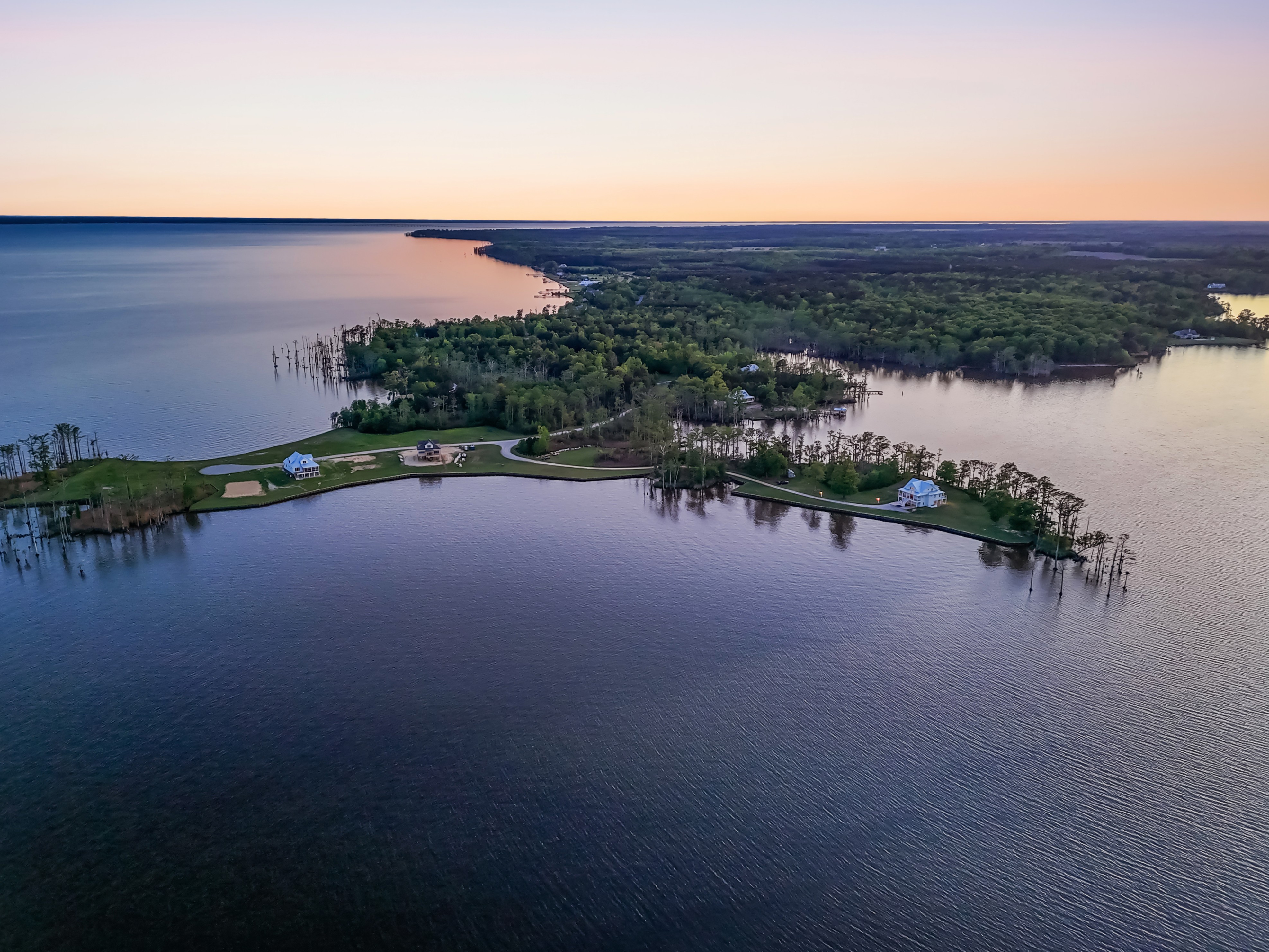 Occupying a rare 1.98-acre peninsula where the Albemarle Sound meets the Yeopim River, this extraordinary waterfront residence offers a setting unlike any other—surrounded by water on three sides and designed to capture sweeping panoramic views from every room. Completed in 2024 and presented in pristine condition, the home blends refined coastal architecture with exceptional craftsmanship and modern luxury. A tree-lined approach enhances the sense of arrival and privacy, while expansive porches and decks frame both the sunrise over the Albemarle Sound and the dramatic evening sunsets across the Yeopim River. Inside, the home unfolds through a gracious open floor plan designed for both everyday living and elegant entertaining. At its heart is a remarkable chef’s kitchen, beautifully appointed and seamlessly connected to the living area, where expansive glass doors invite the surrounding waterfront landscape indoors. A formal dining area sits nearby, offering an inviting setting for gatherings large or small. The primary suite, ideally located on the main living level, serves as a private retreat with direct access to the riverfront deck and a spa-inspired bath designed for relaxation and comfort. Upstairs, two guest suites each feature private baths, while an additional guest room and office share a third full bath—providing comfortable accommodations for family and visitors alike. The ground level offers two garage bays along with a third bay ideally suited for a golf cart or recreational equipment. Thoughtful amenities—including a dog wash, secondary laundry area, covered riverside patio, and outdoor shower—reflect the home’s careful attention to both convenience and lifestyle. Outdoor living is equally exceptional. A generous portion of the riverside deck is screened, creating an idyllic setting for dining, entertaining, or simply enjoying the warmth of the outdoor fireplace while overlooking the water. From bespoke lighting and custom-milled woodwork to carefully selected fixtures and finishes, every element of this residence reflects exceptional attention to detail and thoughtful design. Whether enjoying boating, fishing, swimming, or simply watching the changing light across the water, this remarkable property offers a rare opportunity to experience refined waterfront living in a truly unparalleled setting.