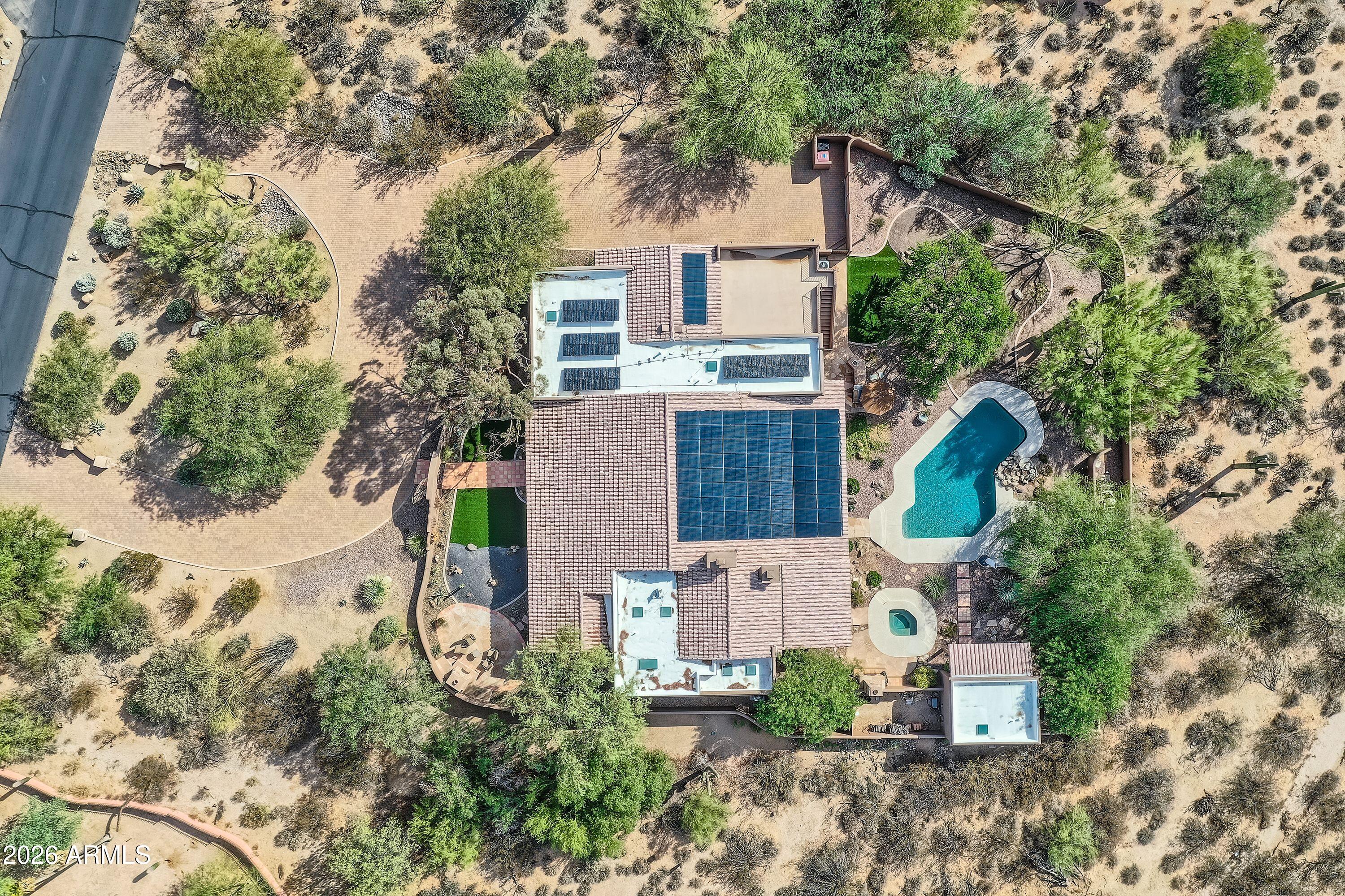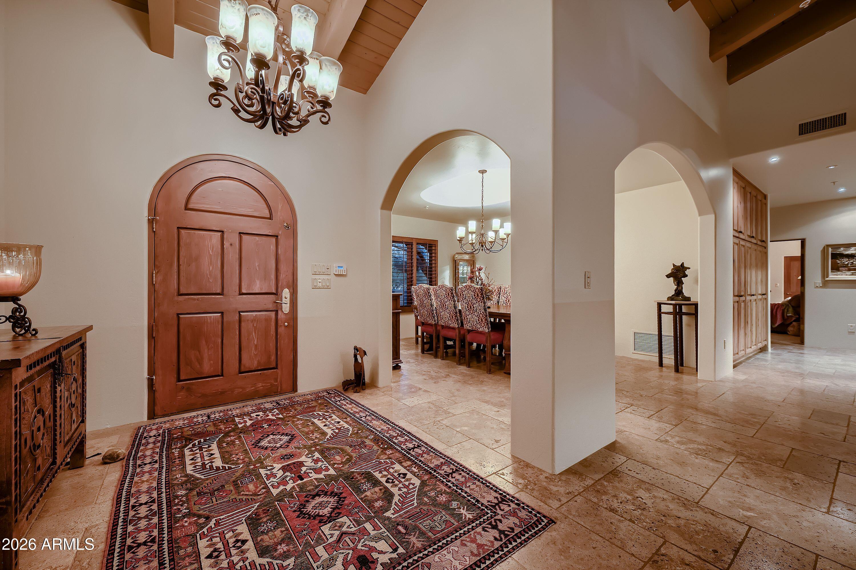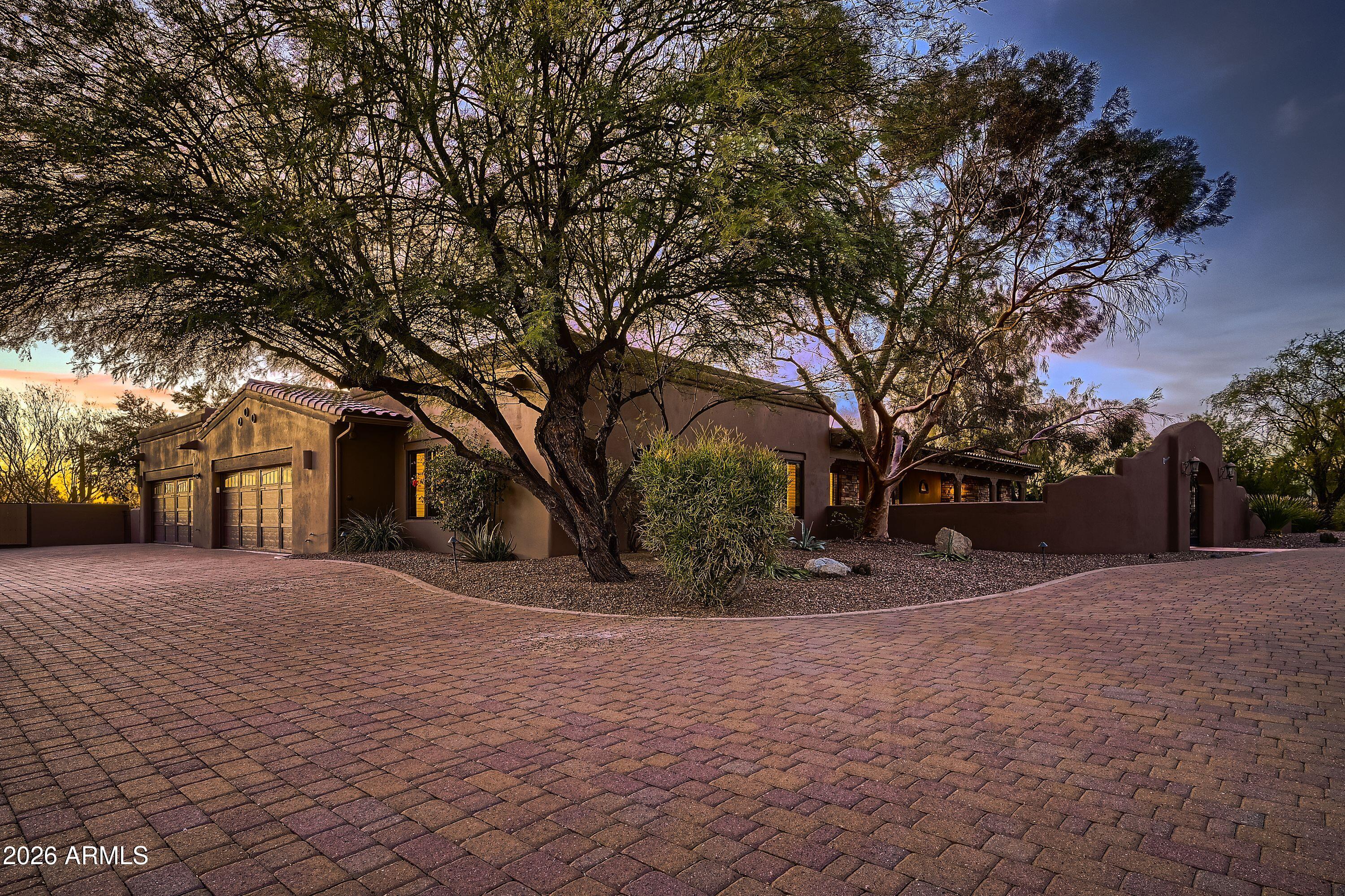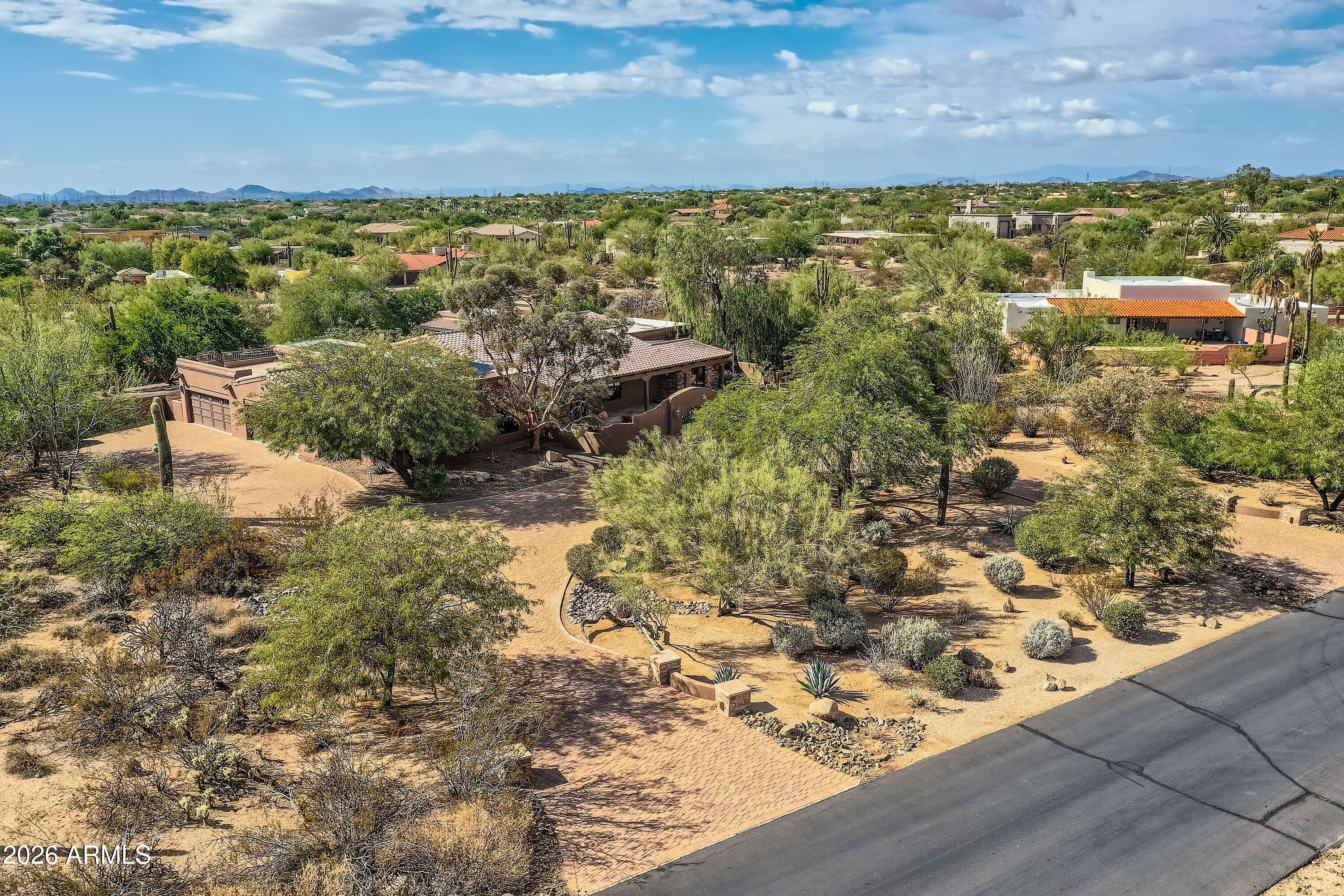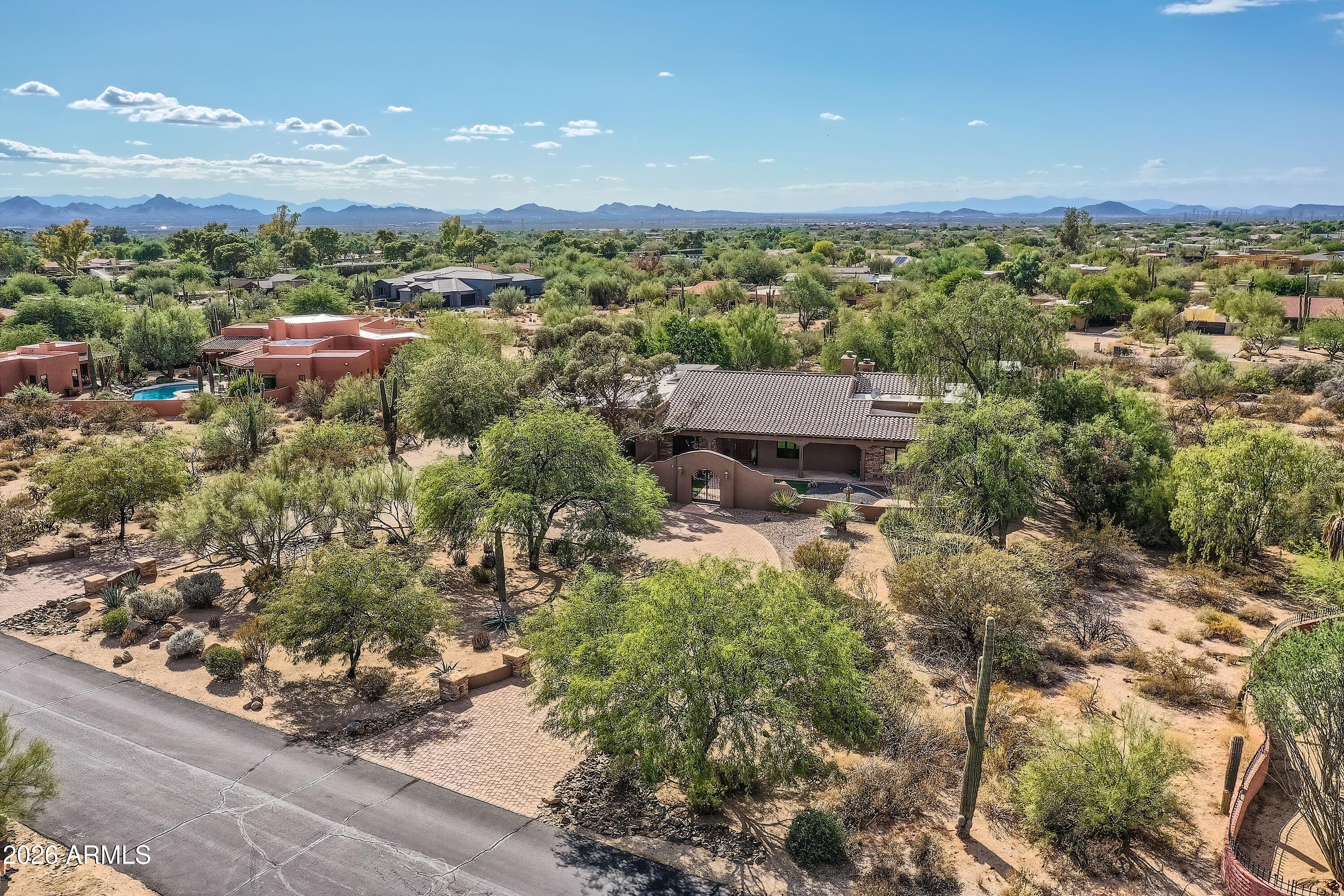 Soaring ceilings and authentic Southwestern charm set the tone the moment you enter this Scottsdale estate. Situated on 1.7 private acres in a prime location, this 4,500+ square foot residence offers five spacious bedrooms and four full bathrooms. The expansive primary suite is a true retreat, complete with its own fireplace and French doors that open directly to the spa. Just steps from the pool, the charming 307-square-foot casita provides the perfect space for guests or a private office. Architectural details shine throughout, highlighted by a striking stone fireplace that anchors the main living area. The warm and inviting library/den offers a cozy escape, ideal for quiet evenings or working from home. Owned solar panels mean minimal electric bills, while the circular driveway and temperature-controlled four-car garage provide both functionality and impressive curb appeal. Enjoy breathtaking Arizona sunsets from the private front courtyard fireplace or take in panoramic 360-degree views from the view deck. Move in and enjoy it as it is, or update to reflect your personal style - the possibilities are endless.