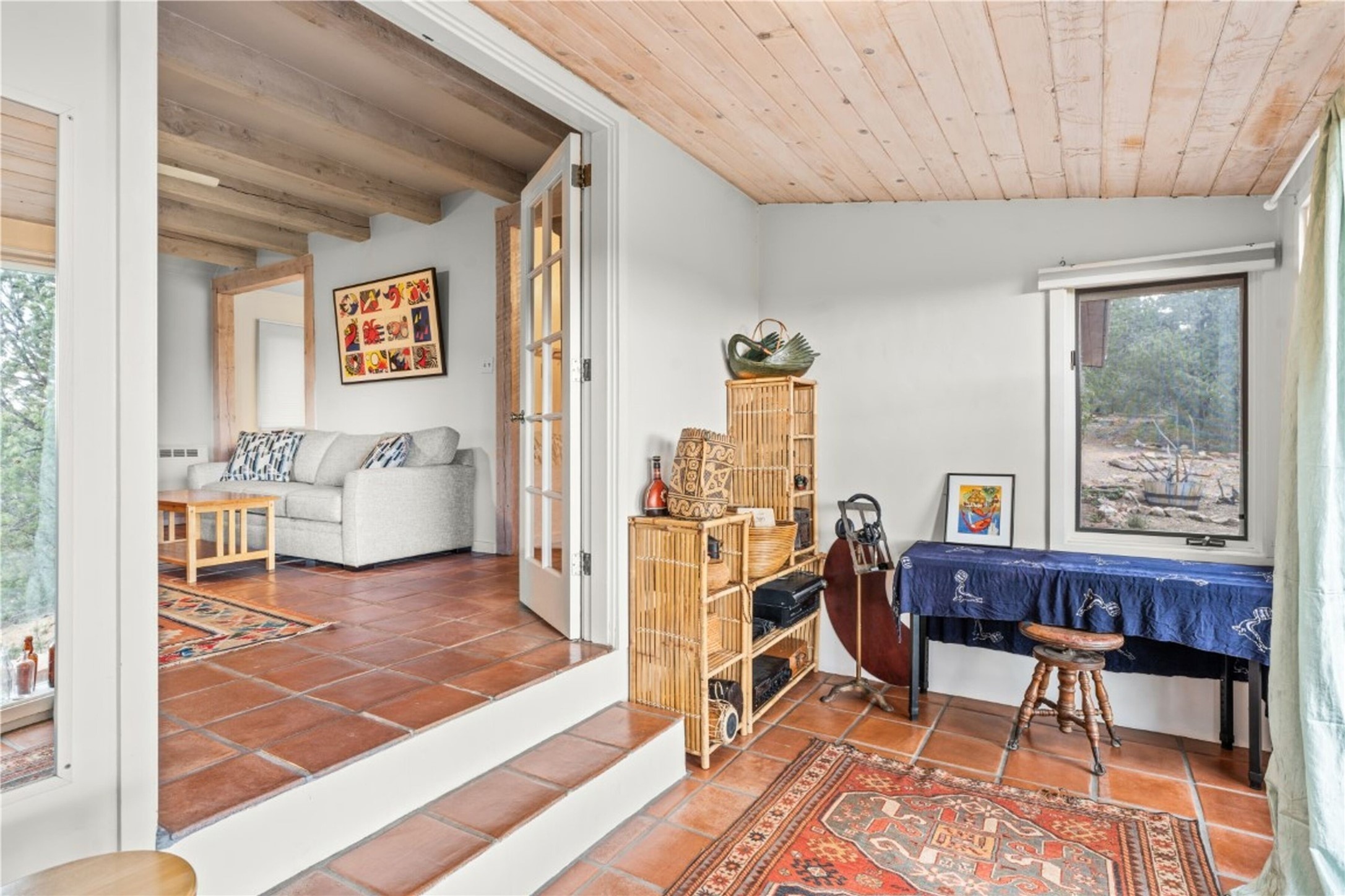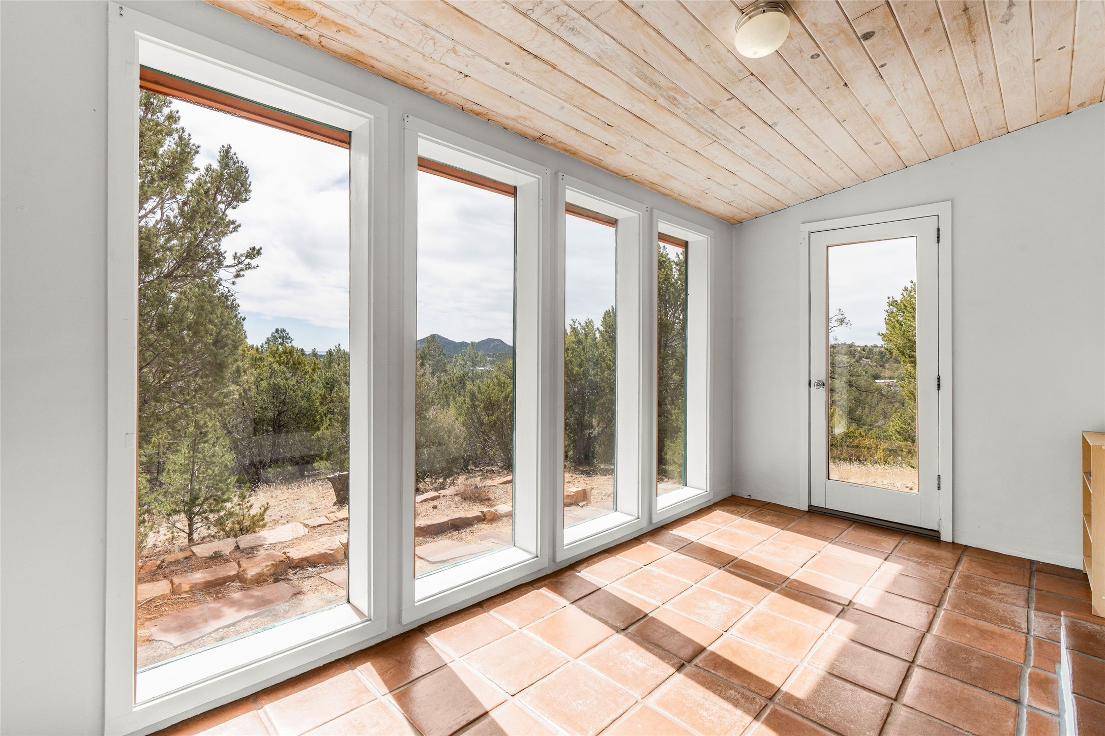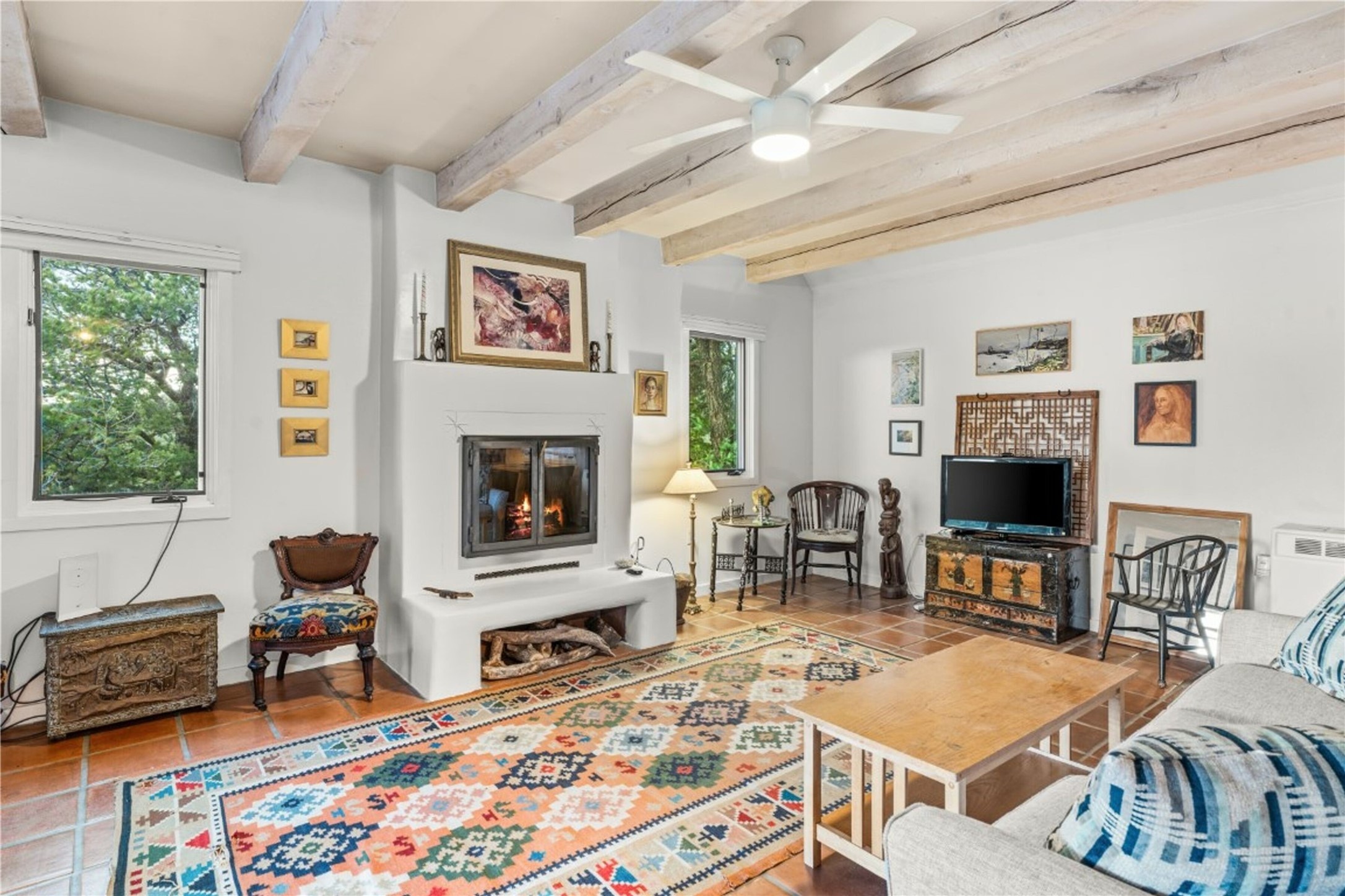 Nestled among the quiet hills of Cañada de los Alamos, this tranquil 1-bedroom, 1-bathroom retreat sits atop 5 private acres overlooking a sweeping green valley of ponderosa pines and juniper, with Cerros Negros rising softly in the distance. Positioned to take in both light and long views, the 1,138-square-foot home opens with a charming living room centered around a cozy wood-burning fireplace—the heart of the space. Step down into the sun-drenched bonus room, an inviting space perfect for morning coffee, an afternoon read, or a peaceful work-from-home hideaway. Thoughtful storage is found throughout, including a usable attic and a standalone shed. The pitched roof features a solar hot water panel that helps support energy-efficient water heating. Outside, the property is defined by quiet and natural beauty—the soft wind moving through the forest, wildlife passing by, and clear night skies stretching overhead. Though wonderfully secluded, the home sits just about 25 minutes from the Plaza, offering a rare balance of mountain-retreat living with convenient access to Santa Fe’s amenities and nearby National Forest trails. A calming high-desert getaway with space, privacy, and possibility—ready for its next owner to make it their own.