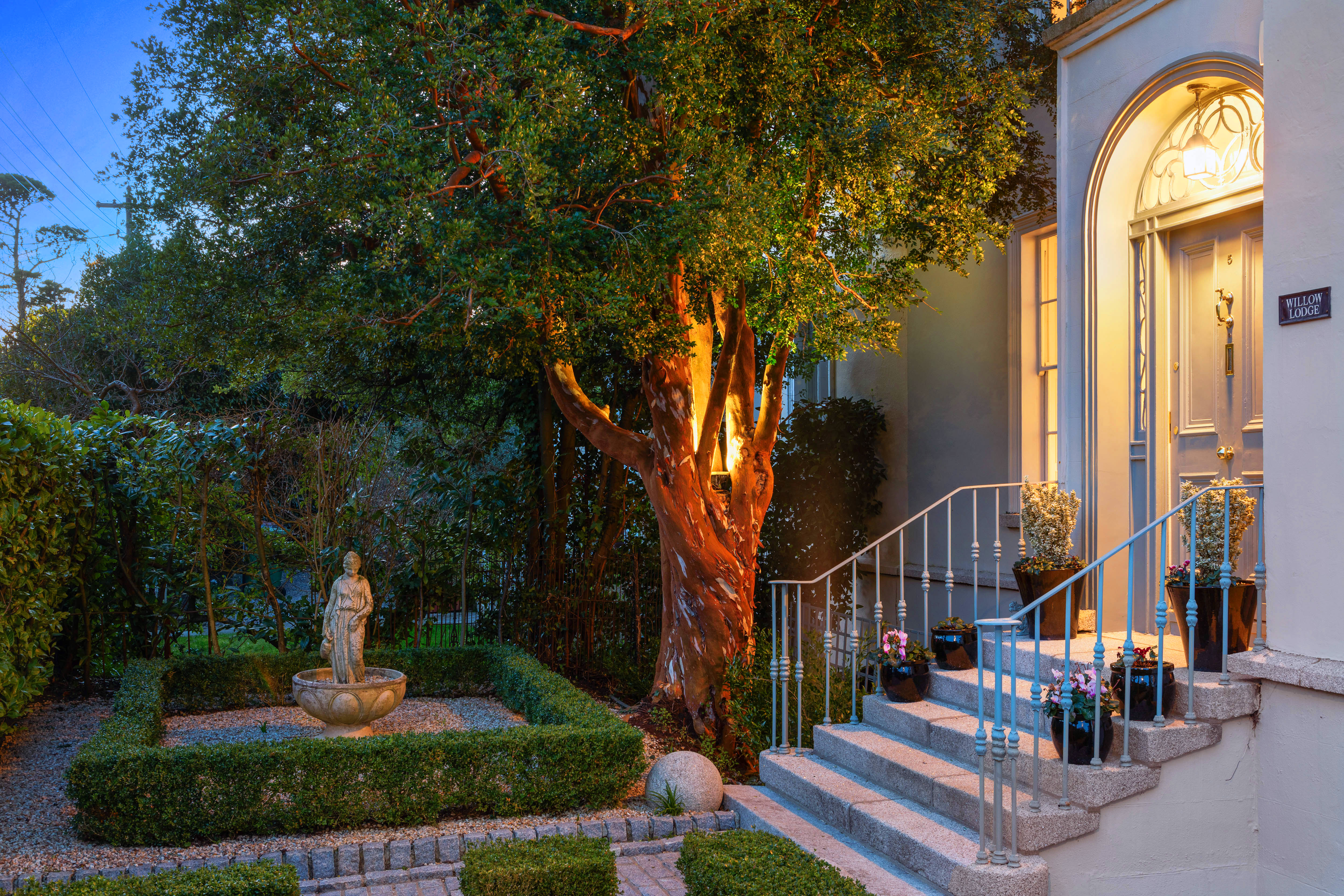 To the front and side, the property is accessed via wrought iron double gates leading to a large gravelled parking area offering space for multiple vehicles - a rare and valuable feature for a period home of this calibre. The front garden features a specimen Myrtle tree, box hedging and a granite cobble stone pedestrian path leading to the front door. The overall setting combines privacy, maturity and practicality in equal measure.