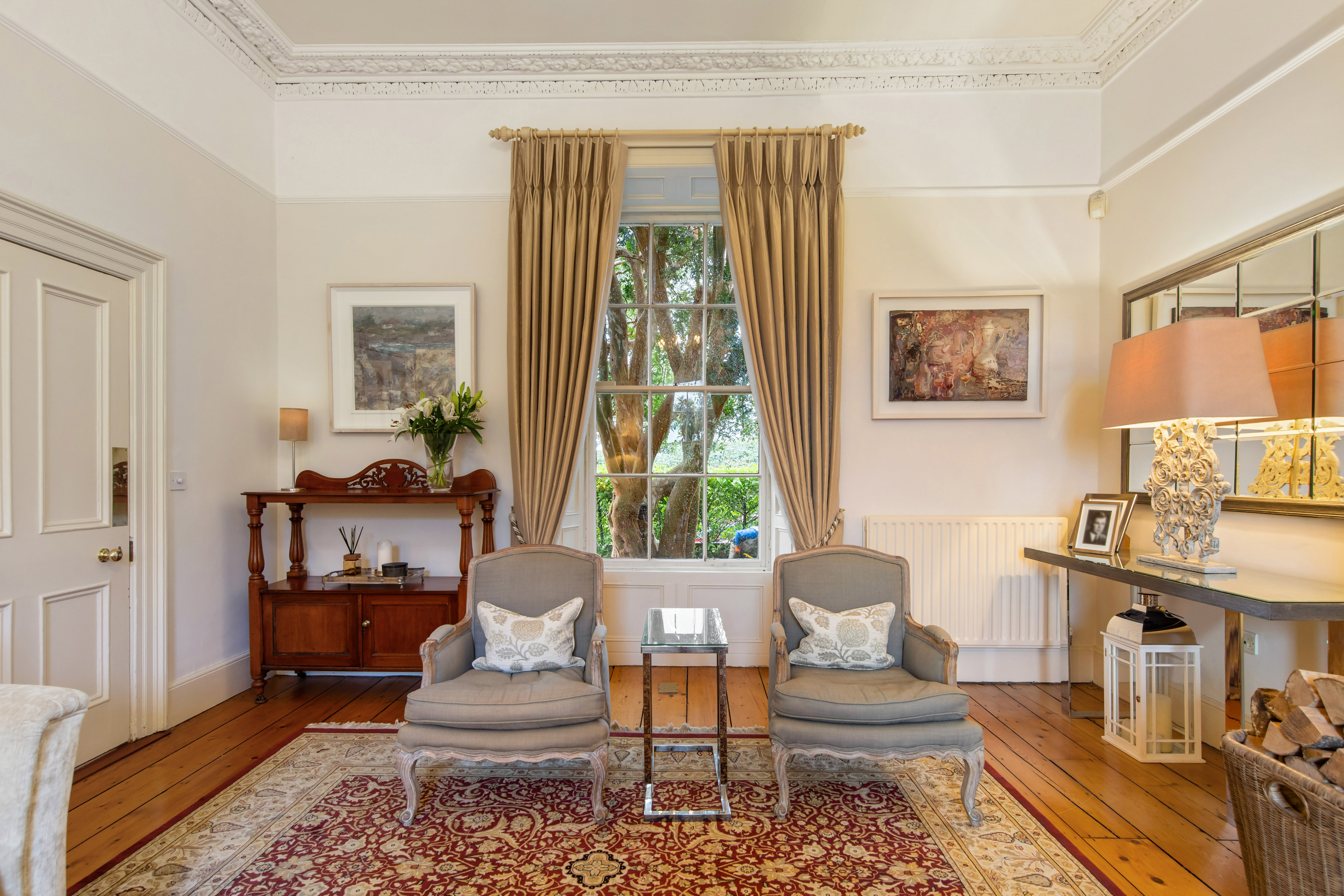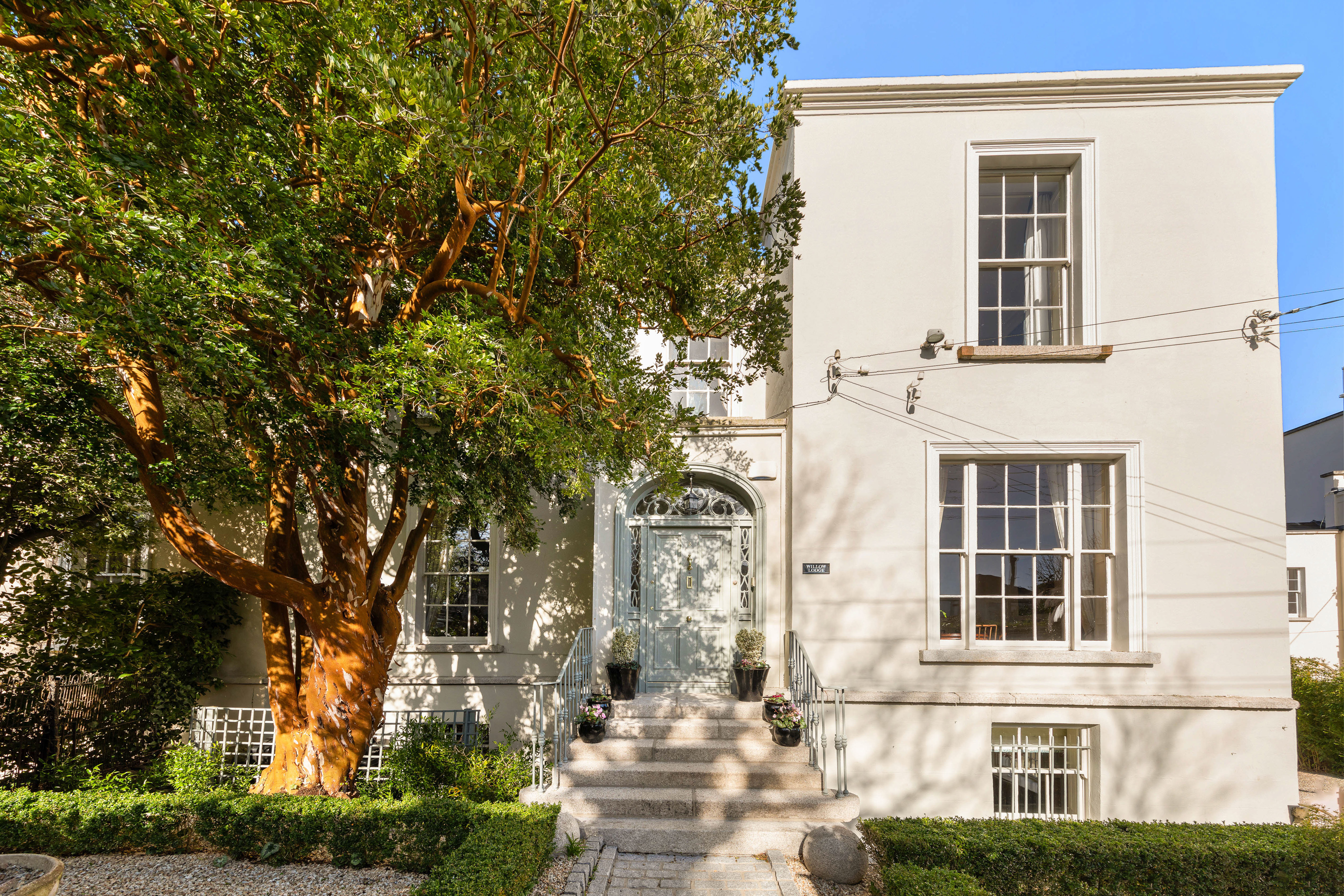 Willow Lodge is a distinguished Regency residence of notable scale and presence, occupying an elevated position on one of Monkstown’s most discreet and sought-after residential roads. Extending to approximately 4,000 sq.ft. (372 sq.m) and set on a c. 0.25 acre site, the house enjoys commanding views to the rear across the rooftops of Monkstown, taking in Monkstown Parish Church and unfolding towards Dublin Bay. Presented in excellent decorative order throughout, the property offers a rare and carefully judged balance between elegant reception spaces and generous bedroom accommodation, creating a home that is as suited to refined entertaining as it is to everyday family life.