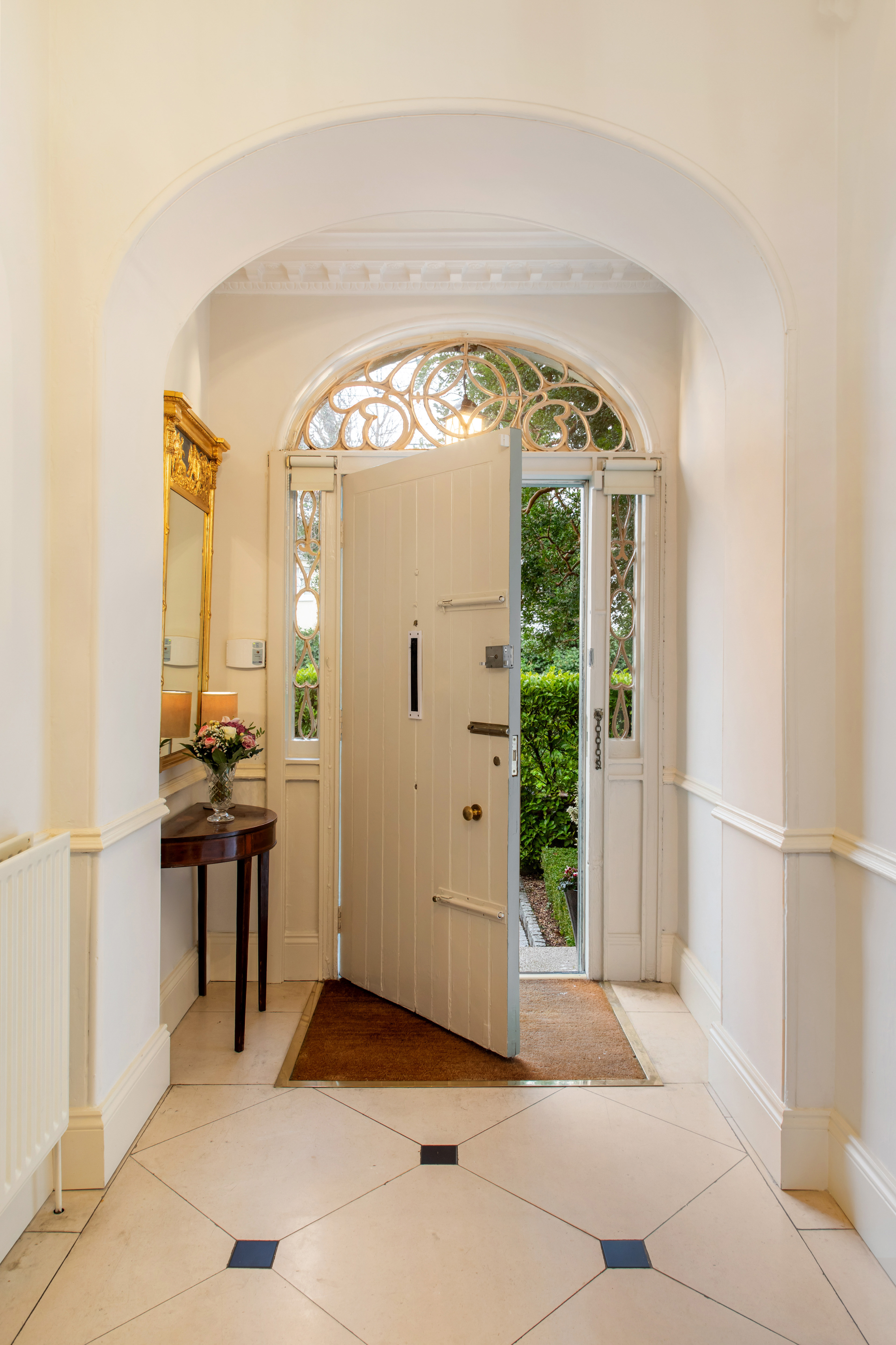 The house is approached through a fine entrance hallway, immediately setting the tone with its marble tiled floor, ornate ceiling coving and centre rose, feature archway and an elegant fanlight above the front door. From here, French doors lead, via a short flight of steps, directly to the rear garden, establishing a strong connection between the principal living spaces and the outdoors. Flanking the hallway are two superb formal reception rooms. The drawing room is a beautifully proportioned, dual-aspect space, flooded with natural light through sliding sash windows with working shutters to both front and rear. Original wide plank floorboards, intricate ceiling detailing and a striking marble chimneypiece combine to create a room of real presence and warmth. Opposite, the dining room is equally impressive, centred around an elegant Adam-style marble fireplace and offering a gracious setting for formal dining and entertaining. To the rear of the house lies a refined study/library, a calm and contemplative space with panelled walls and ceiling, bespoke shelving and elevated views over the garden and the surrounding rooftops, with Monkstown Parish Church forming a particularly attractive focal point.