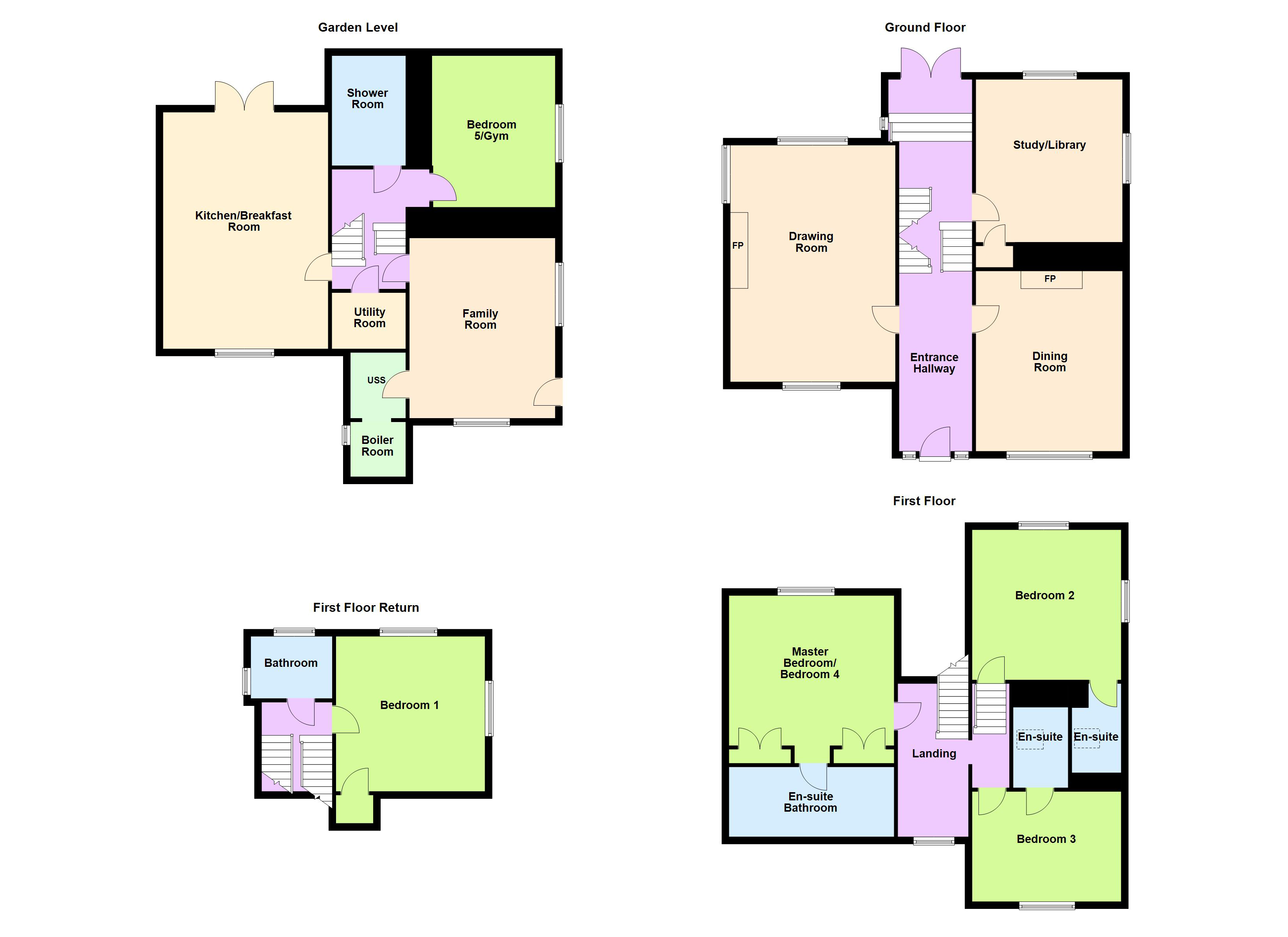 At garden level, the house opens into a superb kitchen/breakfast room, thoughtfully designed around a substantial feature island and anchored by a gas-fired, four-oven AGA. French doors open directly onto the rear garden, enhancing the sense of flow between inside and out. This level also incorporates a comfortable family room, utility room, a fifth bedroom, and a beautifully finished shower room, creating a highly functional and flexible living environment ideal for modern family life.