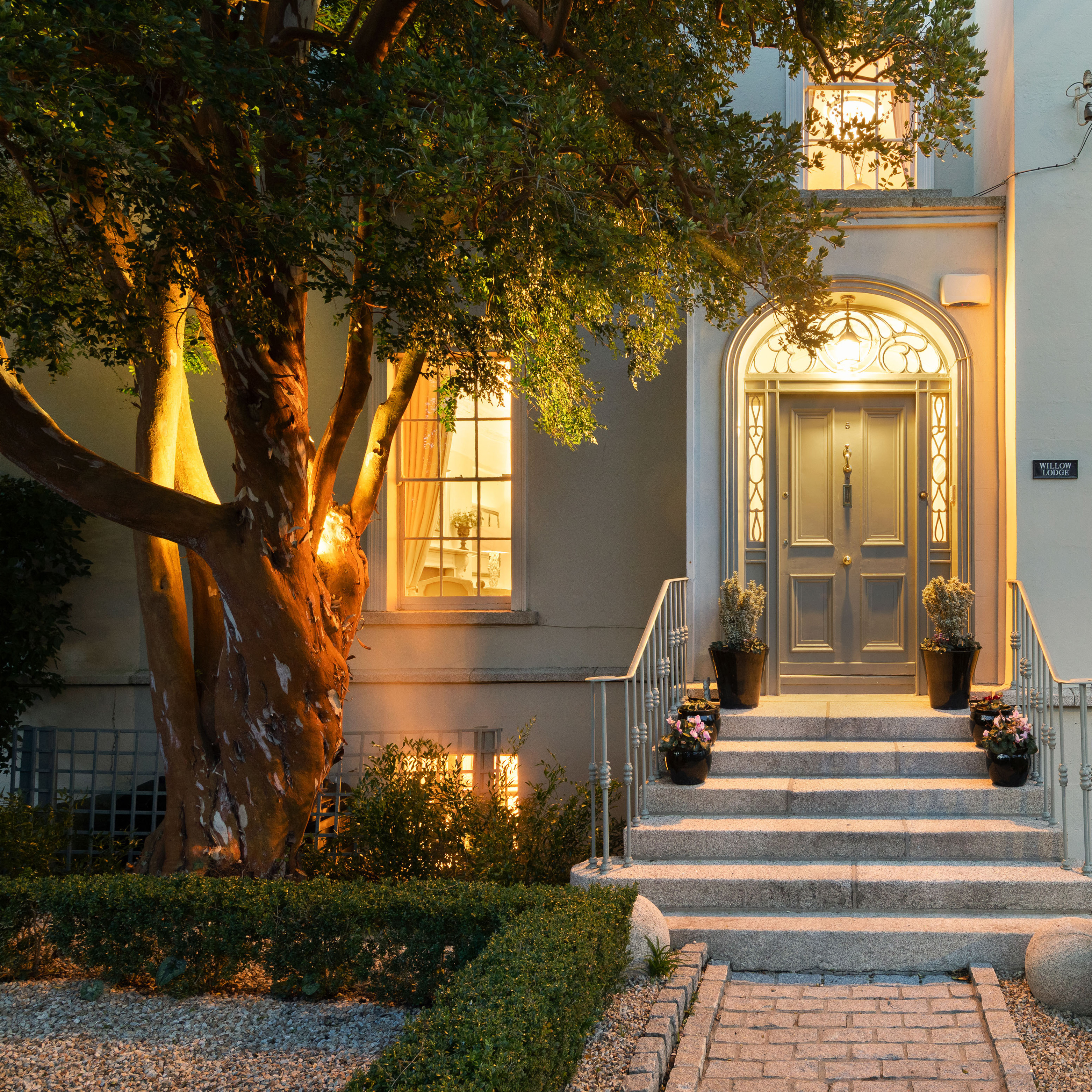 Willow Lodge stands on approximately 0.25 acre of mature and thoughtfully landscaped gardens. To the rear, an expansive Indian sandstone patio extends across the width of the house, providing an ideal setting for outdoor dining and entertaining. Raised granite walls frame a variety of mature shrubs, trees and planting, while beyond lies a generous lawned area leading to a large garden shed and breakfast patio, there is a further sunken patio bordered by olive trees which is perfectly positioned as a sheltered suntrap.