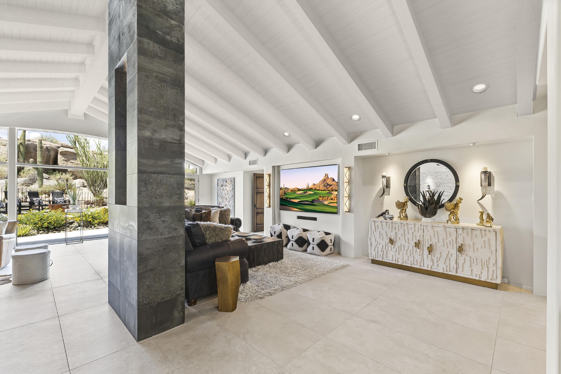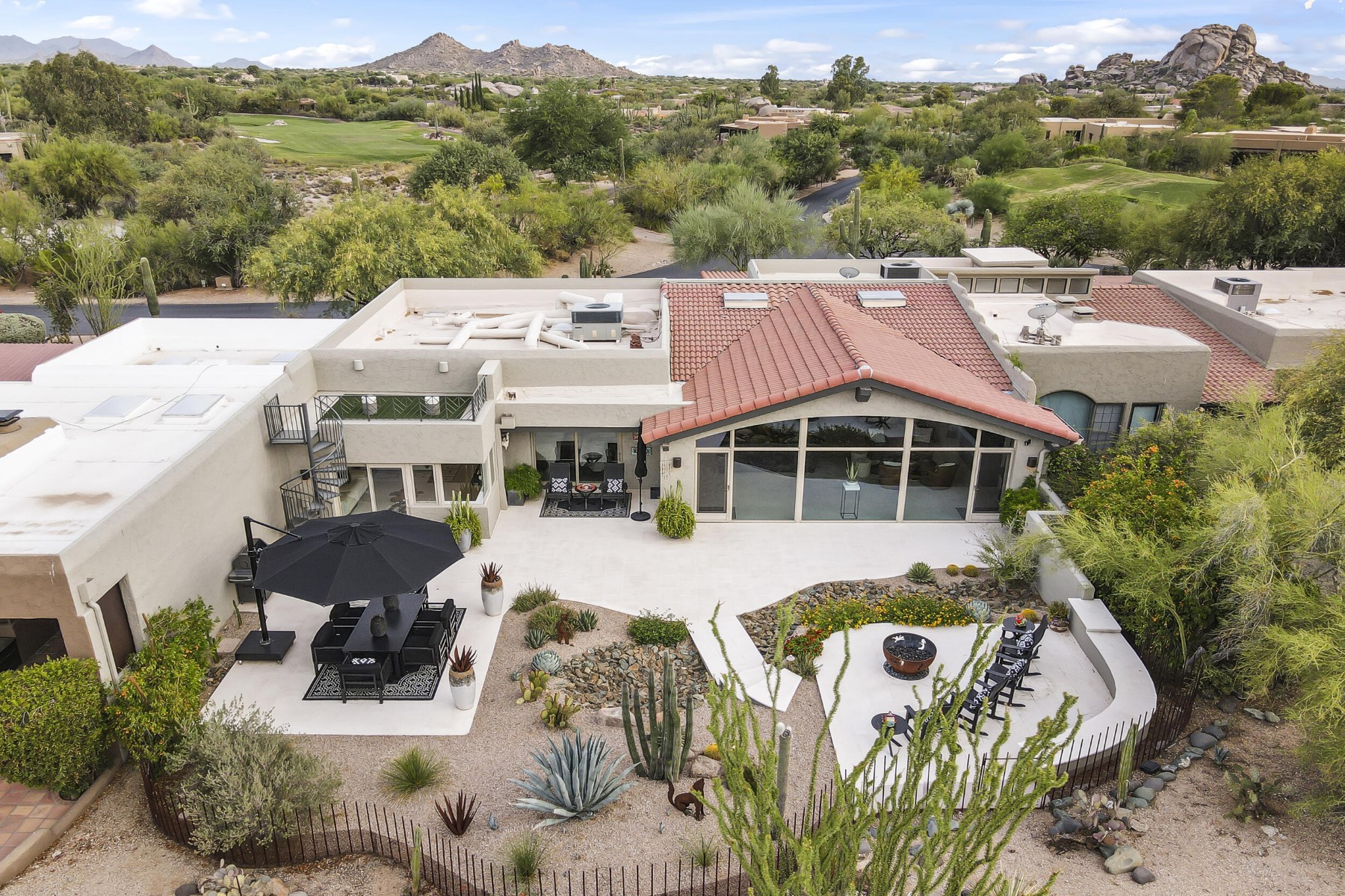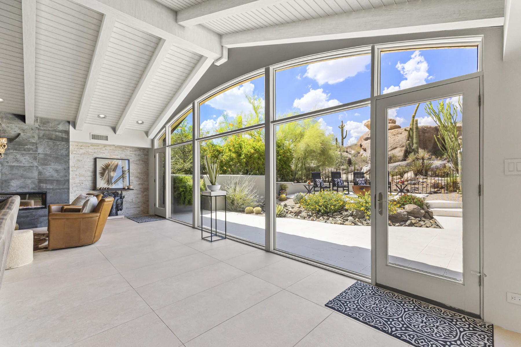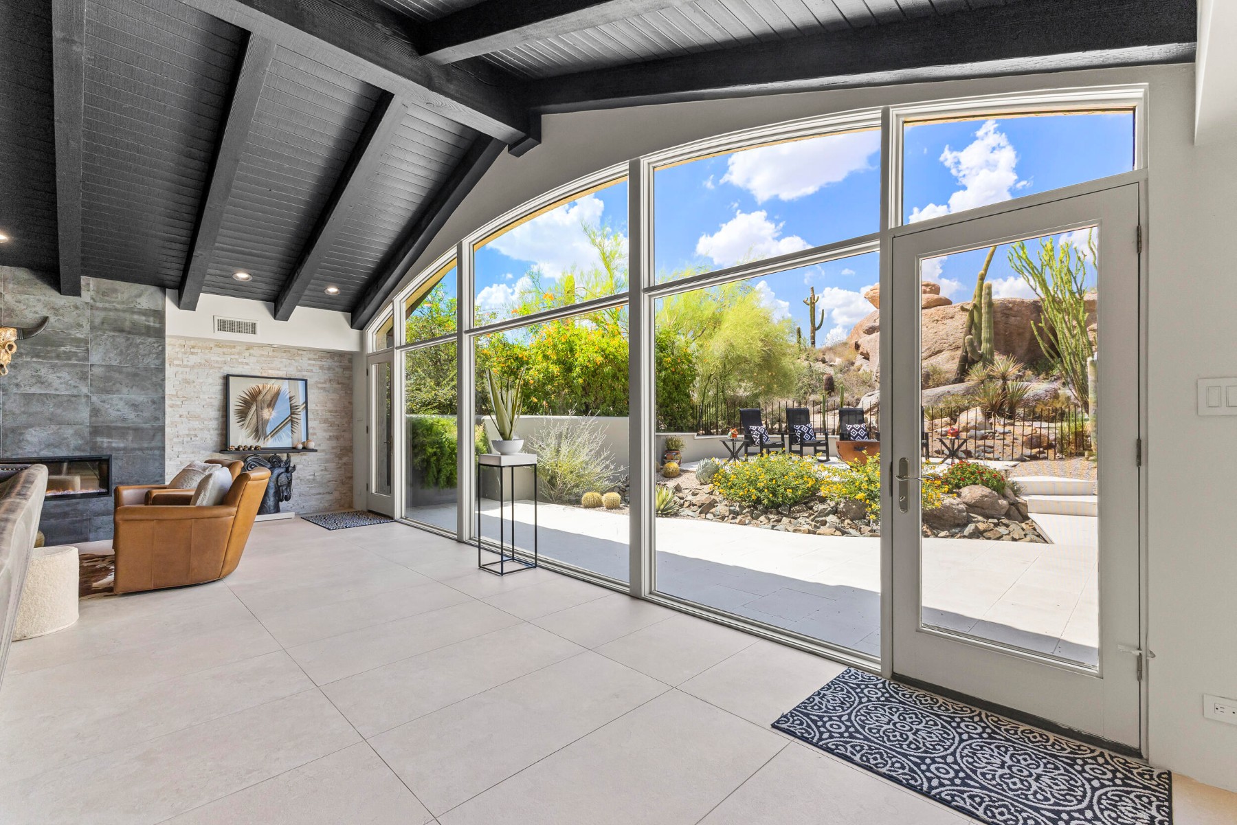 Recently featured on The American Dream, this fully renovated Desert Contemporary retreat is set within one of the most breathtaking and tranquil settings in Scottsdale's world-renowned community, The Boulders. Surrounded by iconic granite formations and the natural beauty of the Sonoran Desert, the home offers a rare blend of timeless architecture and modern luxury. Built with durable materials like copper service lines and modernized over time, this residence offers updated plumbing, gas, and electrical systems, smart features, high-end finishes, and a move-in-ready experience for today's buyer. Inside, soaring glass walls frame dramatic boulder outcroppings and expansive desert vistas while filling the home with natural light. The open-concept floor plan flows seamlessly from the designer kitchen to the spacious great room, creating an inviting environment ideal for both relaxed living and sophisticated entertaining without one step. Luxury details are found throughout, including oversized stone tile flooring, sleek floating cabinetry, and beautifully appointed designer bathrooms with custom tilework. Every space has been curated to reflect a refined Modern Desert aesthetic that complements the surrounding landscape. Step outside to a serene backyard retreat and private observation deck, where spectacular sunsets, peaceful desert mornings, and brilliant stargazing create a true resort-style experience. This home can be purchased fully furnished with designer pieces specifically selected for the home, this single-level residence presents an exceptional turn-key opportunity or luxury lock-and-leave. Just a short two-minute walk to the community pool and moments from The Boulders' renowned resort amenities, including championship golf, world-class spa, fine dining, tennis, and miles of scenic desert trails. A rare opportunity to own a thoughtfully updated desert sanctuary where natural beauty, modern comfort, and resort living come together effortlessly.
