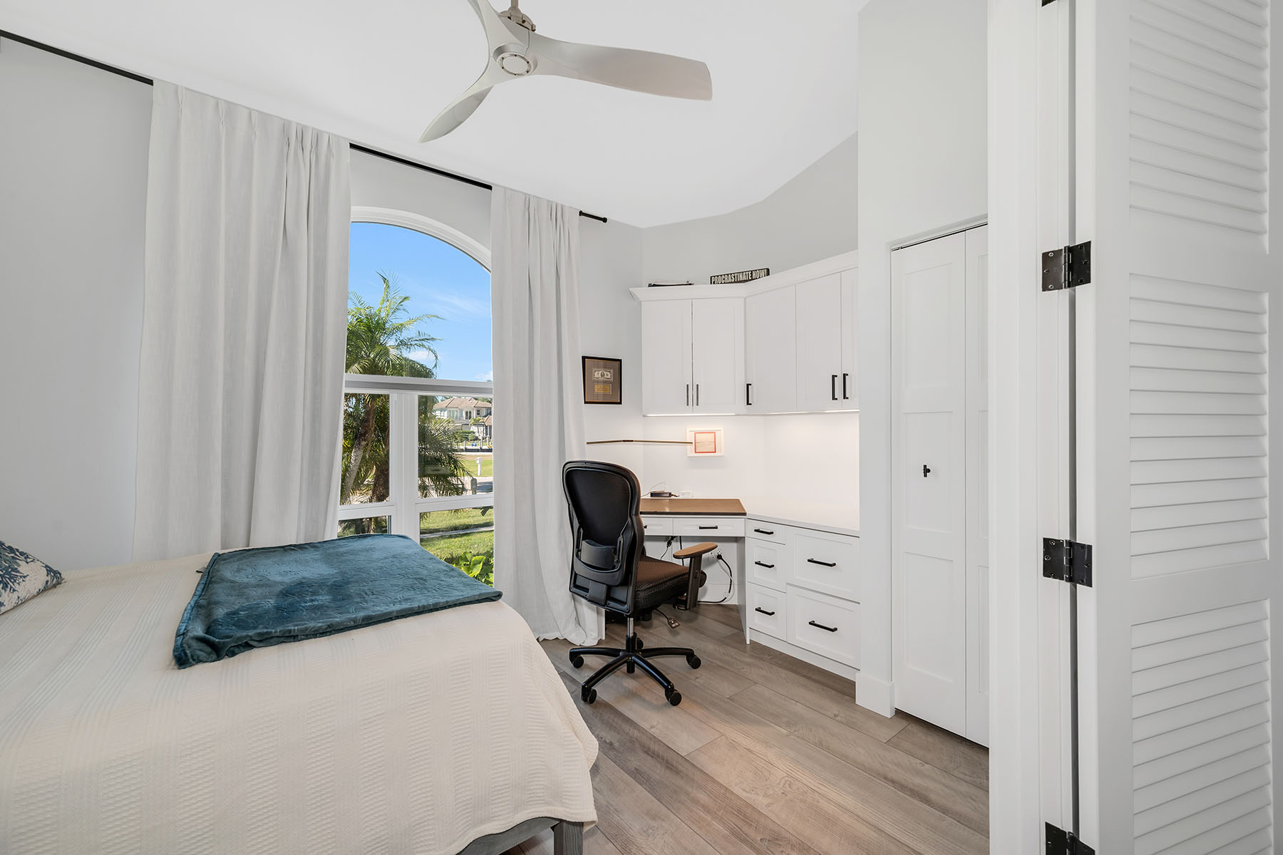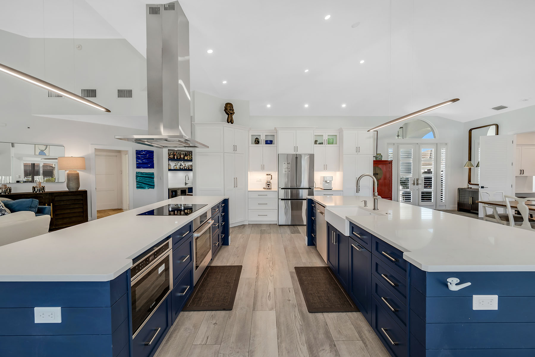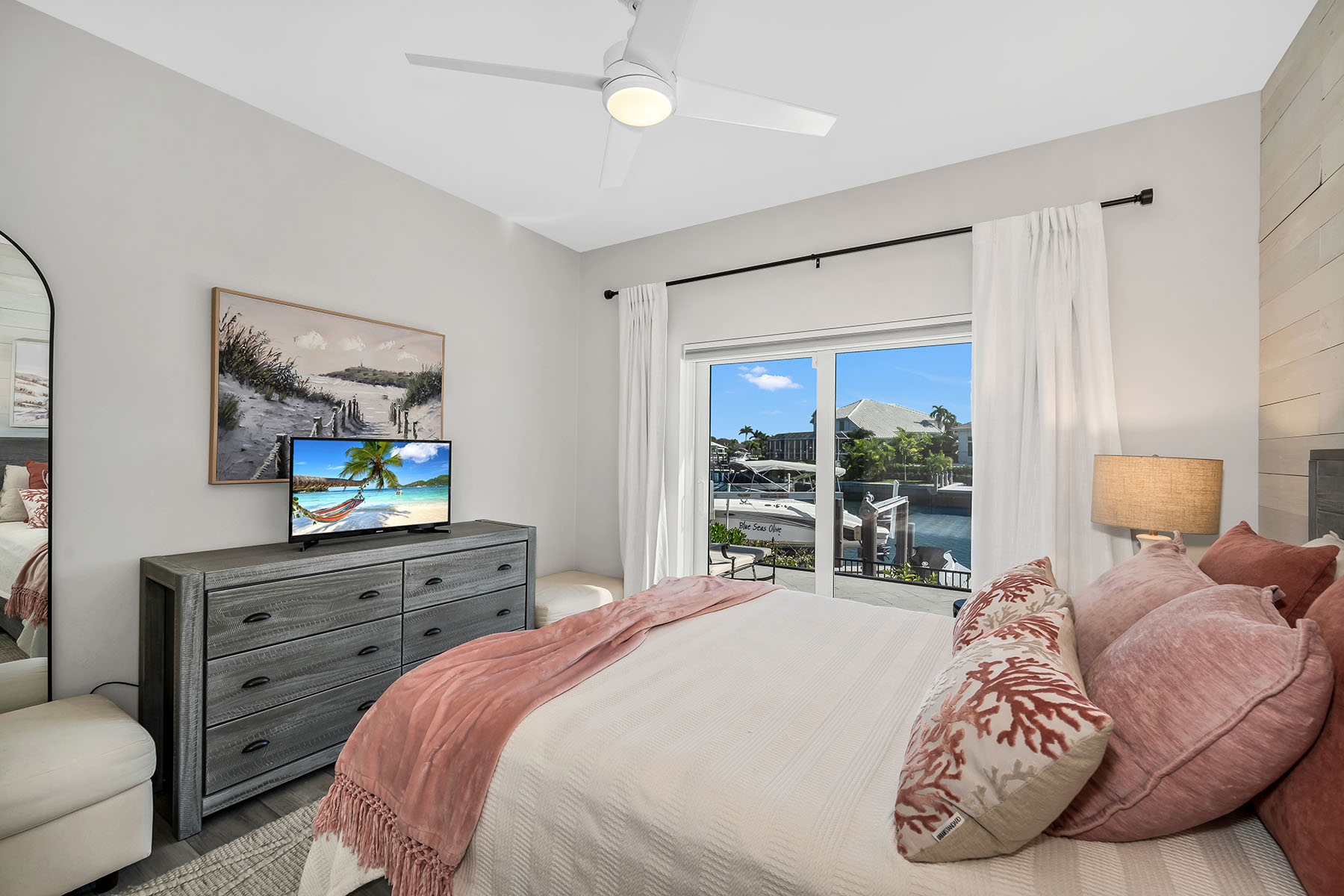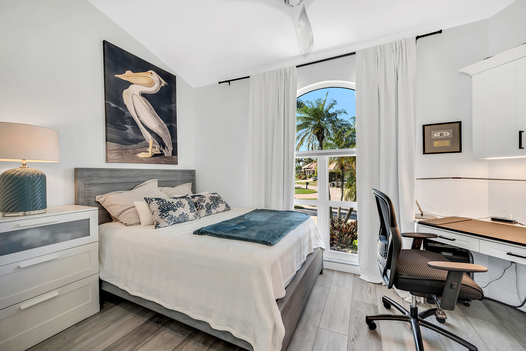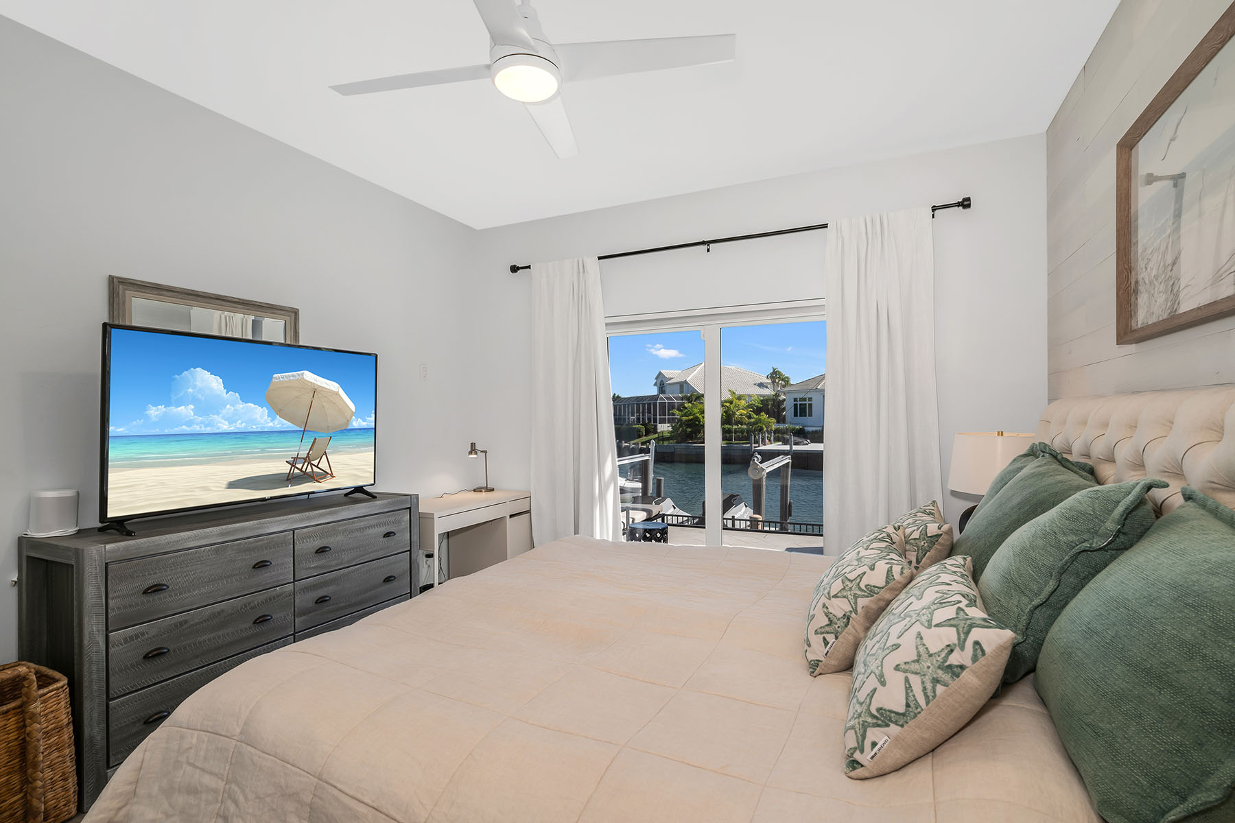 This furnished waterfront retreat is positioned on a fabulous large tip lot on a beautiful cul-de-sac, offering amazing sunrises and sunsets, exceptional privacy, and 163 feet of private seawall. With highly sought-after southern exposure, the pool and outdoor living areas enjoy sun throughout the day. Gulf access, a private dock with boat lift and jet ski lift, close proximity to Marco Island's white-sand beaches, and excellent rental potential make this property as compelling as it is livable. Completely remodeled in 2022, the home blends modern coastal style with exceptional functionality. The thoughtfully designed floor plan offers four bedrooms, three baths, and a two-car garage, wrapped beneath a tile roof. A French glass door entry welcomes you into a light-filled interior enhanced by soaring ceilings, a bright white palette, recessed lighting, ceiling fans, and vinyl flooring that complements the relaxed coastal setting. Impact-resistant doors and windows, along with electric storm shutters, provide added peace of mind. The kitchen is a standout, capturing sweeping water views and effortless access to the screened lanai through a glass slider. Designed for both everyday living and entertaining, it features white shaker-style cabinetry with under-cabinet lighting, a pantry, newer stainless steel appliances installed between 2020 and 2022, and double islands, including a four-seater island that creates generous prep, storage, and gathering space. The open layout allows the kitchen to flow seamlessly into the main living areas while maintaining clear sightlines to the water. The adjacent living room continues the open, airy feel with panoramic water views, glass slider to the lanai, and a nearby wet bar. The primary suite is a private retreat with pool and wide water views, offering direct lanai access through a glass slider, a tray ceiling, and a walk-in closet. The ensuite bath is well-appointed with a double vanity, white shaker-style cabinetry, a walk-in shower with a frameless glass enclosure and floor-to-ceiling tile, a soaking tub, and a separate water closet. The first guest bedroom features a double-door entry and is privately positioned near a nearby guest bath with a frameless glass walk-in shower and floor-to-ceiling tile. Two more guest bedrooms both offer glass sliders to the screened lanai, allowing guests to enjoy effortless access to the outdoor living space. A nearby guest bath includes a walk-in shower with glass enclosure, floor-to-ceiling tile, and a glass door leading directly to the lanai, ideal for poolside convenience. A dedicated laundry room includes a newer LG washer and dryer (both 2022). Outdoor living takes center stage on the screened lanai, where a heated pool and spa overlook expansive water views, creating a private setting to relax after a day on the water. With Gulf access just moments away, this home offers a refined yet relaxed island lifestyle defined by boating, sunshine, and serene waterfront living.