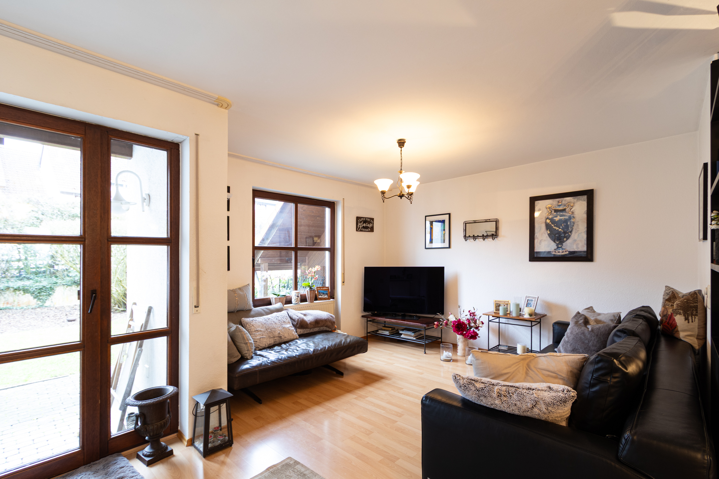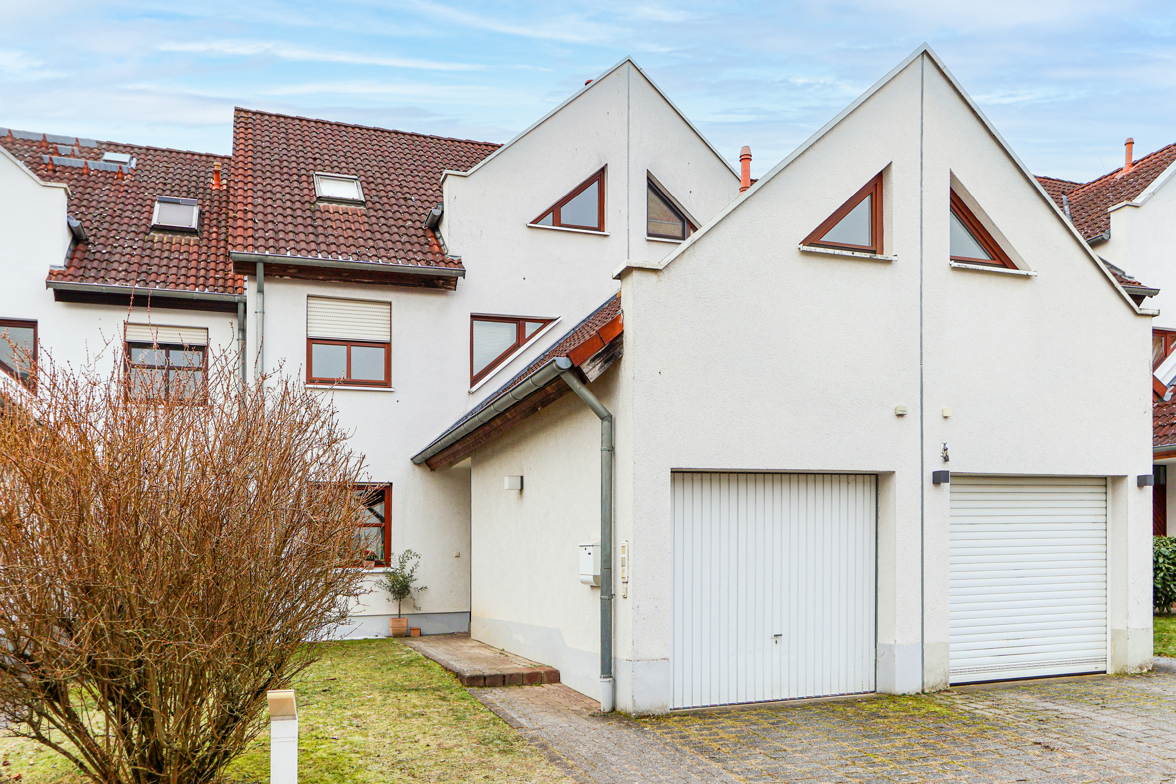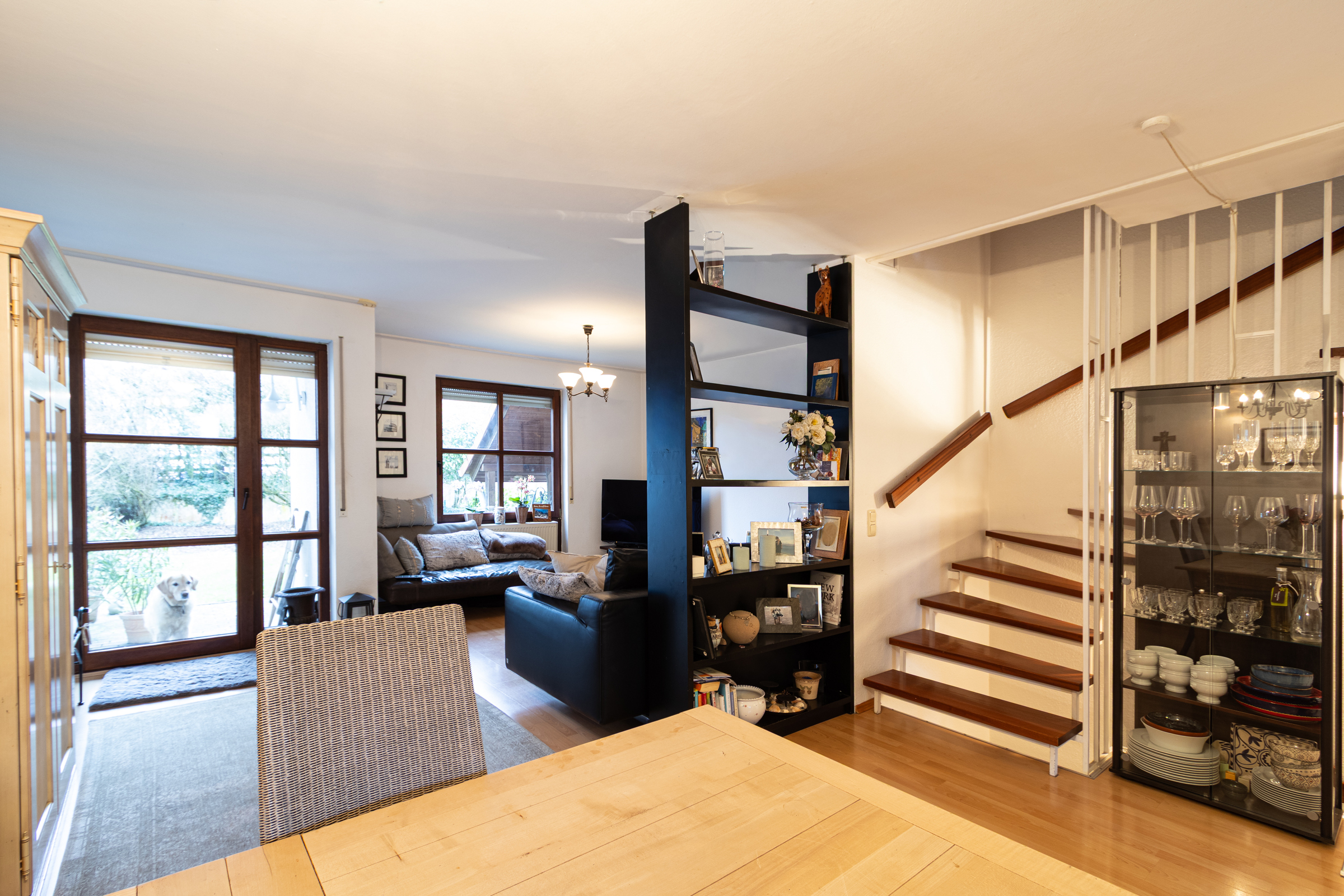 This architecturally appealing terraced house (built in 1993) impresses with a rare combination of idyllic location at the edge of a field, plenty of privacy, and a family-friendly floor plan. The 138 sq.m. of living space comprises 5 rooms with 4 bedrooms – complemented by approx. 47 sq.m. of usable space in the basement with a spacious hobby room (33 sq.m.). The small, mature and easy-care garden with terrace offers just the right amount of greenery – with places to retreat and space for relaxing hours outdoors. A single garage and a large storage room above the garage complete the offer.