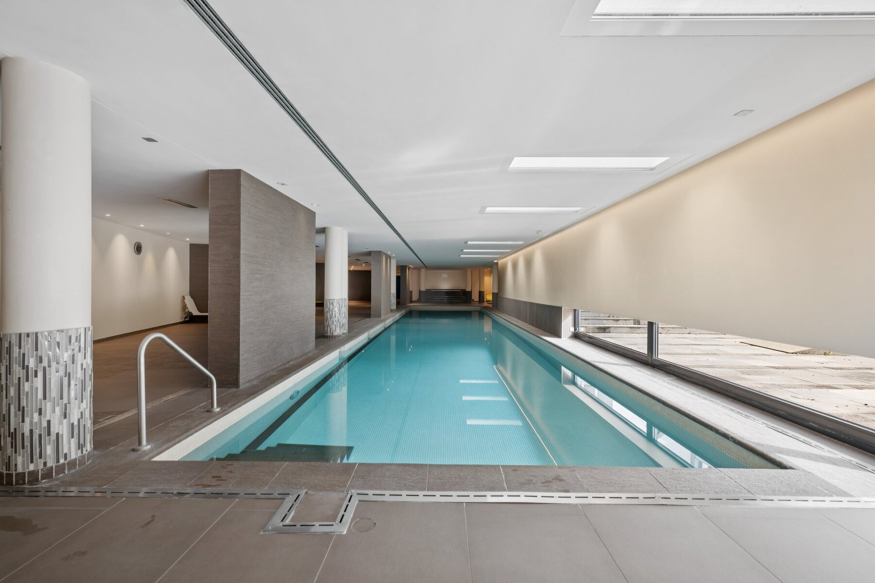 From the basement, direct access leads to an exceptional wellness area within the residence, featuring a 22-meter heated indoor pool, sauna, hammam, Jacuzzi as well as a gym.