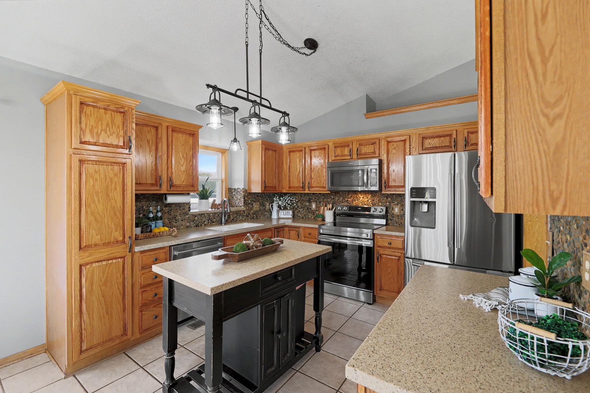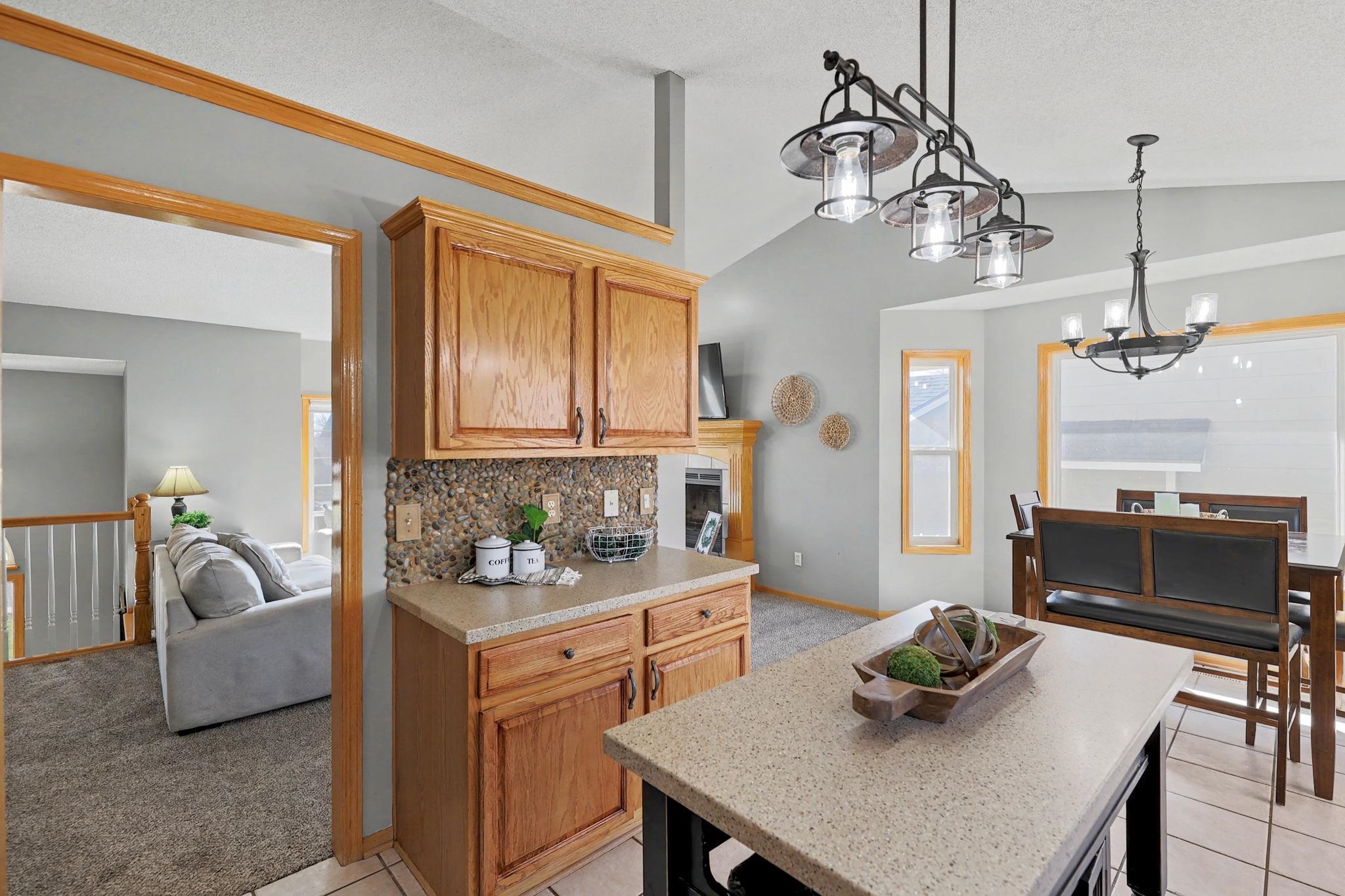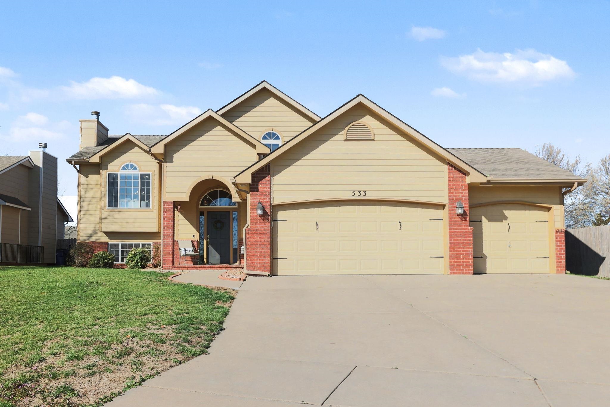 Move-in ready gem in Crescent Lakes - a neighborhood offering playgrounds, ponds, walking paths, two pools, and a clubhouse! Located in the award-winning Andover School District, this 4-bedroom, 3-bathroom home provides the perfect lifestyle with an easy walk to schools and vibrant Andover Central Park. Inside, you'll find all-new carpet, some fresh paint, and a spacious 3-car garage. The kitchen features a functional center island, beautiful solid surface countertops, a rustic pebble backsplash, and charming rustic lighting. All appliances stay! The main level includes a spacious living room with a wood-burning fireplace, along with three bedrooms - including a massive primary suite complete with a soaker tub, separate shower, dual sinks, and a walk-in closet. The basement is built for entertaining, offering a large family room with a full wet bar, making it a great option for a mother-in-law suite. The lower level also includes a fourth bedroom and full bathroom. Need even more space? An additional unfinished room with an egress window provides excellent storage or the potential to finish into a fifth bedroom. Step outside to your private oasis featuring a newly stained deck, a charming patio, and a fully fenced yard with a built-in fire pit - perfect for cozy Kansas evenings. With no special taxes and a fantastic lot, this home truly has it all!