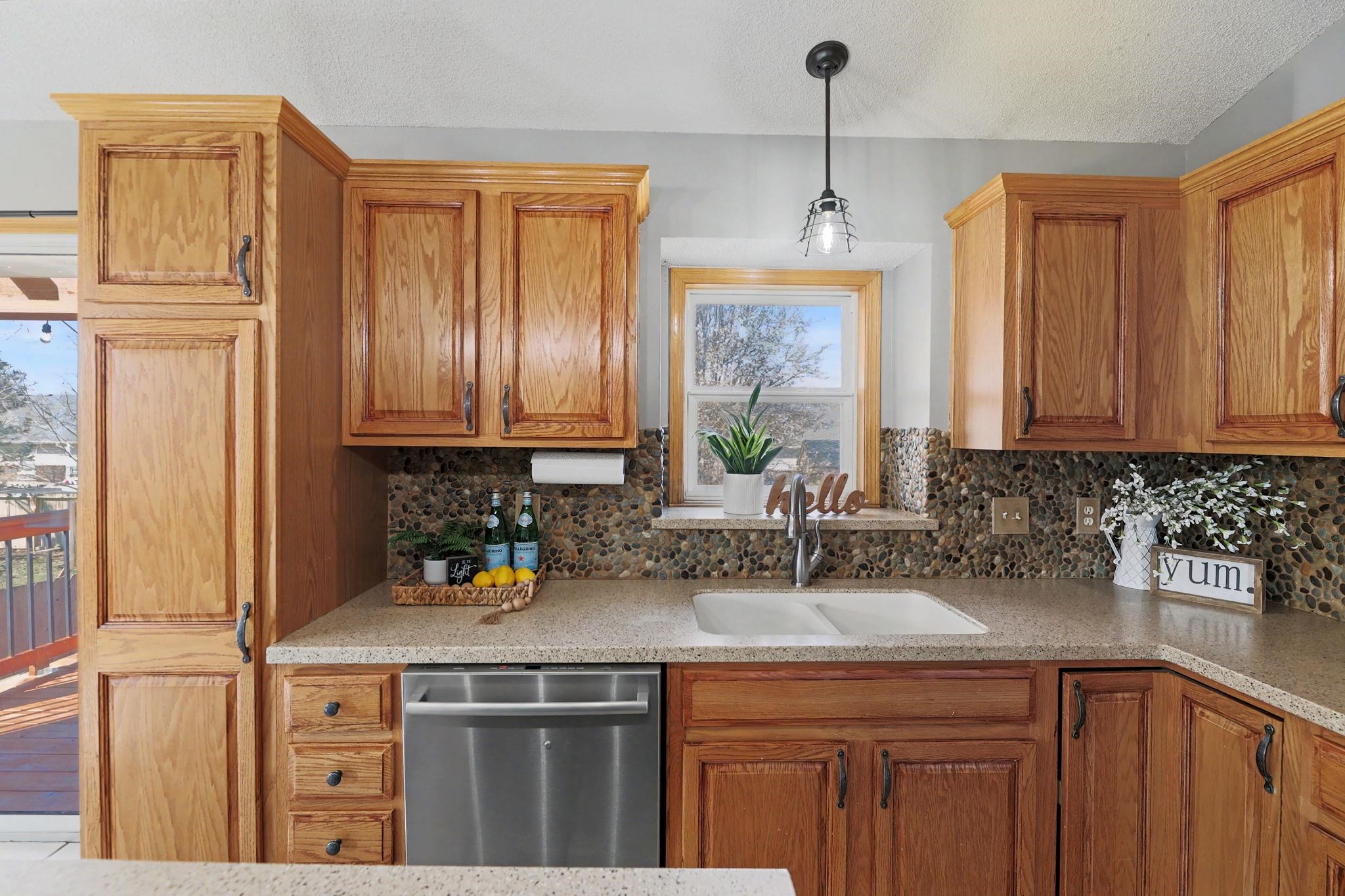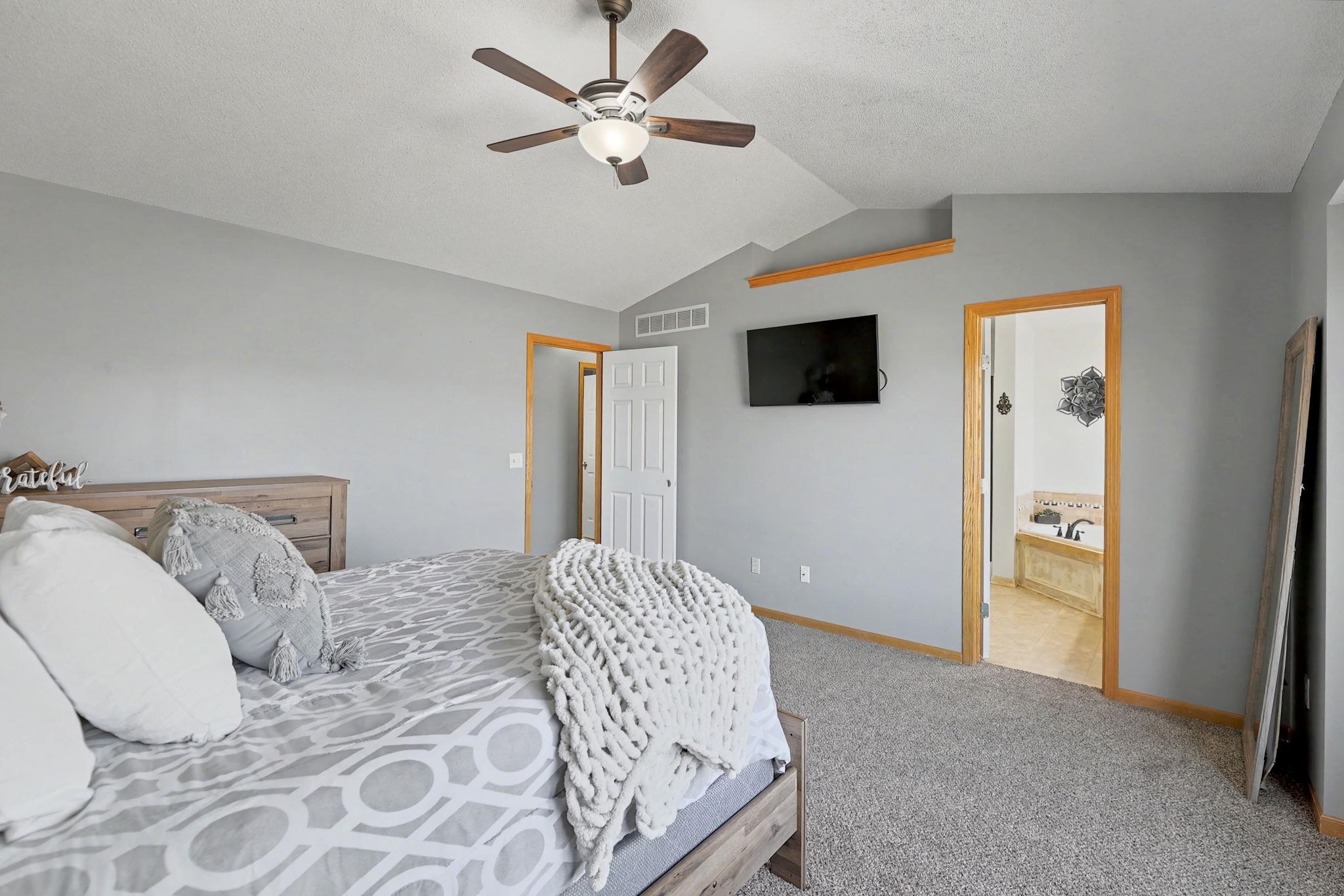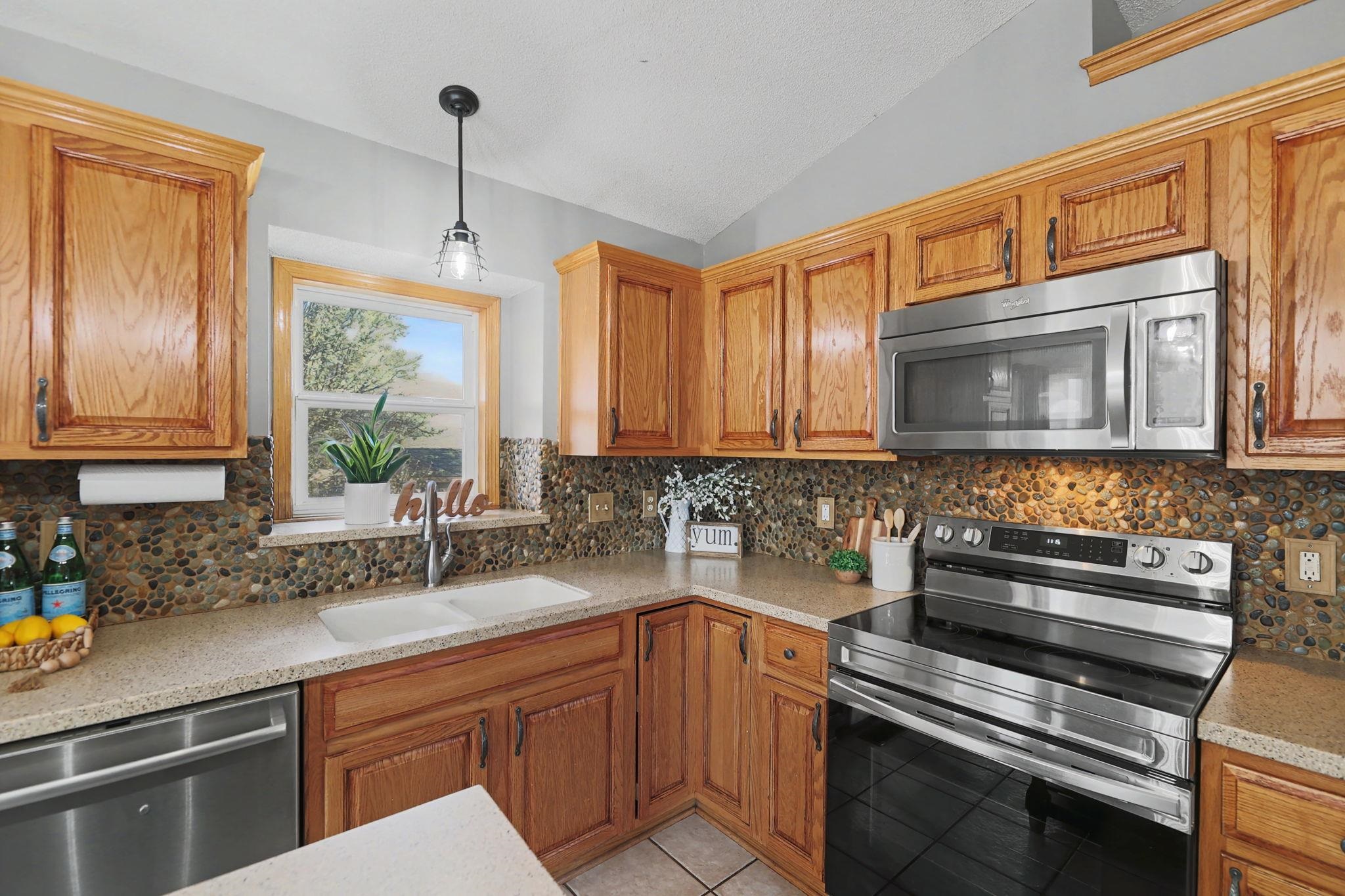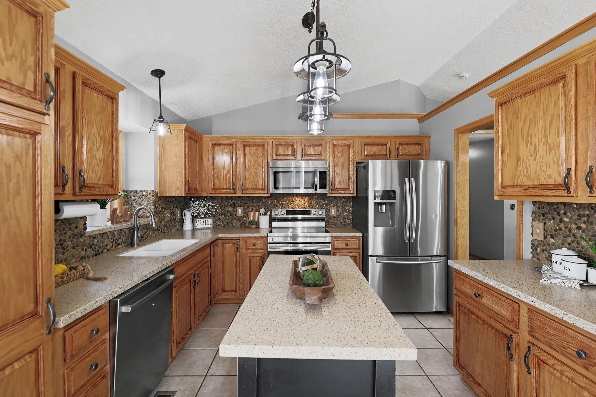 Move-in ready gem in Crescent Lakes - a neighborhood offering playgrounds, ponds, walking paths, two pools, and a clubhouse! Located in the award-winning Andover School District, this 4-bedroom, 3-bathroom home provides the perfect lifestyle with an easy walk to schools and vibrant Andover Central Park. Inside, you'll find all-new carpet, some fresh paint, and a spacious 3-car garage. The kitchen features a functional center island, beautiful solid surface countertops, a rustic pebble backsplash, and charming rustic lighting. All appliances stay! The main level includes a spacious living room with a wood-burning fireplace, along with three bedrooms - including a massive primary suite complete with a soaker tub, separate shower, dual sinks, and a walk-in closet. The basement is built for entertaining, offering a large family room with a full wet bar, making it a great option for a mother-in-law suite. The lower level also includes a fourth bedroom and full bathroom. Need even more space? An additional unfinished room with an egress window provides excellent storage or the potential to finish into a fifth bedroom. Step outside to your private oasis featuring a newly stained deck, a charming patio, and a fully fenced yard with a built-in fire pit - perfect for cozy Kansas evenings. With no special taxes and a fantastic lot, this home truly has it all!