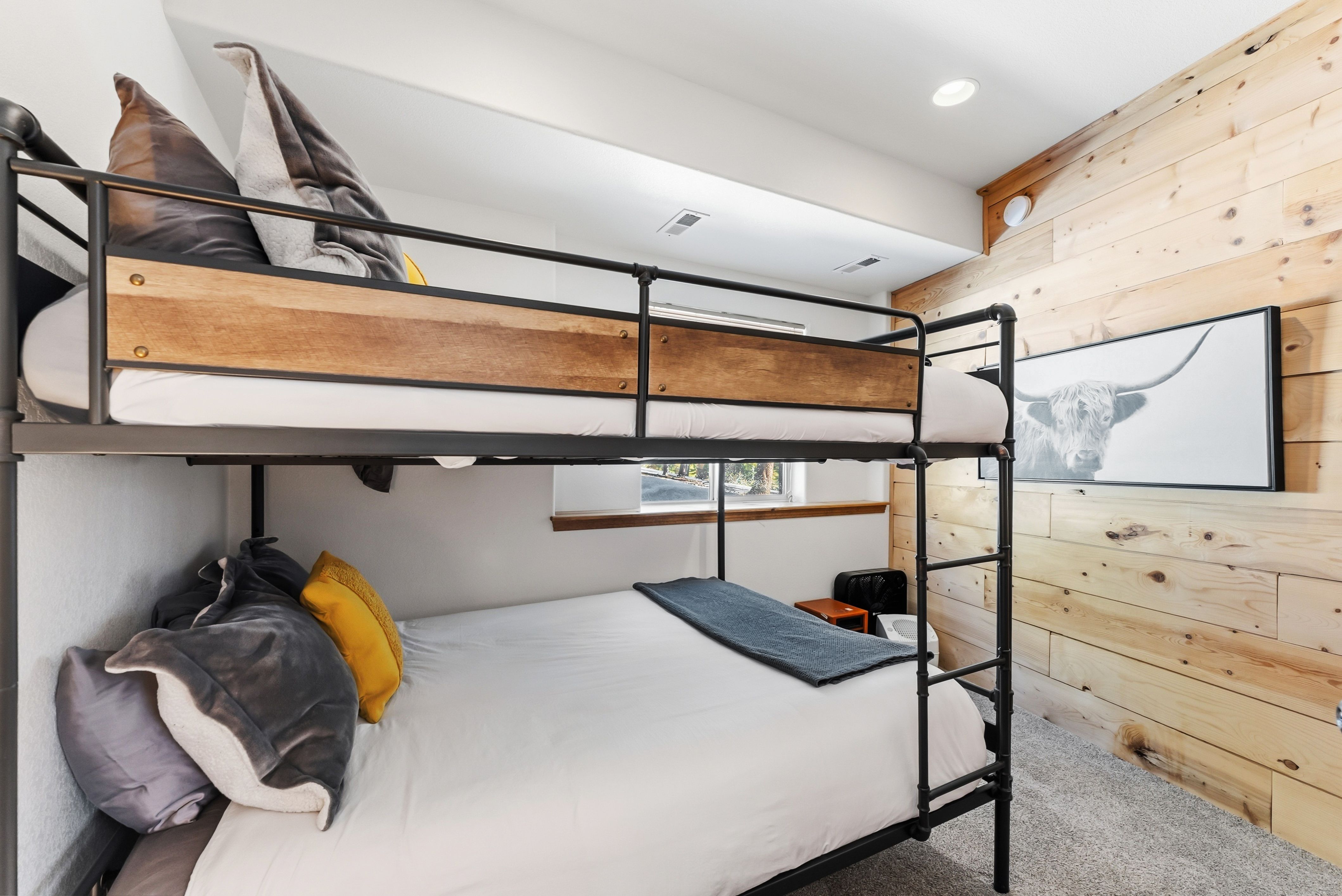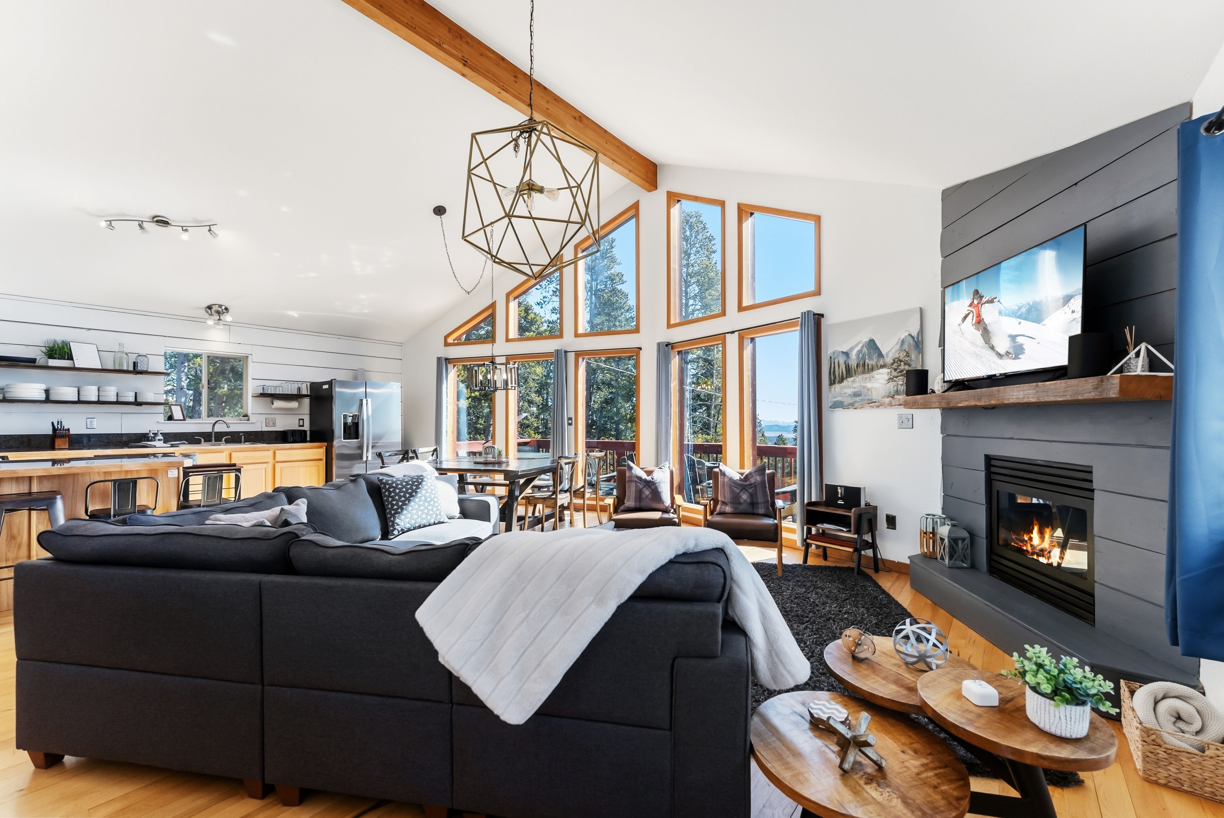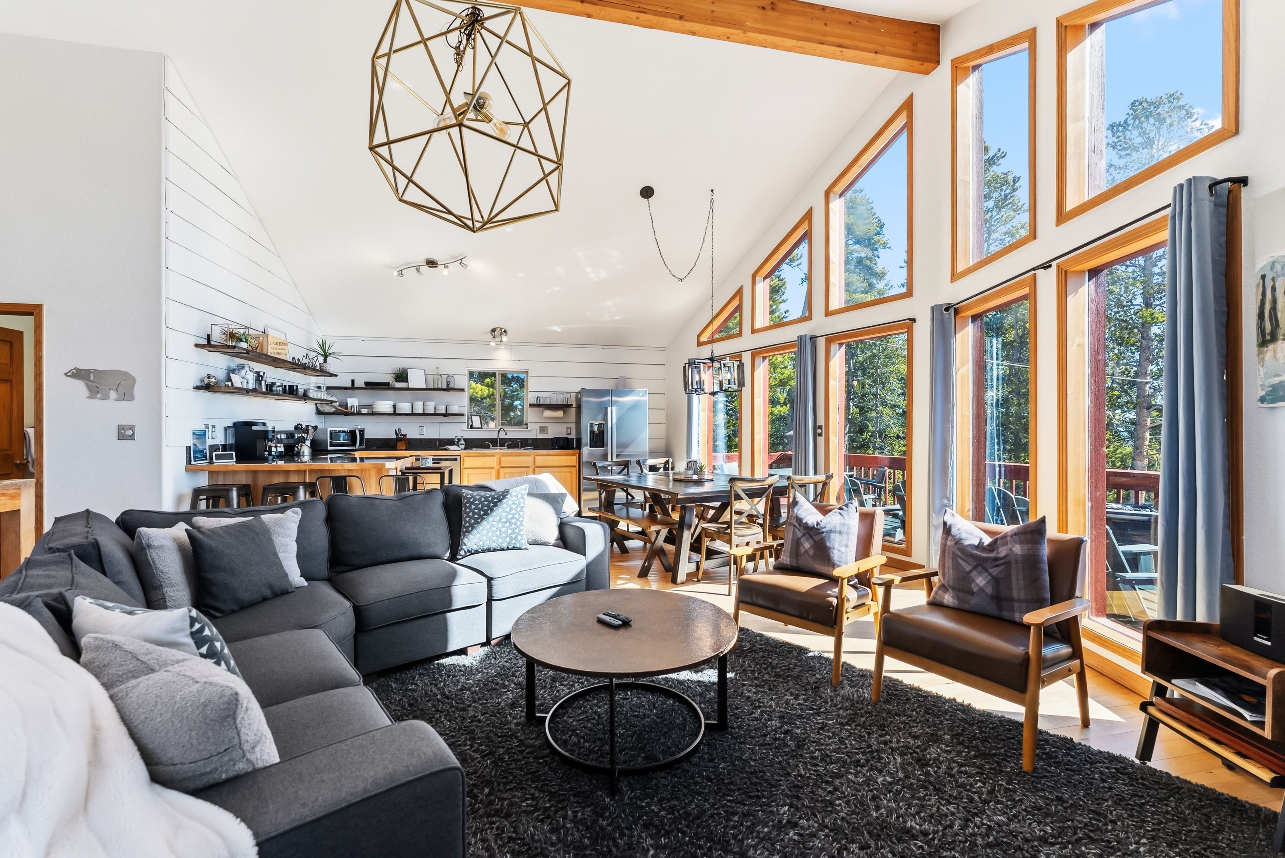 Inside, the style is clean and current with warm mountain finishes. The layout sleeps up to 10 with three king bedrooms plus a queen-over-queen bunk, making it easy to host families, couples traveling together, or a mixed group—great for occupancy and flexible pricing. Two full baths, comfortable living spaces, and a fully stocked kitchen support longer stays and repeat guests.