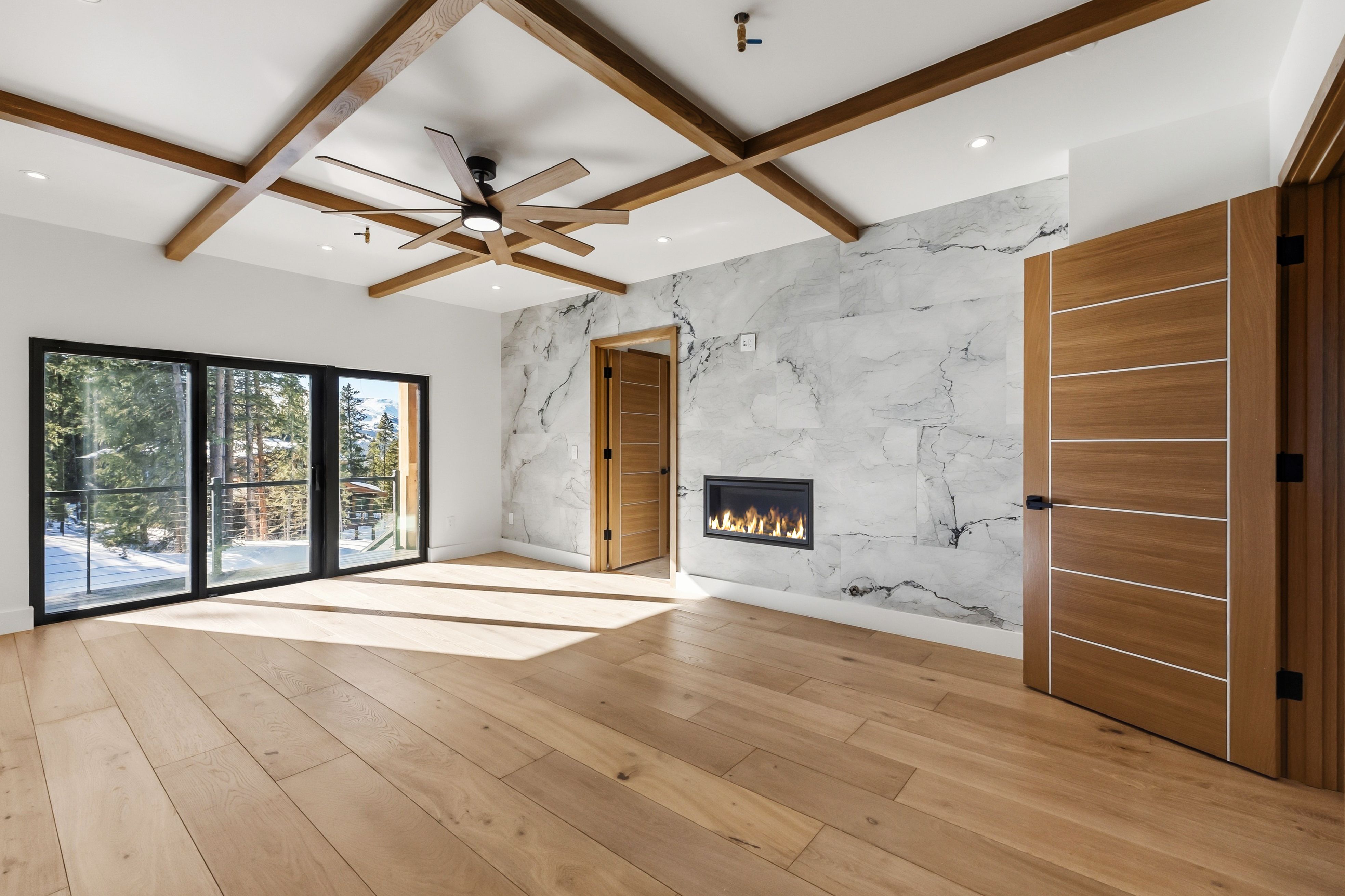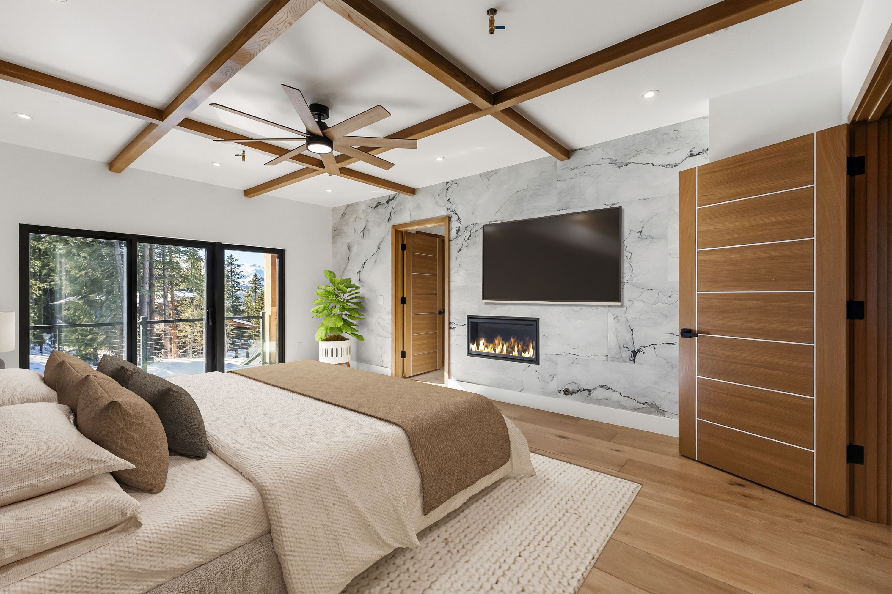 The primary suite offers a private retreat with fireplace, spa-inspired bathroom with separate shower and soaking tub, walk-in closet, and balcony overlooking the ski resort. Bedrooms throughout the home capture expansive alpine views.