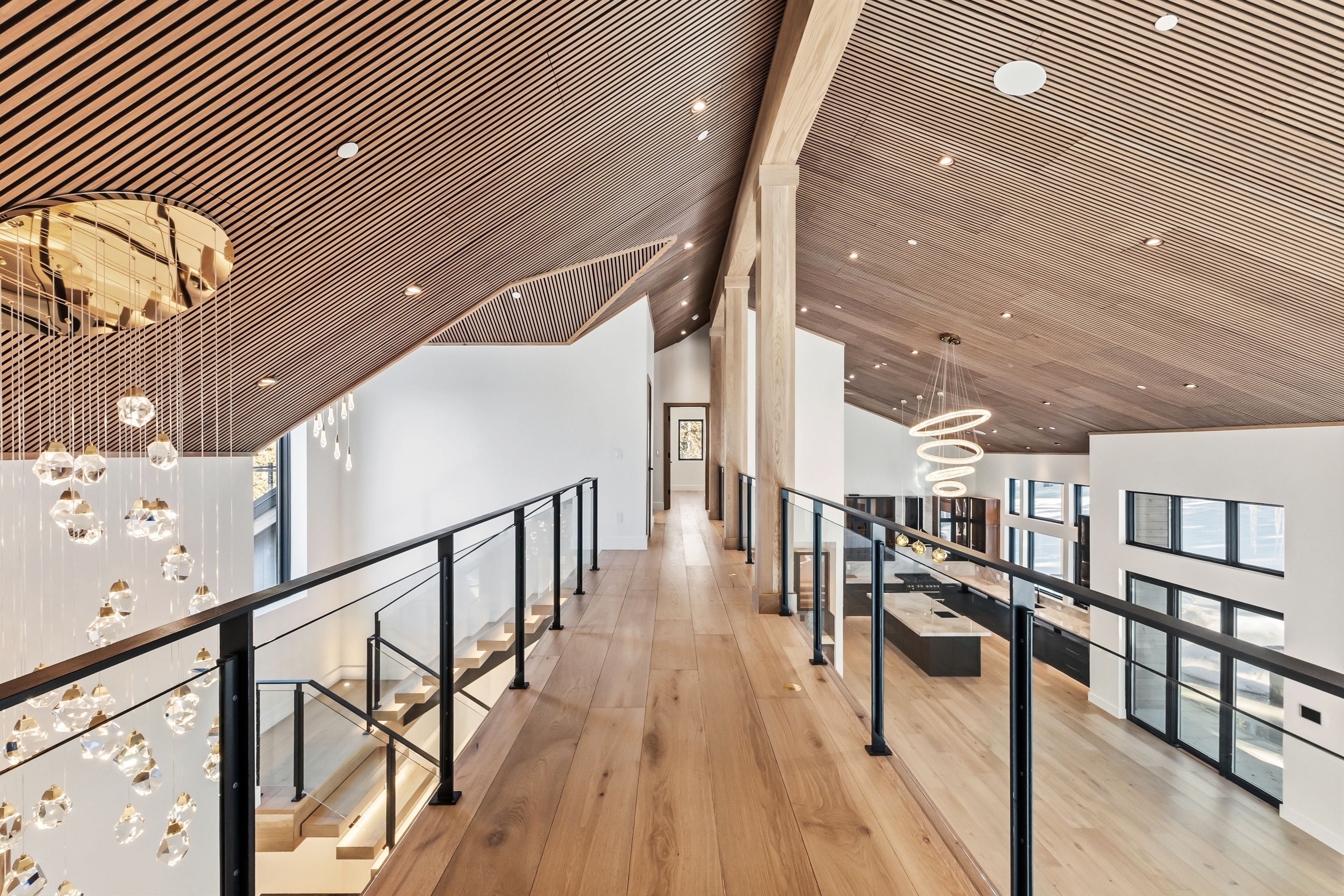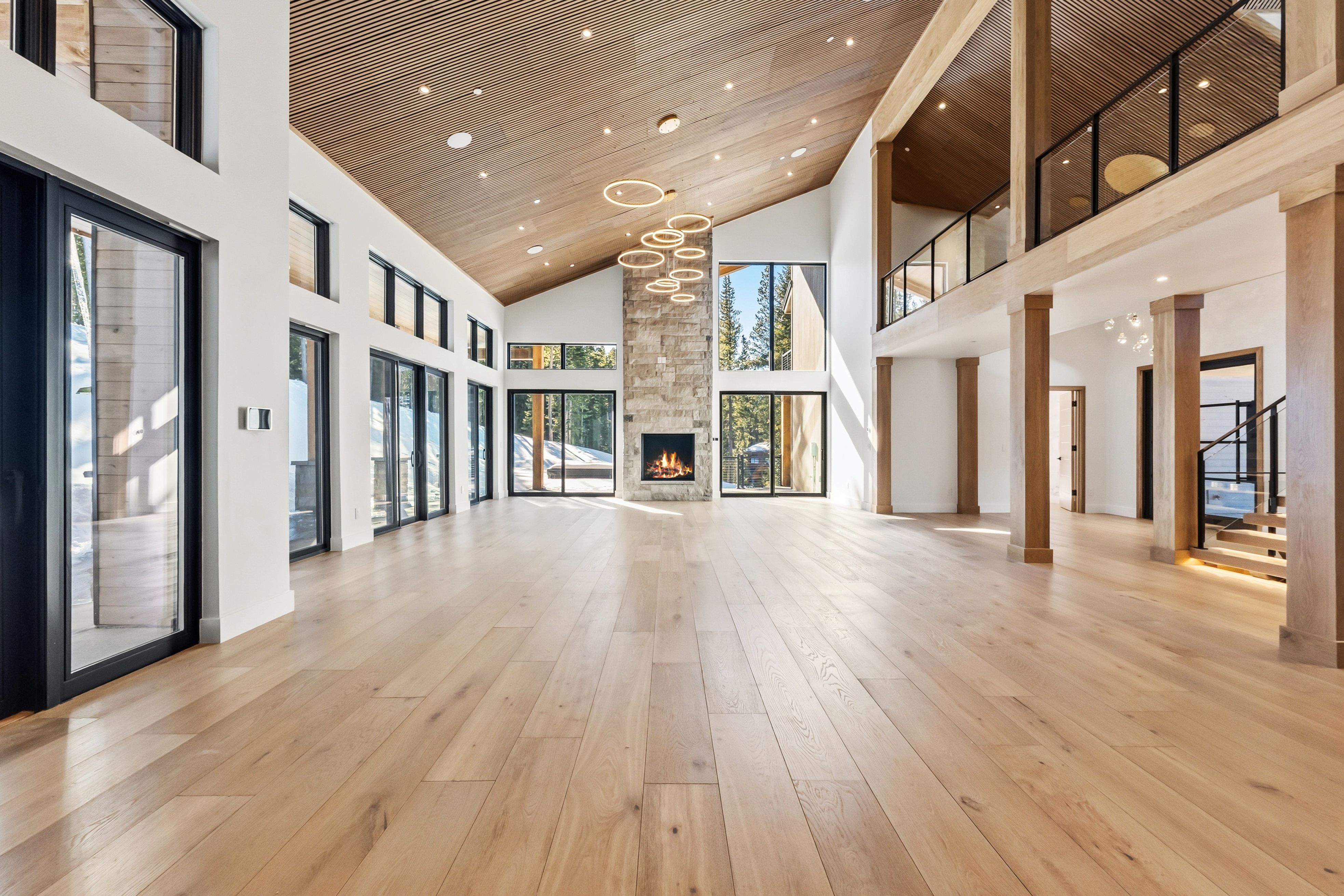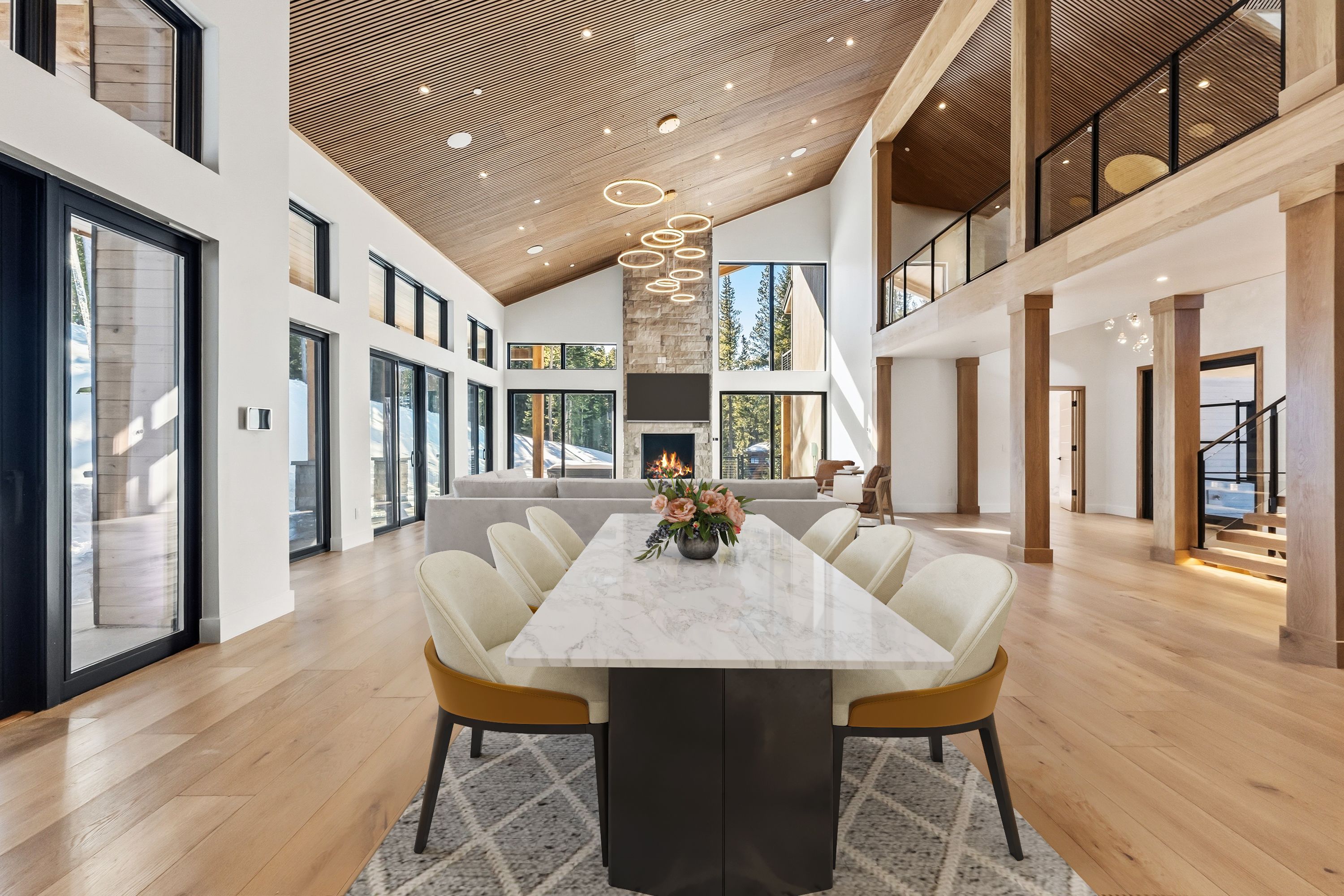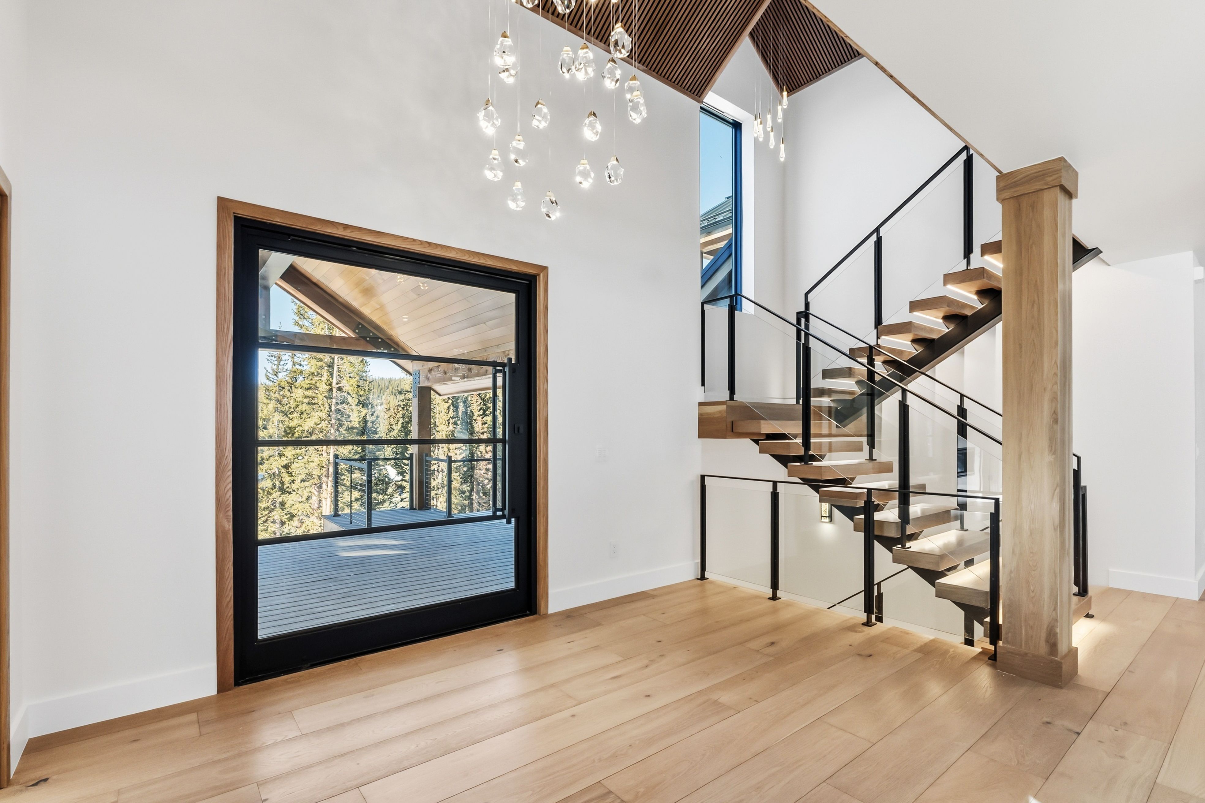 Inside, a dramatic three-story floating staircase with illuminated treads anchors the home, framed by soaring ceilings and walls of glass that bring natural light and mountain views into the living spaces. The great room and kitchen were designed for entertaining with seamless indoor-outdoor flow.