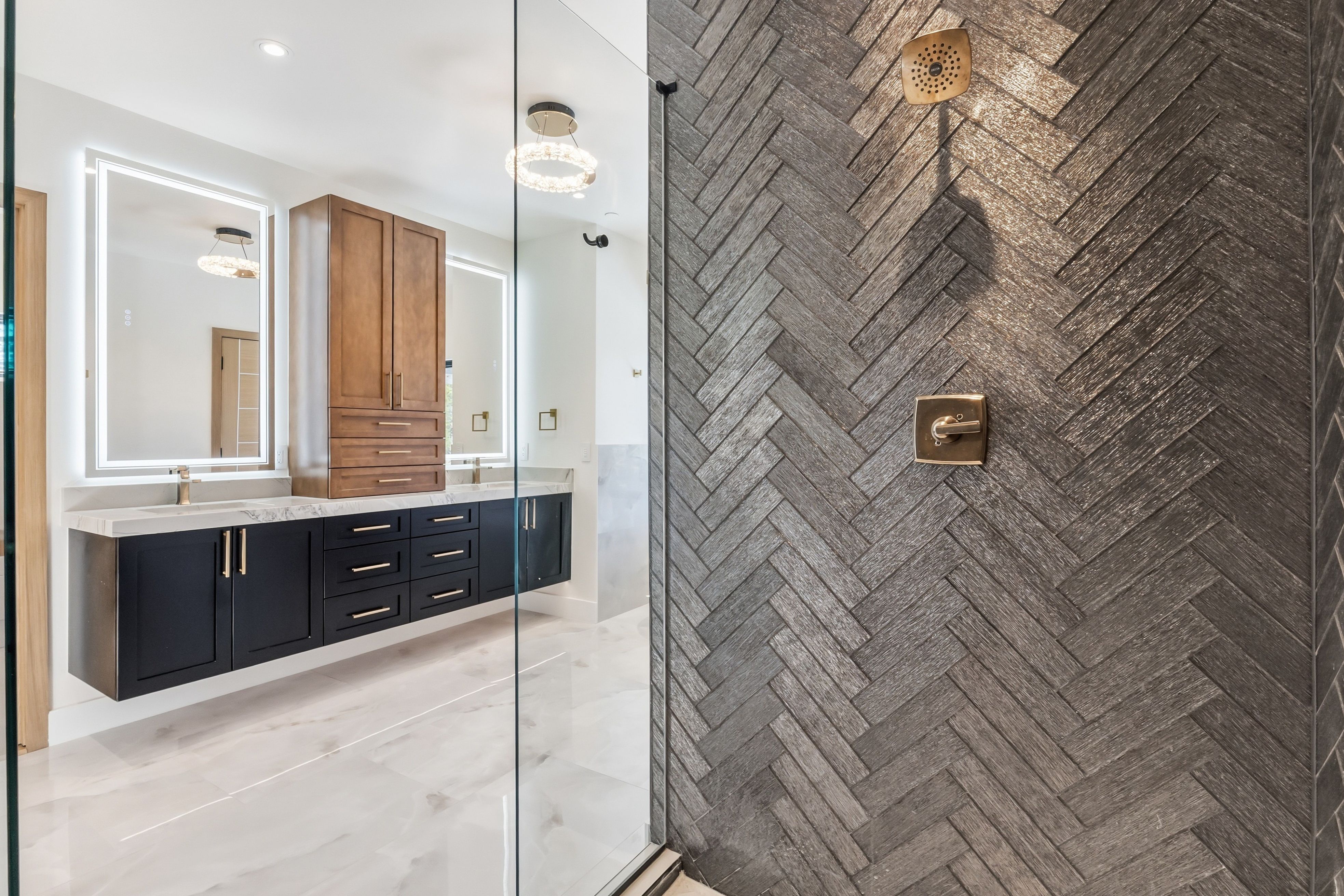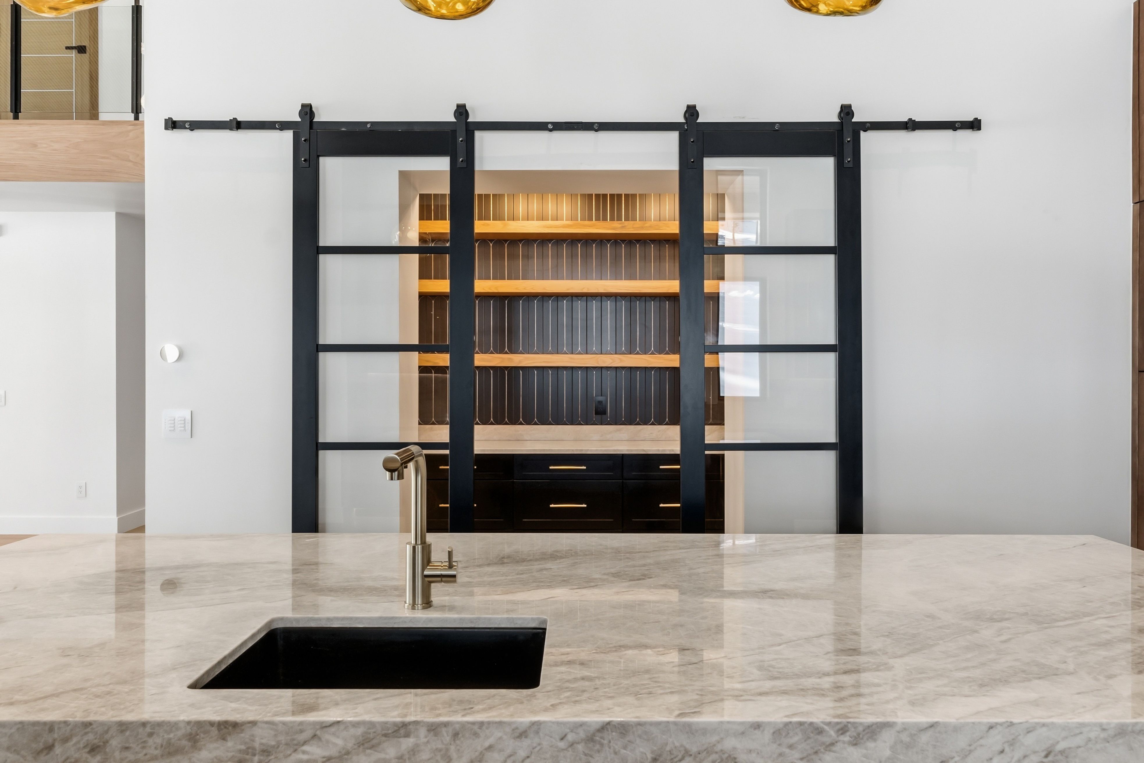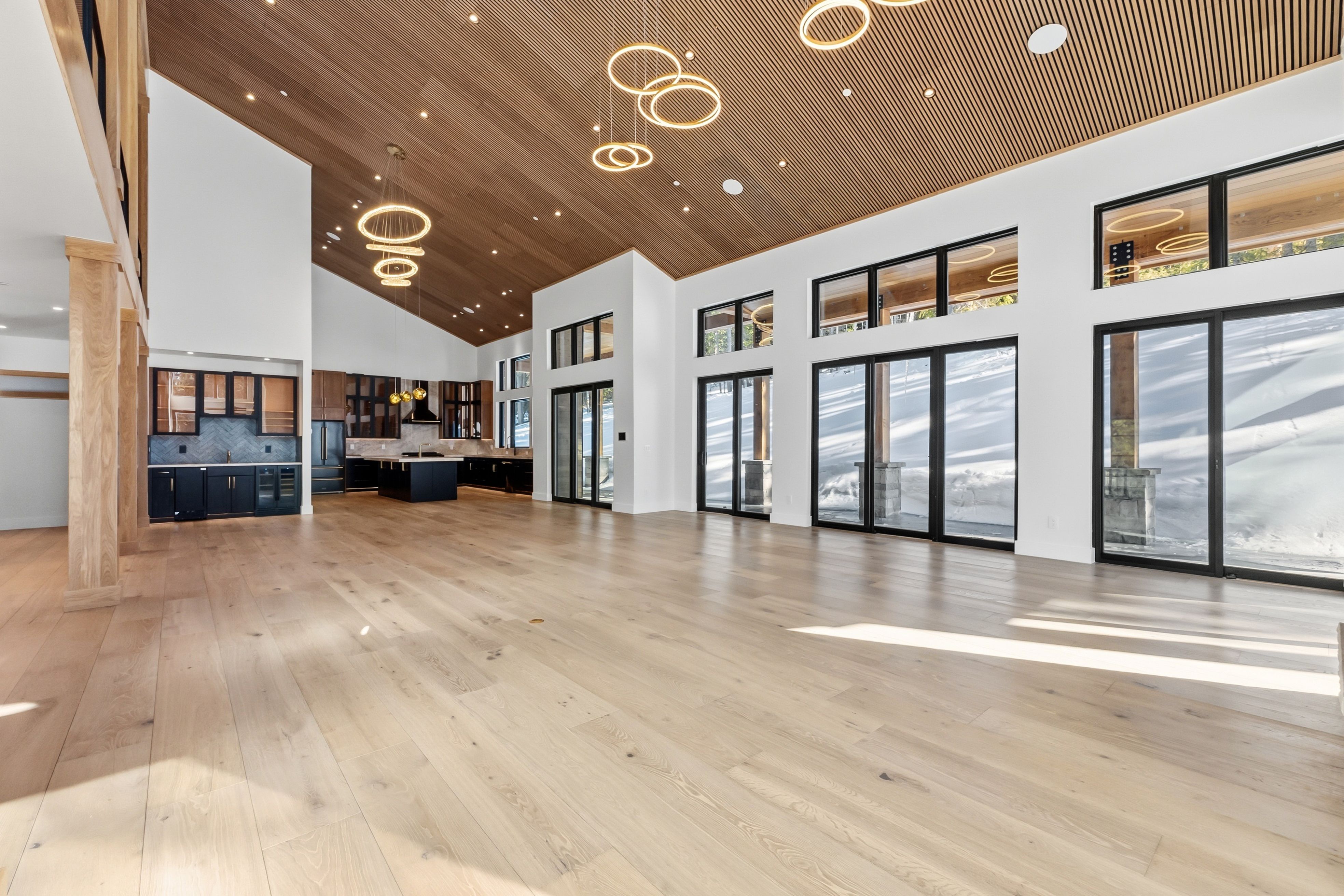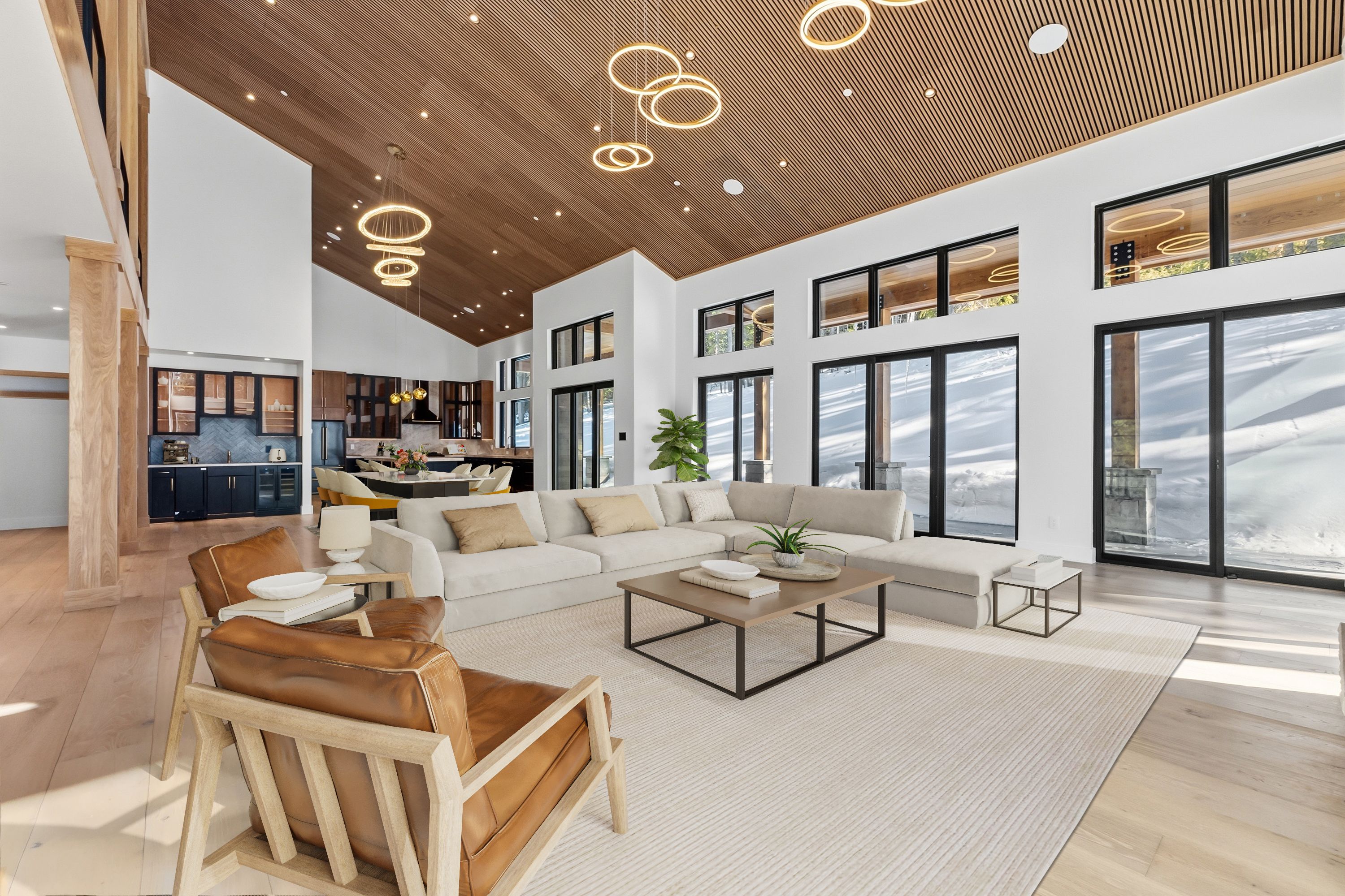 Inside, a dramatic three-story floating staircase with illuminated treads anchors the home, framed by soaring ceilings and walls of glass that bring natural light and mountain views into the living spaces. The great room and kitchen were designed for entertaining with seamless indoor-outdoor flow.