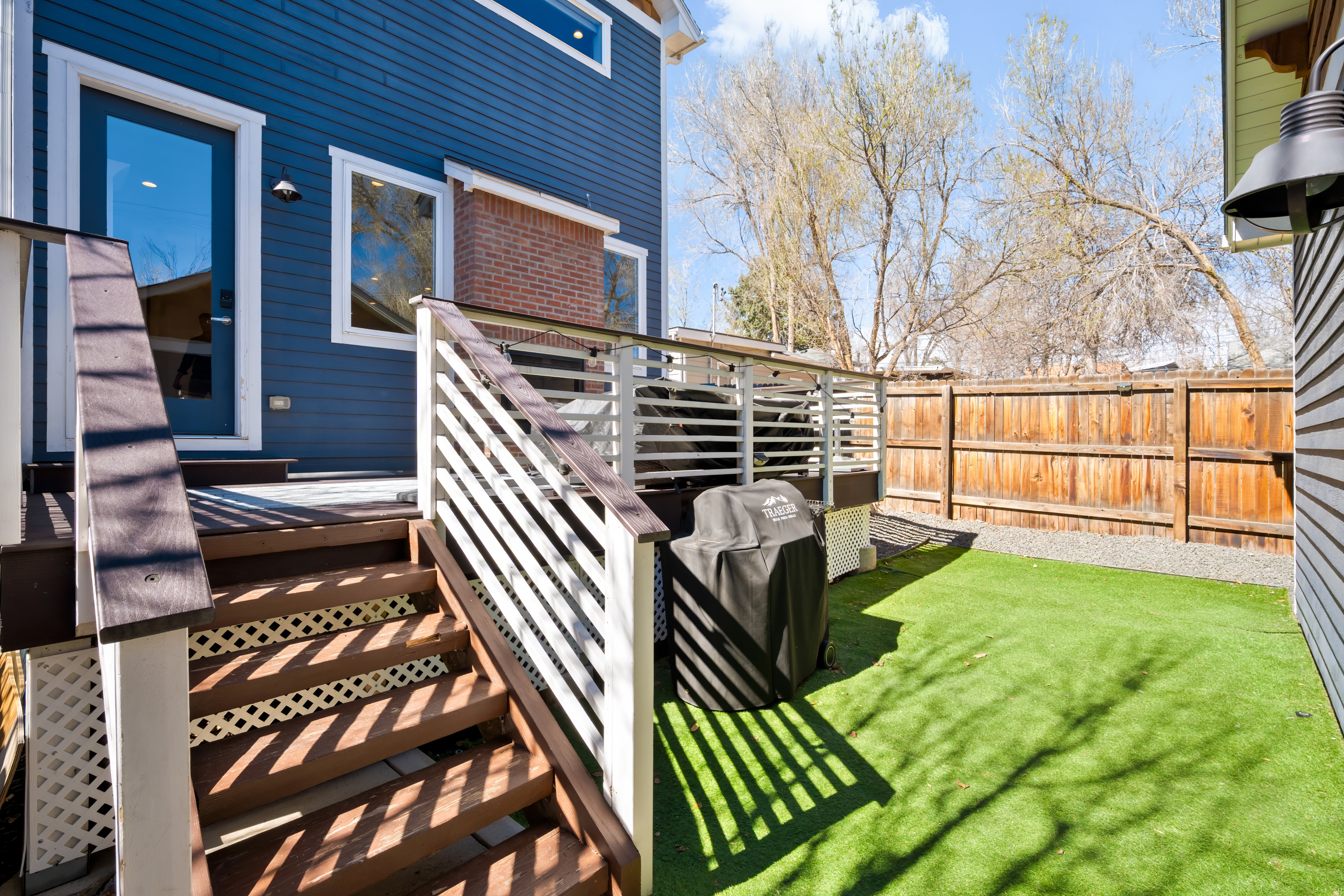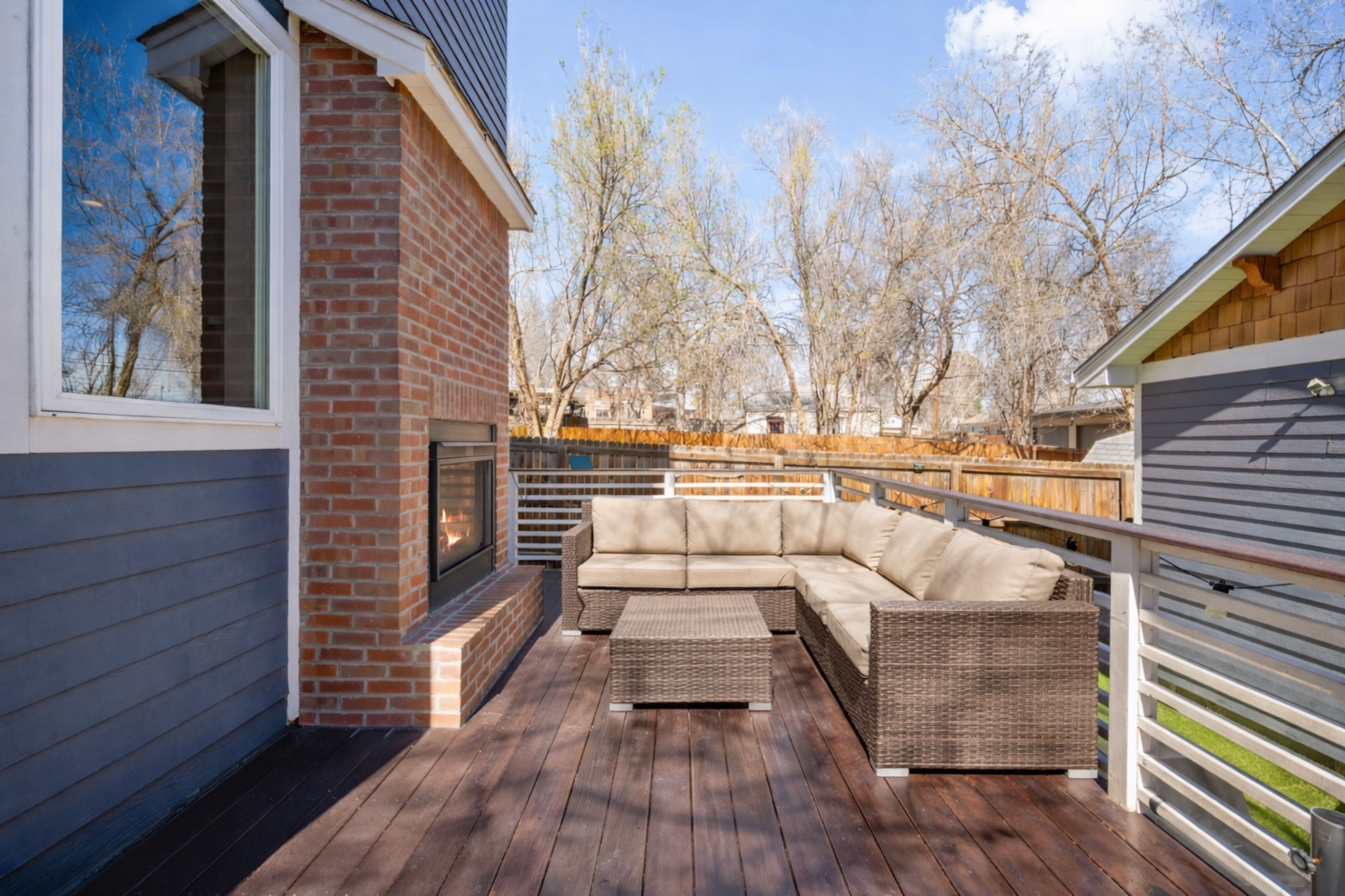 Perfectly positioned just blocks from the restaurants, coffee shops, and boutiques of South Broadway, this modern Englewood home offers a rare combination of walkable city living and spacious newer construction. Inside, a light-filled open floor plan seamlessly connects the kitchen, dining area, and living room, creating an inviting space ideal for both everyday living and effortless entertaining. The kitchen features quartz countertops, stainless steel appliances, white cabinetry, and a large center island, opening to a spacious living room anchored by a striking indoor-outdoor gas fireplace and large windows that fill the home with natural light. A main-floor bedroom and bathroom provide flexibility for a home office, a guest suite, or multigenerational living. Upstairs, the primary suite serves as a private retreat with generous closet space and a luxurious five-piece bathroom featuring dual vanities, quartz countertops, a soaking tub, and a glass-enclosed shower. Two additional bedrooms, a full bathroom, and a convenient upper-level laundry room complete the second floor. The finished basement adds valuable additional living space, perfect for a media room, home gym, playroom, or second living area, along with a private bedroom and bathroom ideal for guests. Outdoor spaces are designed for easy Colorado living with a welcoming covered front porch, a back deck for entertaining, and a low-maintenance turfed backyard leading to the detached two-car garage. Located in a highly convenient Englewood neighborhood with quick access to Craig Hospital & the Swedish Medical Center, South Broadway restaurants, Cherry Creek shopping, the Denver Tech Center, light rail, and major commuter routes, this home offers the perfect blend of modern design, flexible living space, and unbeatable location.