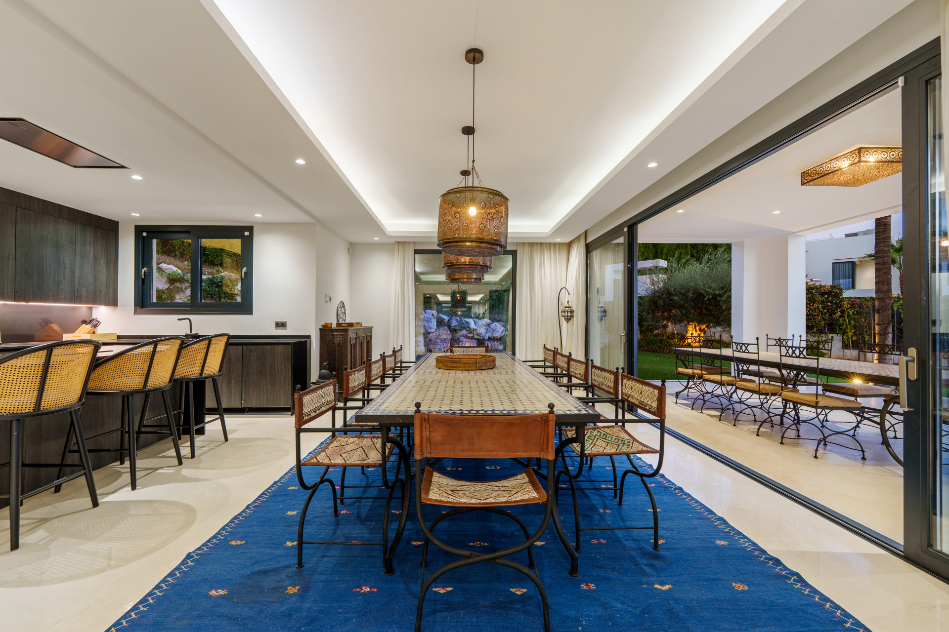 Bathed in natural light and designed to capture the essence of Mediterranean living, this exceptional contemporary villa offers a refined lifestyle in one of Marbella’s most desirable residential areas. Sleek architectural lines, expansive glass doors and a luminous open-plan layout create an immediate sense of space and elegance, allowing the interior to blend effortlessly with the surrounding landscape. The property sits on a generous private plot of approximately 1,443 m² and offers around 493 m² of built living space complemented by 204 m² of terraces, all thoughtfully oriented to enjoy sunlight throughout the day and beautiful open views across the surrounding golf valley. Inside, the home reveals a sophisticated yet welcoming atmosphere where modern design is enriched by subtle Mediterranean and Moorish influences. Carefully curated furnishings, bespoke lamps and textured fabrics create warmth and character, while natural materials such as stone, wood and greenery enhance the calming ambiance. High ceilings and large sliding glass panels amplify the sense of openness, seamlessly connecting the living areas with the outdoor terraces and gardens, making the entire home feel both expansive and intimate at the same time. The property features six beautifully appointed bedrooms and six bathrooms, each designed to provide privacy, comfort and a connection to the outdoors. Many of the suites enjoy direct access to terraces with tranquil views, creating private retreats filled with natural light. Elegant bathrooms, refined finishes and thoughtful layouts reflect a careful attention to detail that elevates everyday living into a truly luxurious experience. The main living spaces are designed for both relaxation and entertaining. A spacious open-plan kitchen and dining area flow effortlessly into stylish lounges that open onto covered terraces overlooking the pool and gardens. The property also includes a dedicated entertainment area with comfortable seating and ambient lighting, ideal for movie nights or social gatherings, as well as a fully equipped private gym that allows residents to maintain an active lifestyle from the comfort of home. The seamless integration between interior and exterior living areas creates an inviting setting for hosting friends or enjoying quiet evenings surrounded by beauty. Outdoor living is equally impressive. A striking swimming pool forms the centrepiece of the garden, surrounded by elegant sun loungers and manicured greenery that ensure privacy and serenity. Covered terraces provide shaded dining and lounge areas, perfect for enjoying long Mediterranean lunches or sunset dinners with family and guests. Above, a spectacular rooftop terrace offers panoramic views over the golf valley and surrounding hills, creating an extraordinary setting for entertaining or simply relaxing under the open sky. Located within a secure and exclusive gated environment close to renowned golf courses, international schools, restaurants and the vibrant lifestyle of Marbella, this remarkable villa offers the perfect balance between tranquility and accessibility. Combining contemporary architecture, refined interiors and exceptional outdoor spaces, it represents a unique opportunity to experience sophisticated Mediterranean living at its finest.