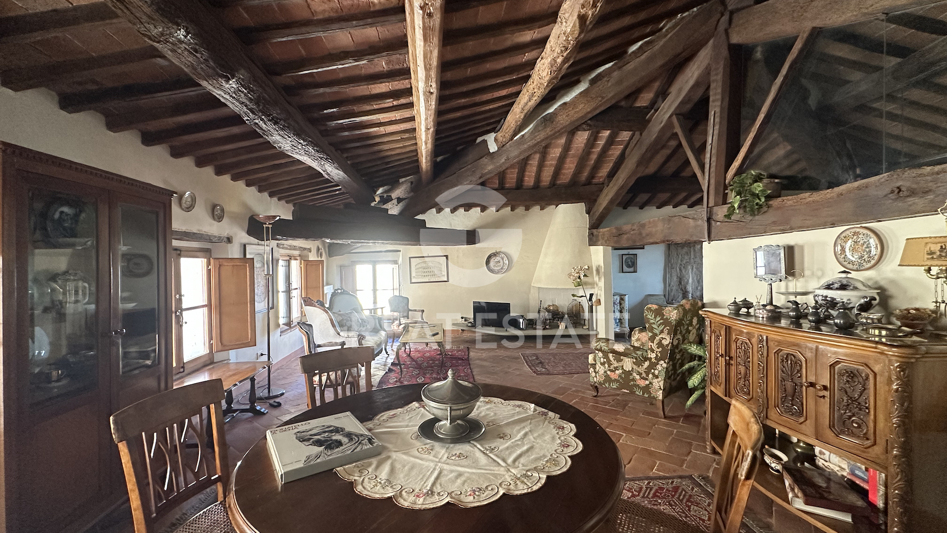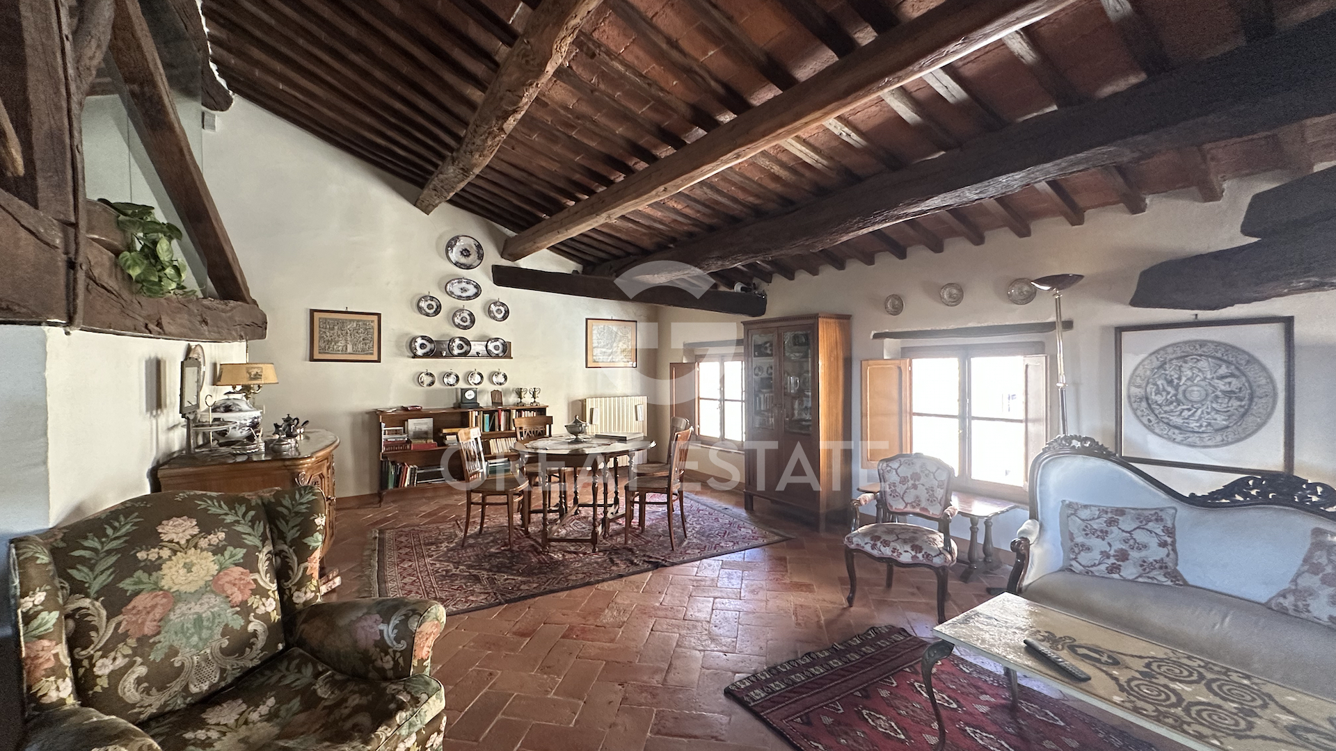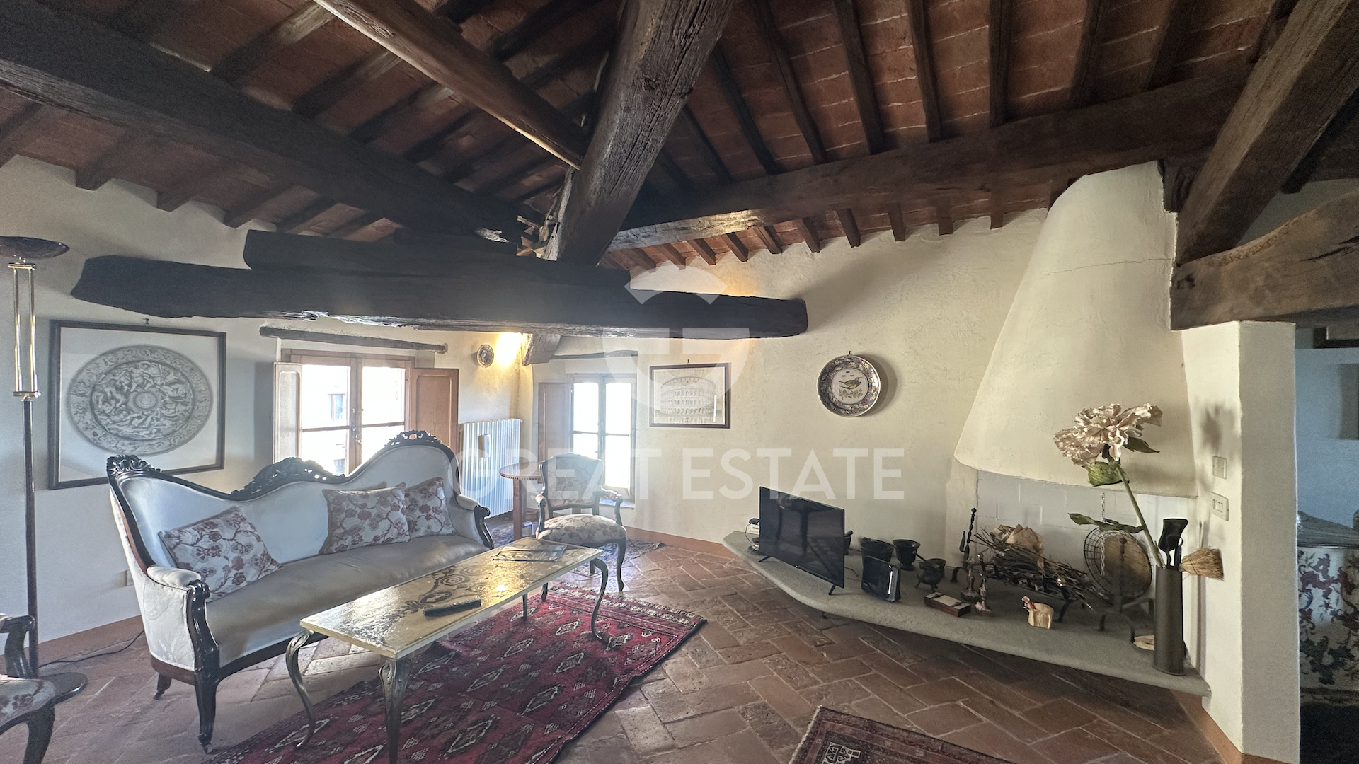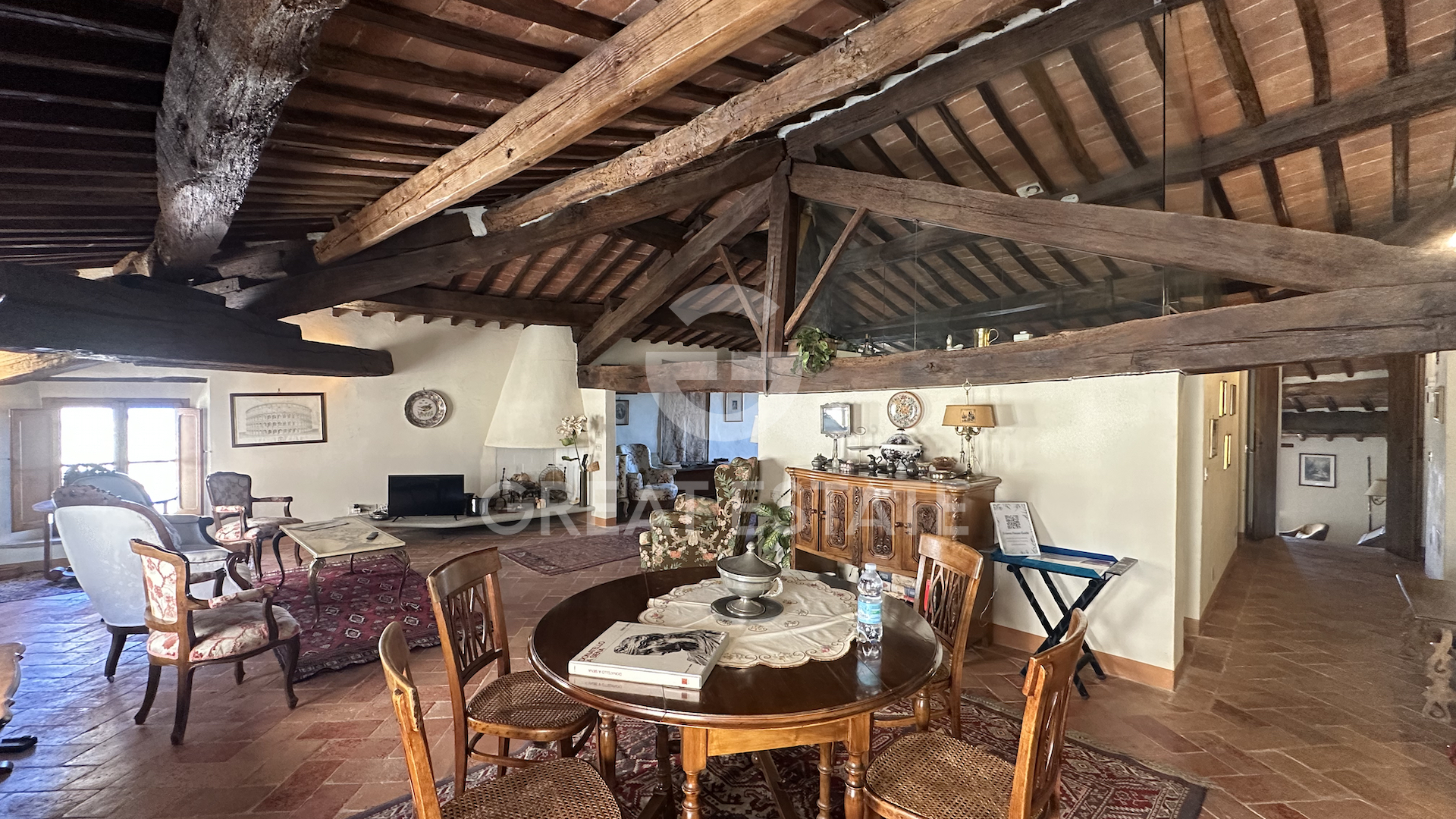 The apartment is laid out entirely on a single level and welcomes guests with an entrance that, from the condominium staircase, leads directly into a splendid double living room. The space, generous and filled with natural light, is made even more captivating by the ancient exposed wooden beams, which create movement and lend character and uniqueness to the interiors. At the heart of the home is a charming eat-in kitchen, intimate and functional, enhanced by elegant glass panels that separate it from the living area while maintaining a pleasant sense of openness. Adjacent to the kitchen is a first bathroom equipped with a bathtub, while a second bathroom with a shower is located a short distance away, ensuring practicality and comfort. Descending a few steps leads to the stunning bedroom: a very spacious and inviting retreat, made even more evocative by the panoramic views over the gentle Tuscan countryside. There is also the possibility of creating a second bedroom within the double living room, thanks to its proximity to the hallway and the second bathroom. Completing the property are several amenities that enhance its comfort: a service lift within the condominium stairwell, a shared sauna, a private cellar, and a communal technical room. A combination of features that makes this apartment not only charming, but also highly functional and well equipped.