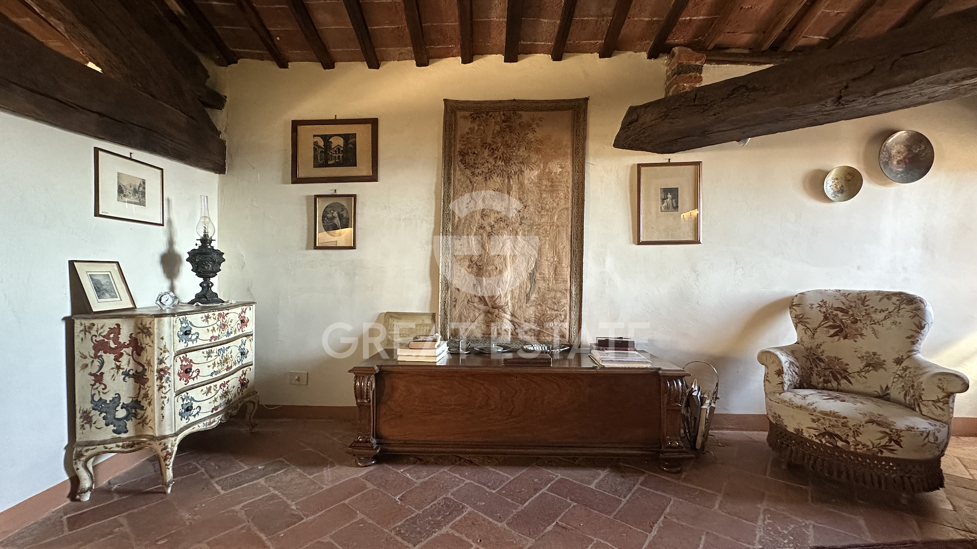 Of 19th-century origin, the apartment is in excellent condition, renovated with high-quality materials in the 1990's. It features ceilings with original wooden beams and terracotta tiles, antique terracotta flooring, travertine details, and original wooden doors and window frames in excellent condition.