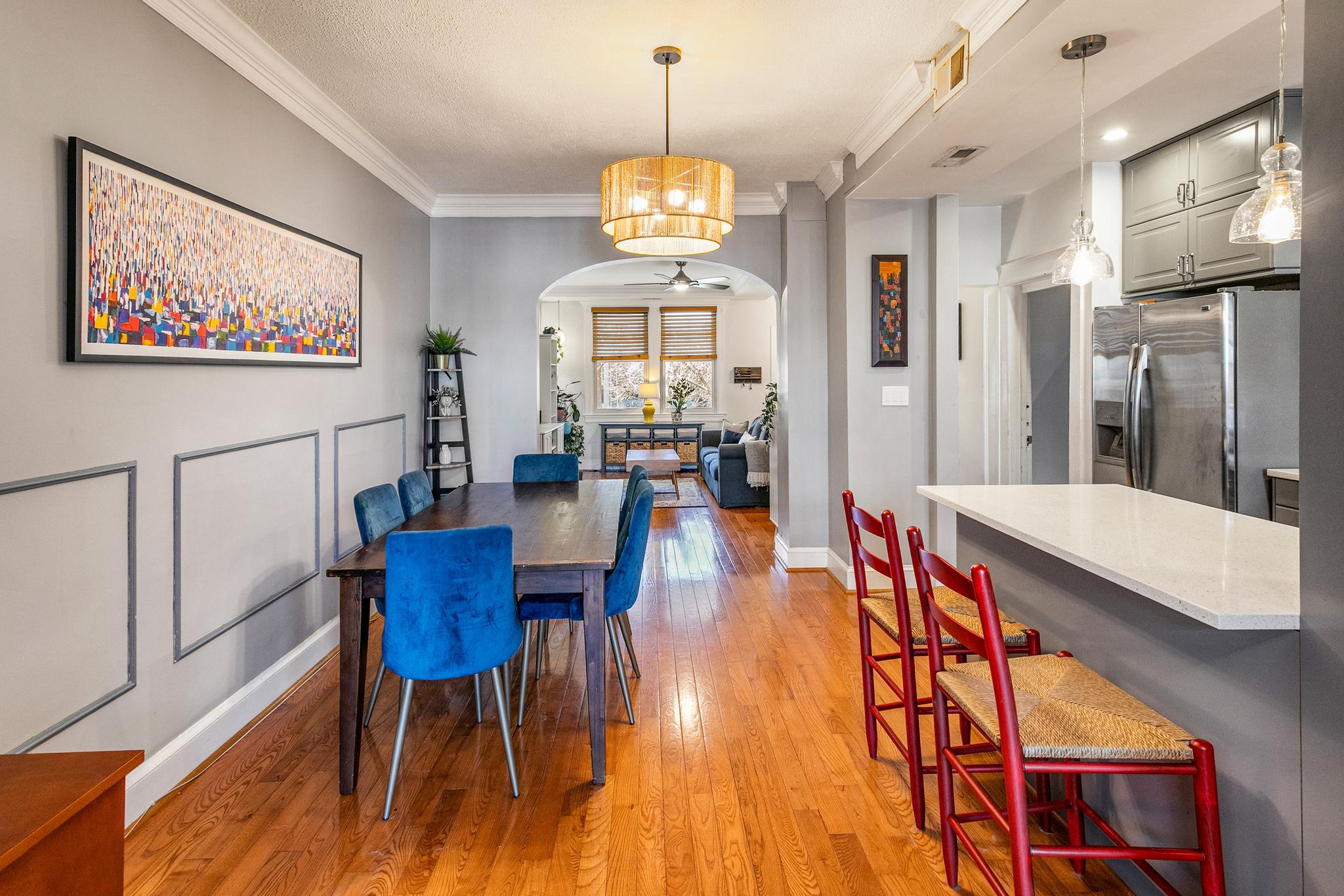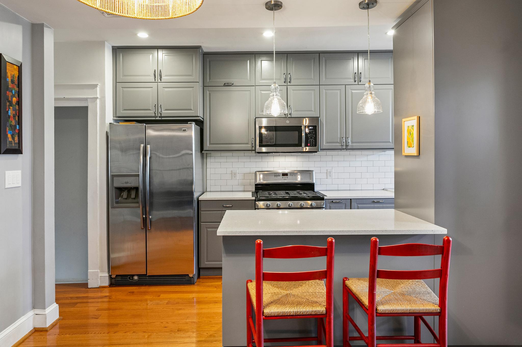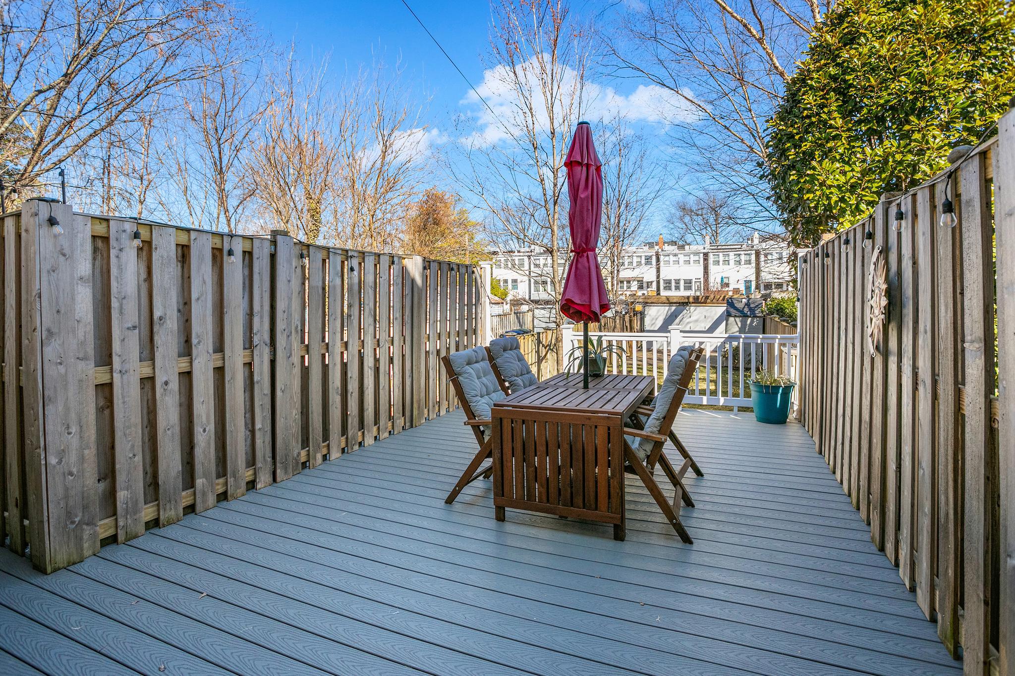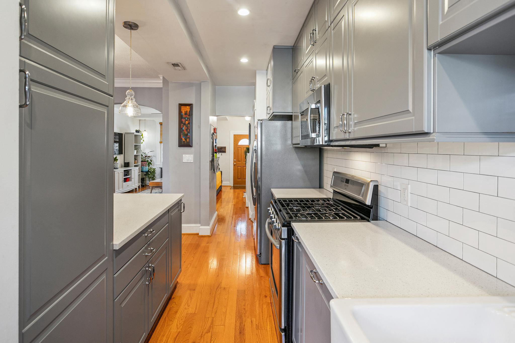 Welcome to 427 Ingraham Street, NW in the heart of Petworth, on a charming tree-lined street. This sunny and spacious home offers comfortable living and updates throughout. The main level features wood flooring, a generous living room, and a gourmet kitchen with quartz countertops, a farm sink, stainless steel appliances, ample cabinetry, and island seating. This beautiful home includes lovely original details, with modern finishes throughout.Just off the kitchen, a bright sunroom opens through French doors to a well maintained Trex deck overlooking a flat green backyard, and a convenient private parking pad with an electric garage door. Upstairs, you’ll find three sizable bedrooms filled with natural light and two beautifully renovated full bathrooms.The lower level expands the living space with a recreation room and a new secondary kitchenette featuring granite countertops, a full-size stainless steel refrigerator, a sink, and storage cabinets. This level also includes a large office or den with a closet, a full bathroom, and a walk-in storage room with laundry and utilities. Notable upgrades include a rebuilt deck, new HVAC system, fresh exterior paint, new basement flooring and paint, improved drainage by the basement and back door, a regraded and sodded backyard, a landscaped front yard, a replaced porch roof, and silver roof sealant. This move-in-ready home features solar panels as well. Conveniently located a few blocks to Le Coop coffee shop and everything Petworth has to offer!
