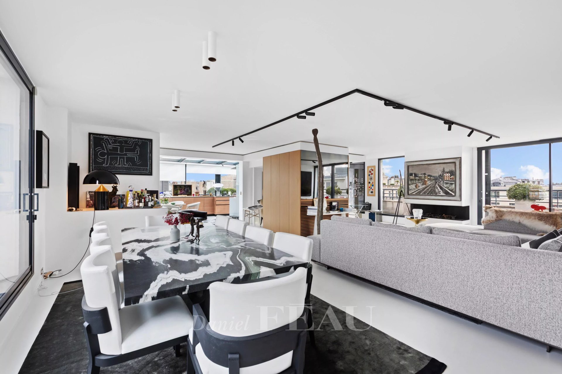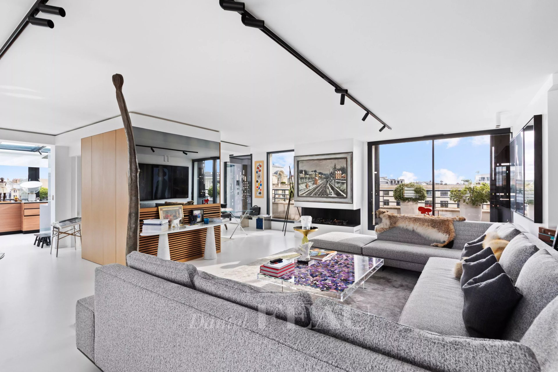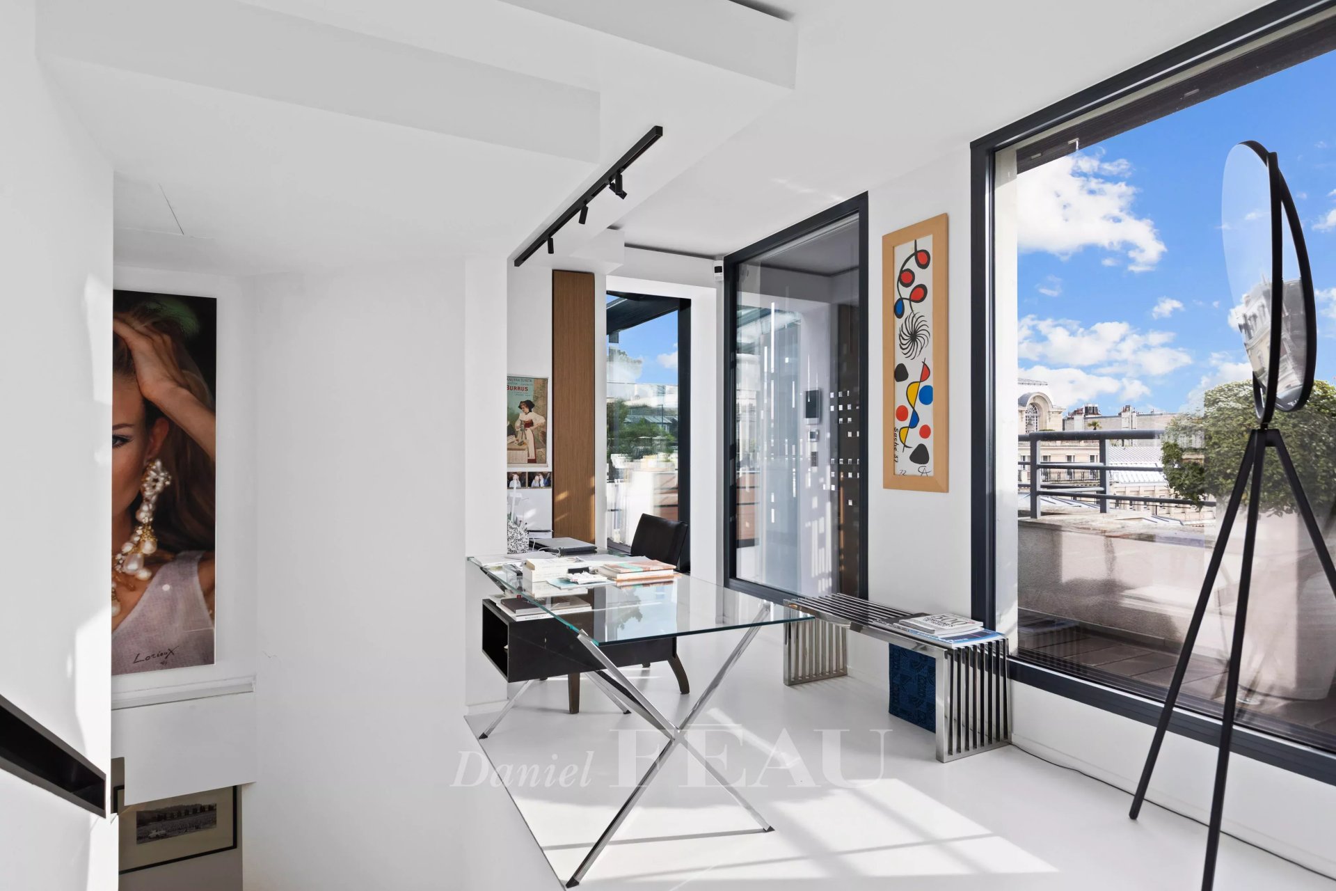 Elysée/Matignon neighbourhood. This stunning apartment offering 292 sqm of meticulously renovated living space is on the 7th, 8th and 9th floors of a recent building. Benefiting from direct lift access and boasting 163 sqm terraces, it includes a 100 sqm living/reception room with a dining room, a kitchen and a conservatory opening onto two leafy terraces enjoying views of the Grand Palais, the Eiffel Tower, Sacré Coeur Basilica and Saint-Augustin Church.