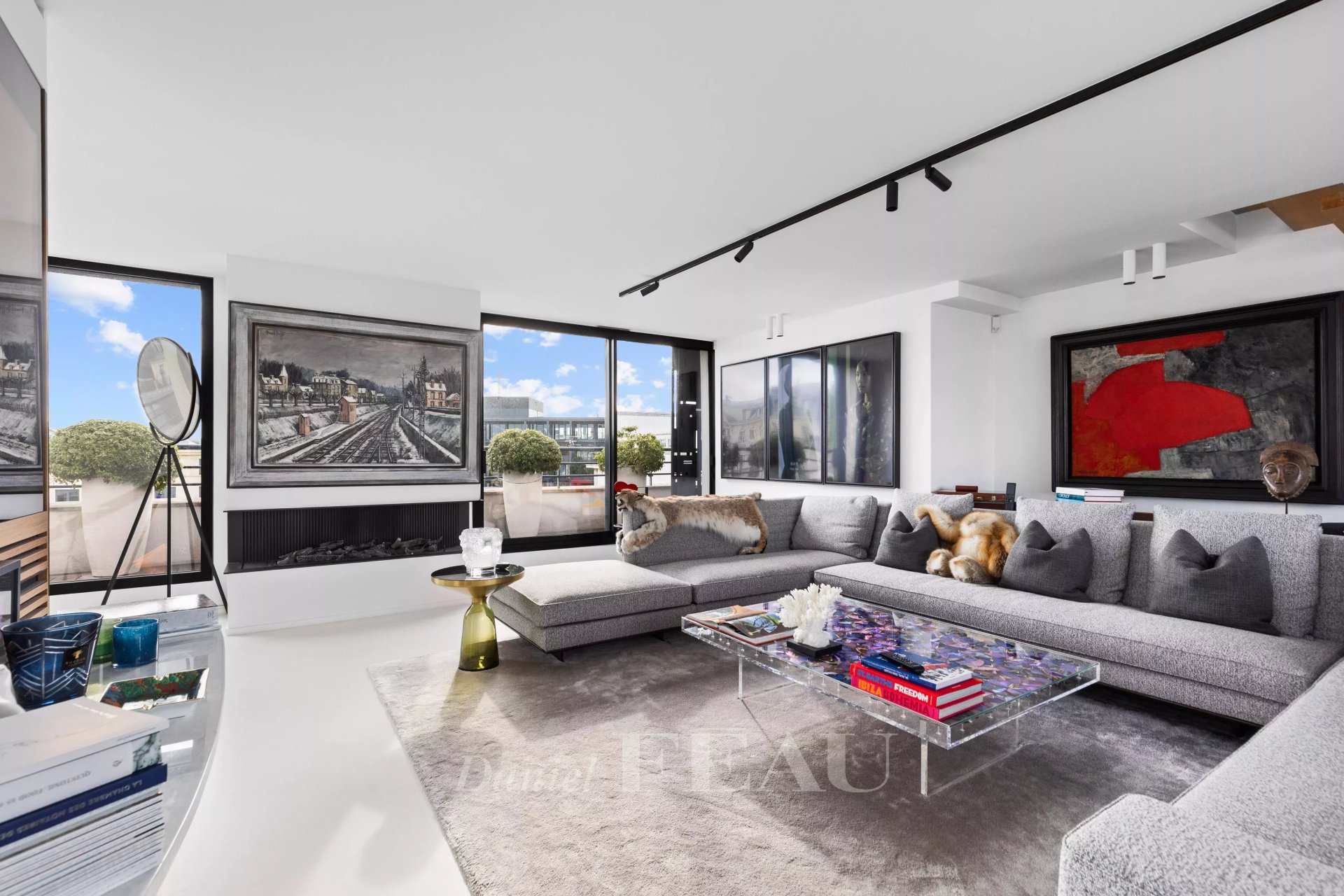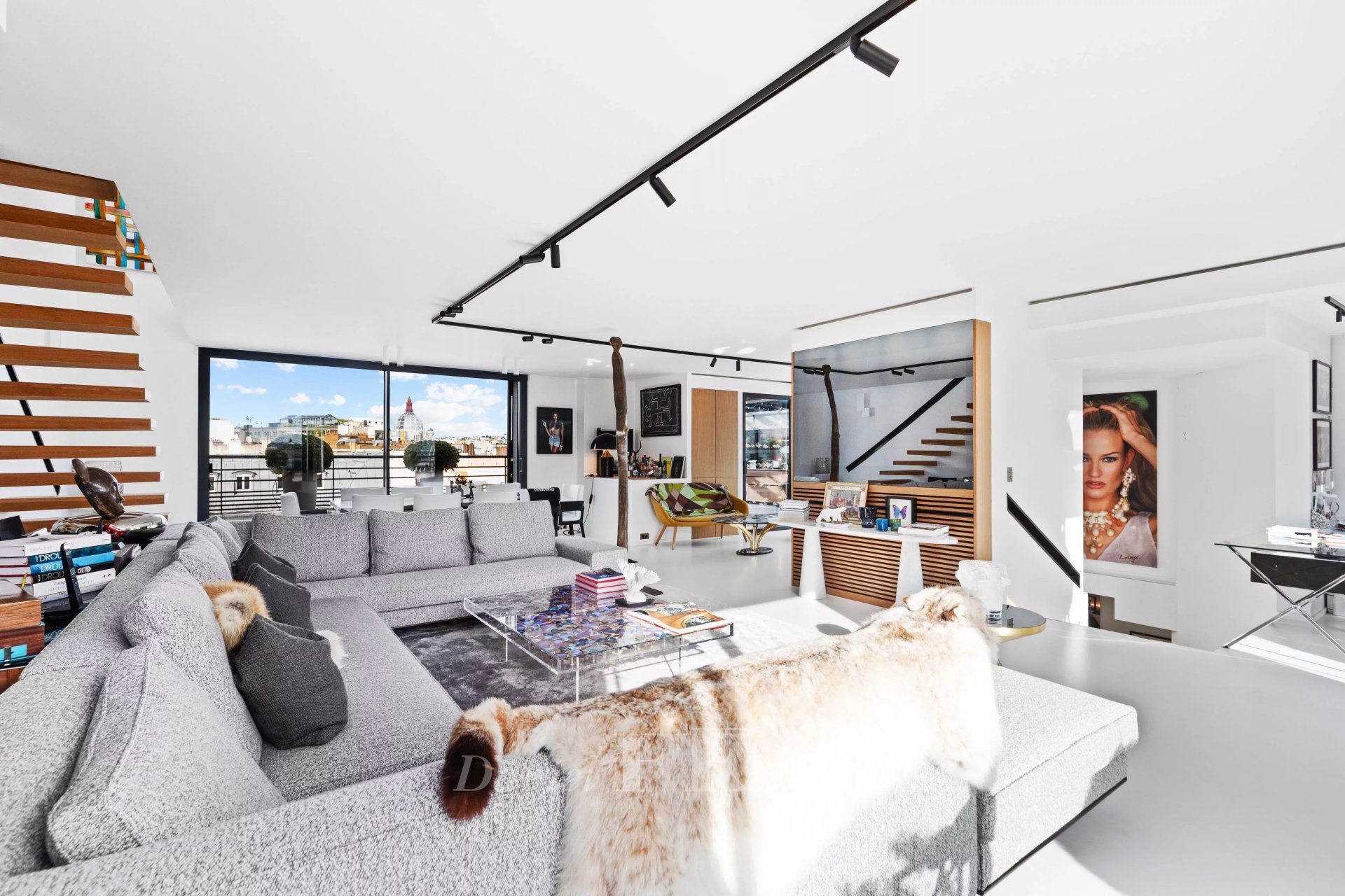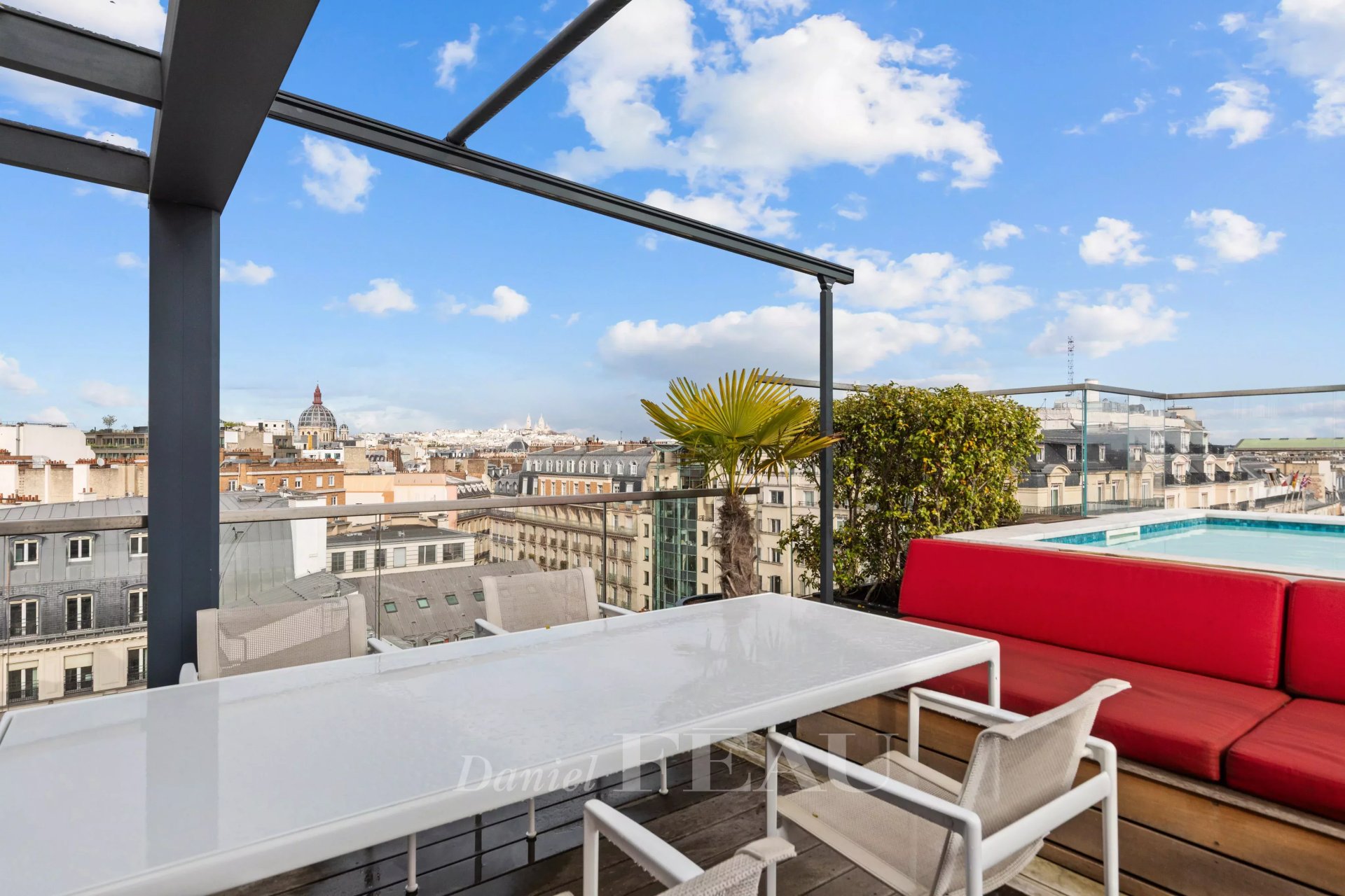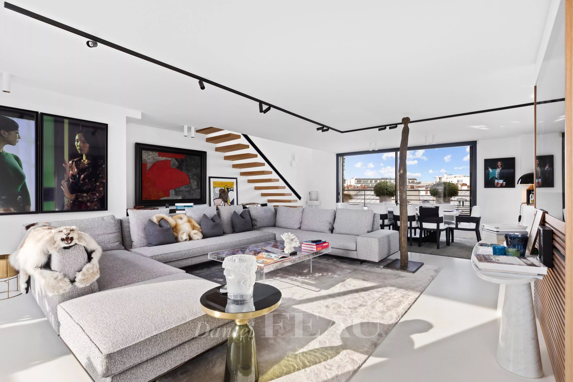 Elysée/Matignon neighbourhood. This stunning apartment offering 292 sqm of meticulously renovated living space is on the 7th, 8th and 9th floors of a recent building. Benefiting from direct lift access and boasting 163 sqm terraces, it includes a 100 sqm living/reception room with a dining room, a kitchen and a conservatory opening onto two leafy terraces enjoying views of the Grand Palais, the Eiffel Tower, Sacré Coeur Basilica and Saint-Augustin Church.