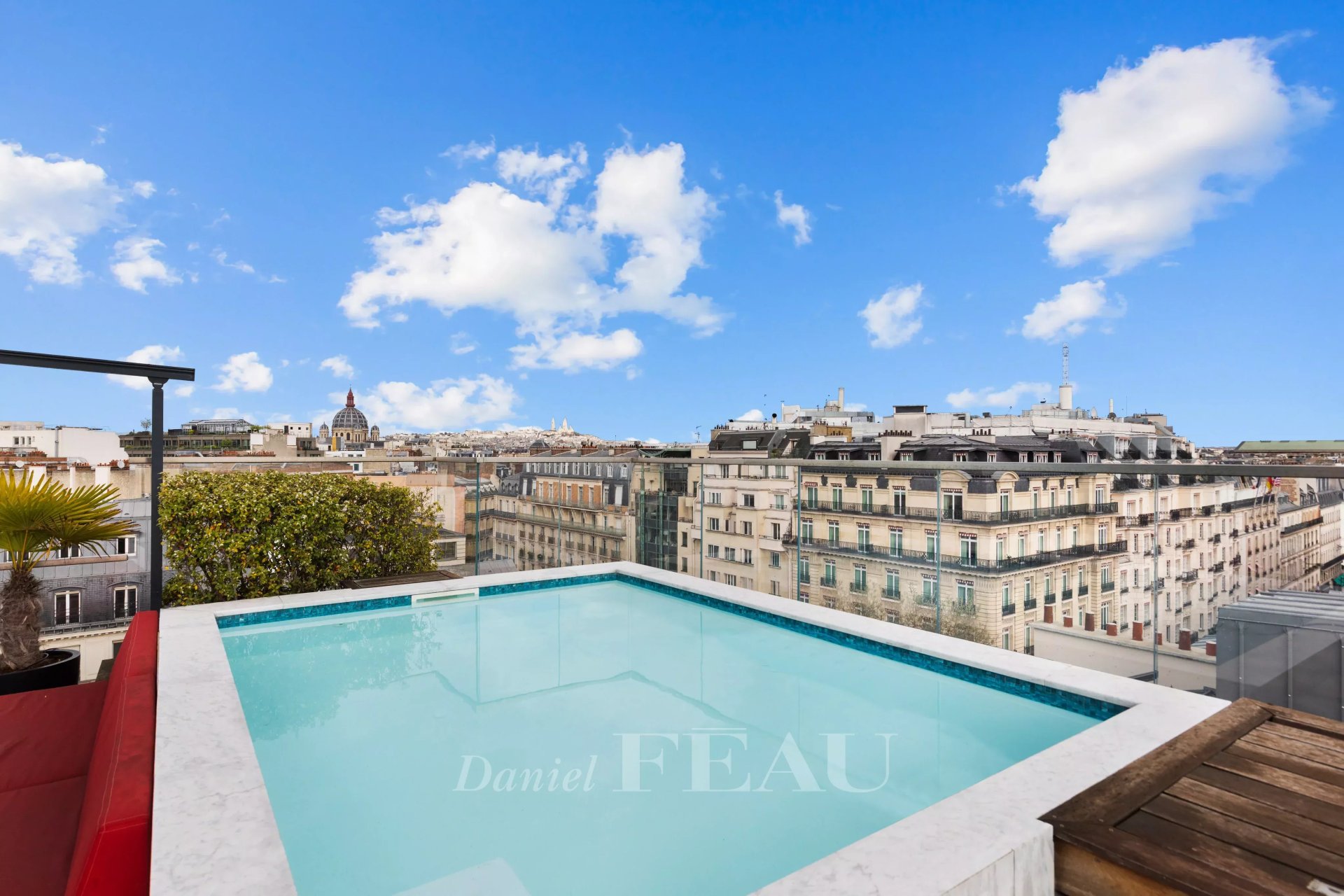 A magnificent 145 sqm roof-terrace boasting a swimming pool commands 360° views of the capital.