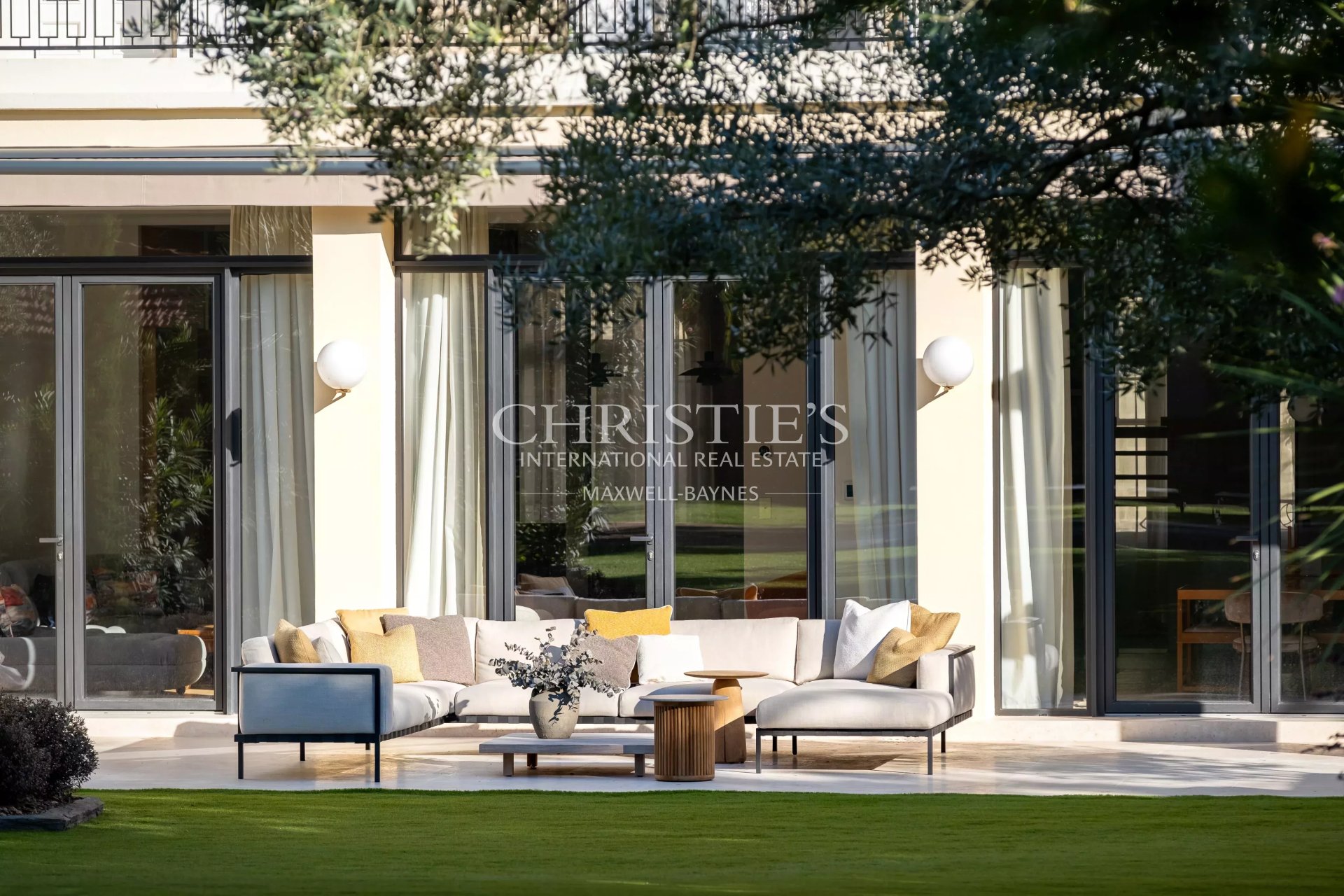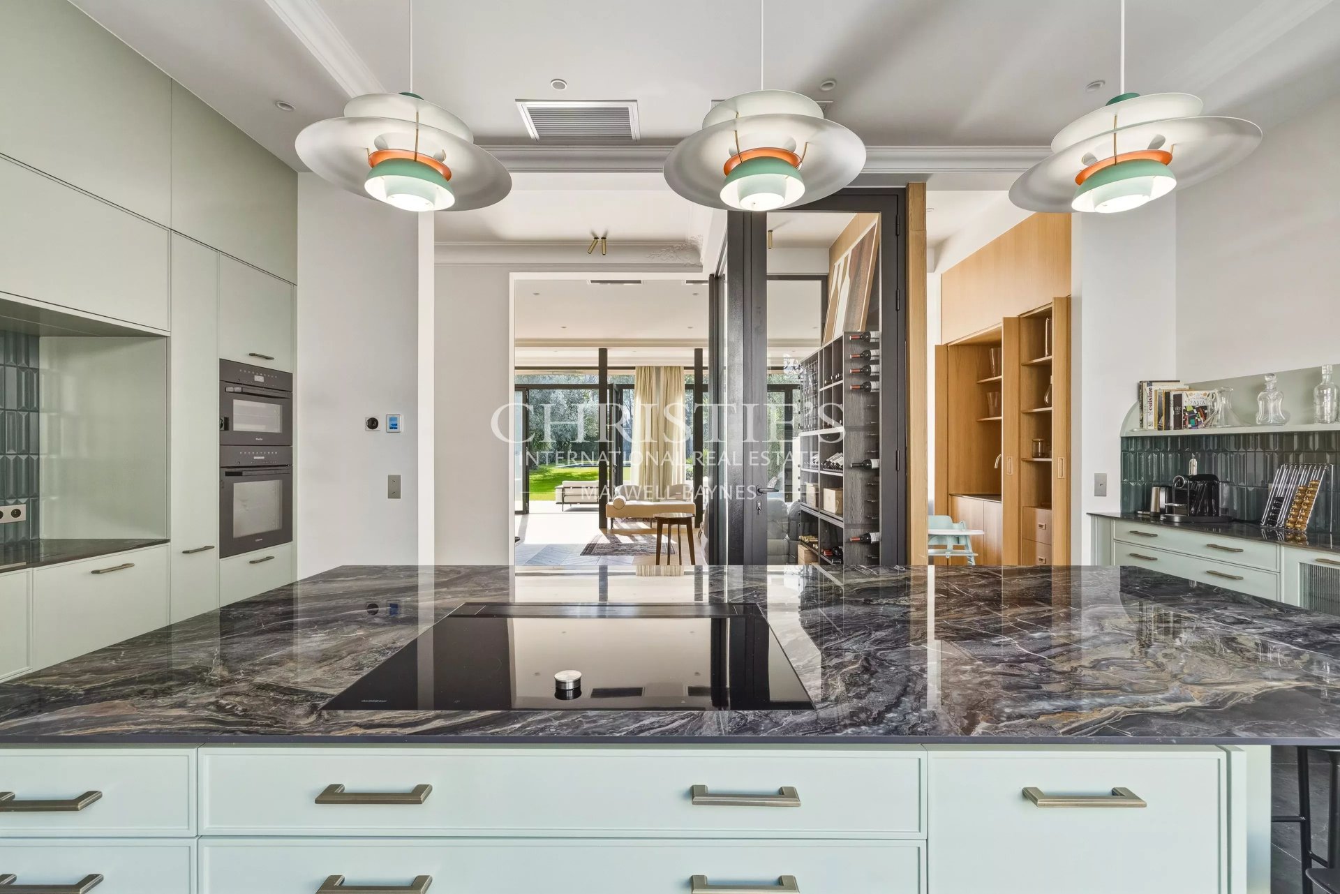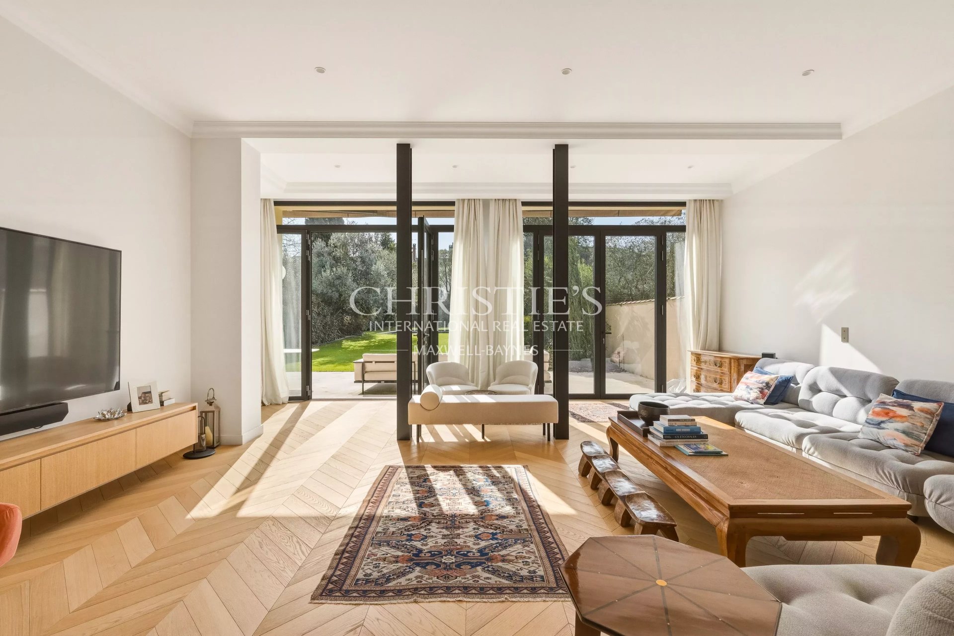 - A light-filled living room and dining room open onto the garden through large bay windows, creating a harmonious continuity between indoors and outdoors.