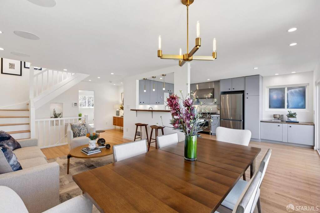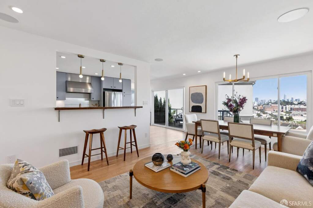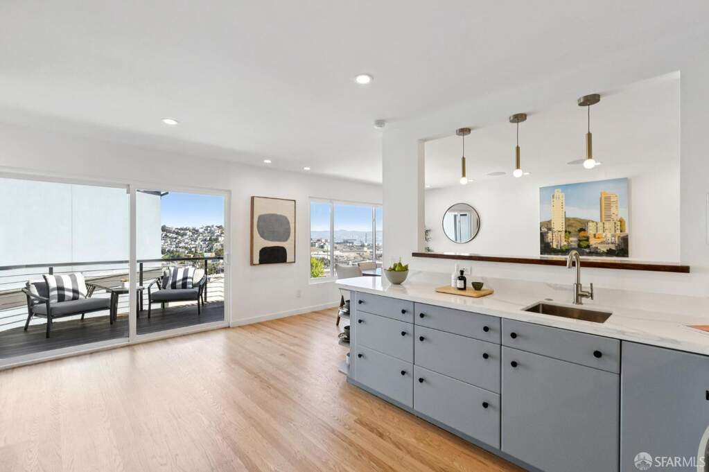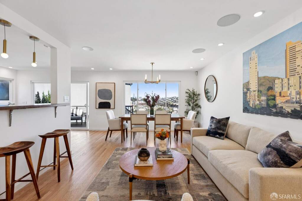 Welcome to 190 Rutledge in Bernal Heights! Some homes feature a view- but this one offers the entire suite of Bay Area landmarks- including the City skyline, Coit Tower, GG Brige & Mt. Tam, Twin Peaks & Sutro Tower, the East Bay & Mt. Diablo, even San Bruno Mountain and southerly outlooks. It's a true 360-degree panorama that is sure to wow! This gorgeous residence features three bedrooms, three baths, ~2,275 sq ft spread across four luxurious levels, three-car parking with a gated two-car pad, EV charger, and a one-car garage. And at the top, a penthouse entertainment room wrapped in all the sights. Newly refinished oak hardwoods run throughout and integrated in-ceiling speakers add to the already uplifting vibe. The main living level delivers an open kitchen, dining, and living entertainment-style floorplan. The updated kitchen centers around a new Bosch gas range and hood, Miele dishwasher, new Samsung refrigerator, new countertops, sleek cabinetry, and a breakfast bar that keeps the kitchen connected to the living space. A sliding glass door leads to a view deck off the kitchen/dining area, and a spiral staircase connects the deck to the manicured garden and slate patio below. Also located on the main floor, the primary suite features a wall of built-in closets with organizers and a travertine en-suite bath with dual vanity and shower over tub. Ascending to the next level, the home adds a second bedroom, a separate office or den, with panoramic views from both, and a full bath with floating vanity and stall shower. At the top of the home is where the entire experience crescendos- the pent-level entertainment room, which boasts huge picture windows letting in views of the entire City and surroundings. It's truly an epic feature and goes to show how special this lot is. And not to be forgotten, the entry level offers a self-contained world of its own, offering a bedroom suite and adjacent dining area/kitchenette. The kitchenette features a Miele oven, dishwasher, Artevino wine refrigerator with approximately 200-bottle capacity, and Samsung refrigerator. A full bath with floating vanity and stall shower, and direct access to the garden round out the package. Other features include solar panels and intercom. Steps from Precita Park, Cortland Avenue, Bernal Hill Park, easy commuting down the 101, or to SFO. This is a special one not to be missed!
