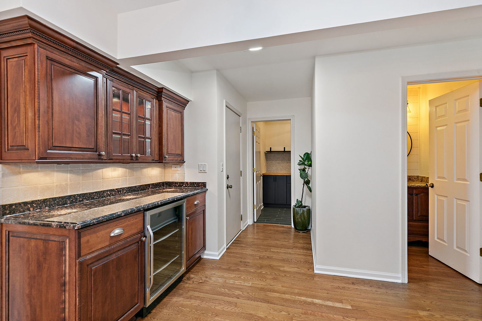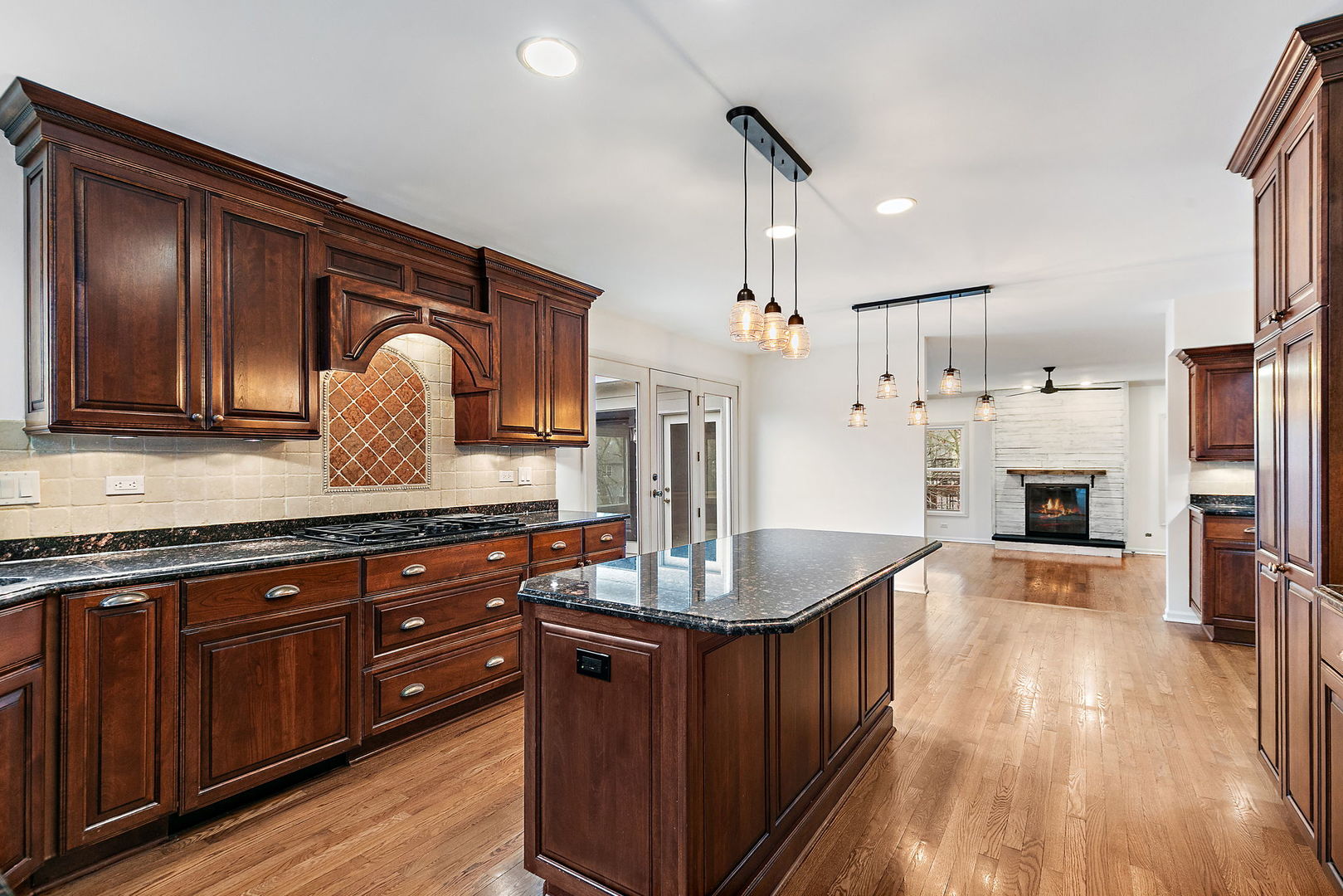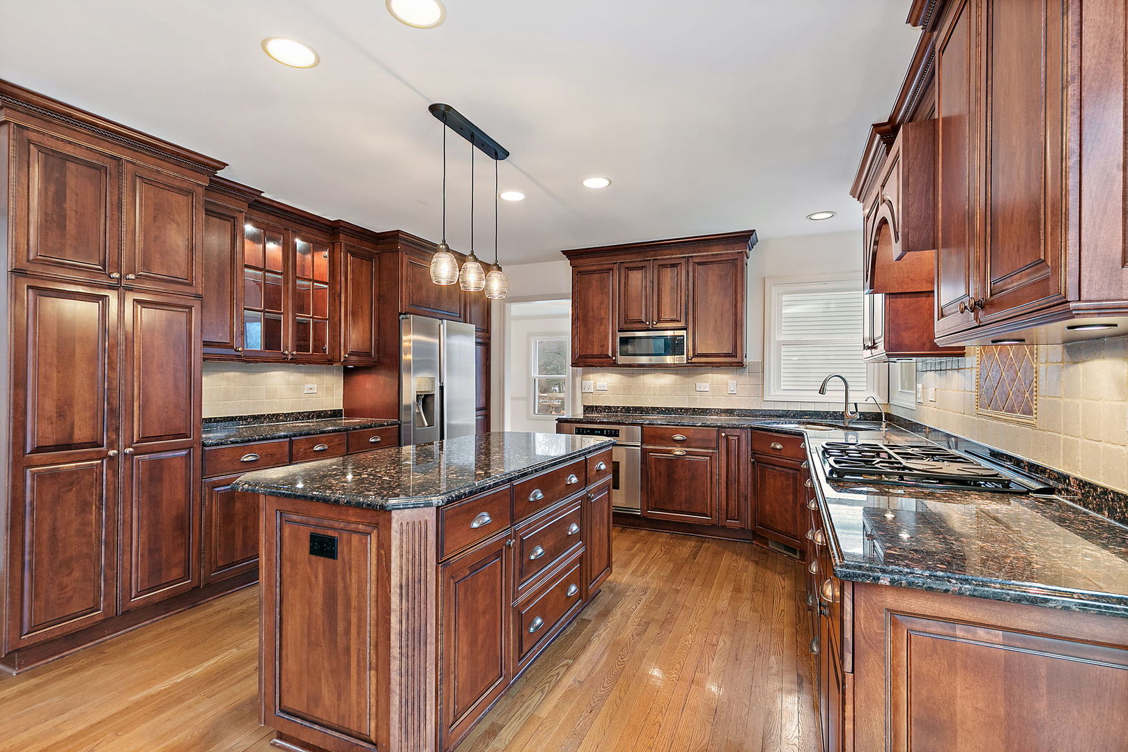 This home truly has it all! From the moment you arrive, you'll be captivated by the exceptional curb appeal. Neutral tones paired with striking black trim create a timeless exterior, while the brick-lined driveway and professional landscaping complete the picture-perfect setting. Step inside and you're welcomed by formal living and dining spaces featuring vaulted ceilings and fresh paint. The first-floor office is ideal for working from home, offering vaulted ceilings, French doors, and a stylish shiplap accent wall. The expansive kitchen is designed for both everyday living and entertaining, featuring abundant cherry-style cabinetry, granite countertops, under-cabinet and in-cabinet lighting, and a large island with a warming drawer. A beautiful butler's pantry with wine cooler adds both charm and functionality. The kitchen opens seamlessly to the inviting family room, where a cozy fireplace framed by shiplap creates the perfect gathering space. Enjoy year-round views from the stunning three-season room overlooking the private, nature-filled backyard. An updated first-floor laundry room and powder room complete the main level. Upstairs you'll find three generously sized bedrooms and a spacious hall bath with dual vanities, a large shower, and a separate soaking tub. The impressive primary suite features vaulted ceilings, a charming window seat, and a luxurious bath with dual vanities, expansive counter space, a large tiled shower, soaking tub, and heated floors. The walk-in closet is beautifully organized with a custom closet system. The full walk-out basement with soaring 12-foot ceilings offers incredible additional living space. Enjoy a dedicated workout room with mirrored wall, a game room with space for a pool table, and a deluxe bar area featuring cherry-style cabinetry, granite countertops, abundant storage, microwave, warming drawer, dishwasher, and beverage refrigerator. A dramatic floor-to-ceiling stone fireplace creates a warm and inviting atmosphere. The lower level also includes a full bath with a relaxing steam shower. Outdoor living is just as impressive, with a spacious deck w/ new Weber gas grill, expansive paver patio, and a large backyard with storage shed, all backing to peaceful wooded views. Most recent Newer big ticket items in the home include A/C 2022, Windows 2021 and washer and dryer in 2024. Ideally located within walking distance to the park, river, train, shopping, and middle school, this exceptional home offers comfort, style, and convenience in one incredible package.