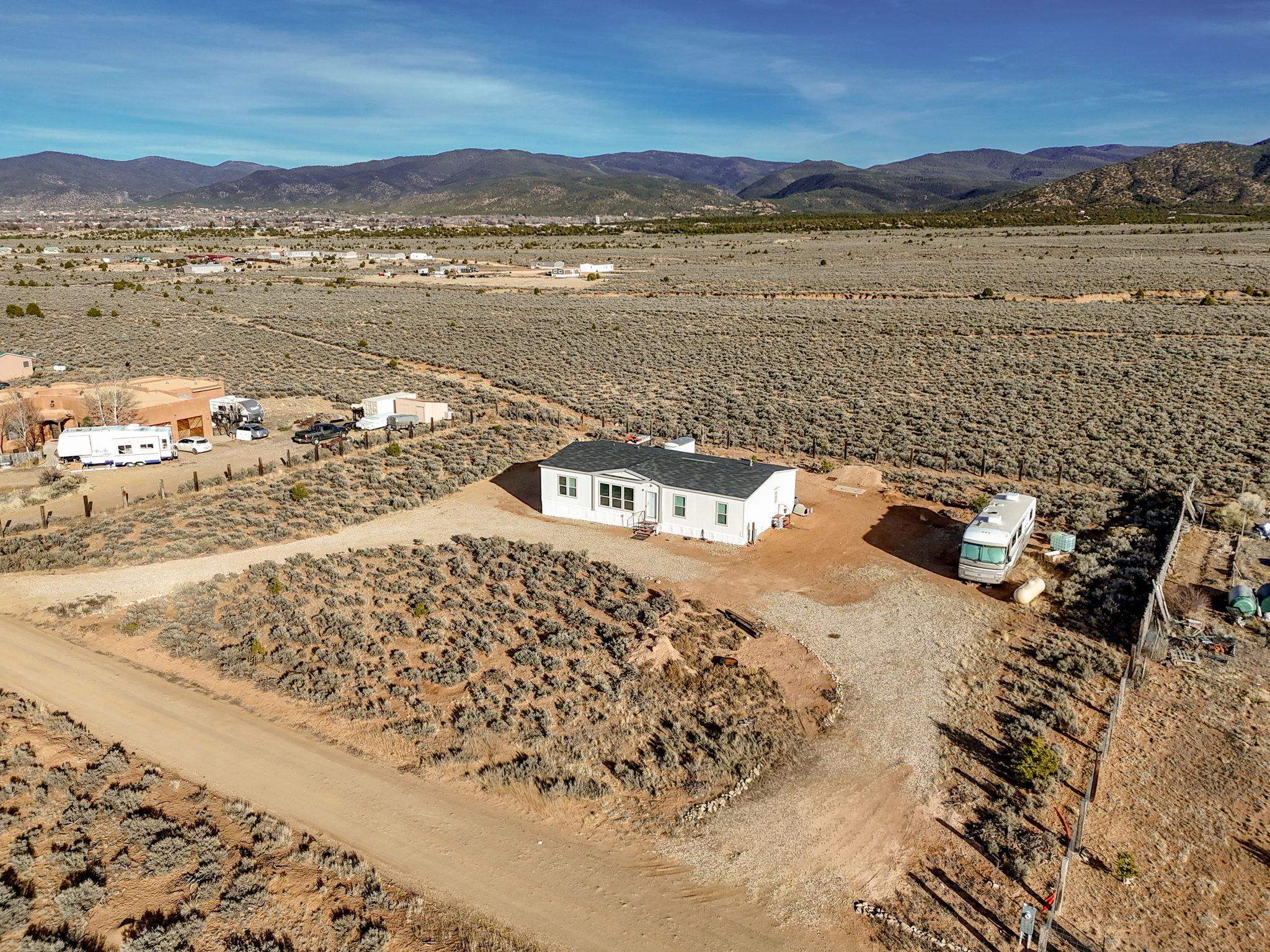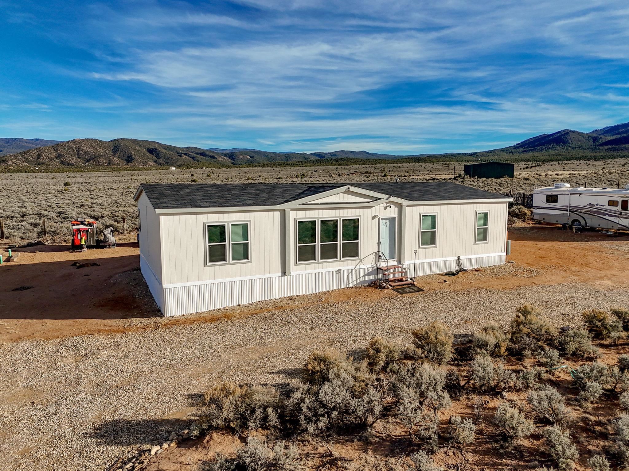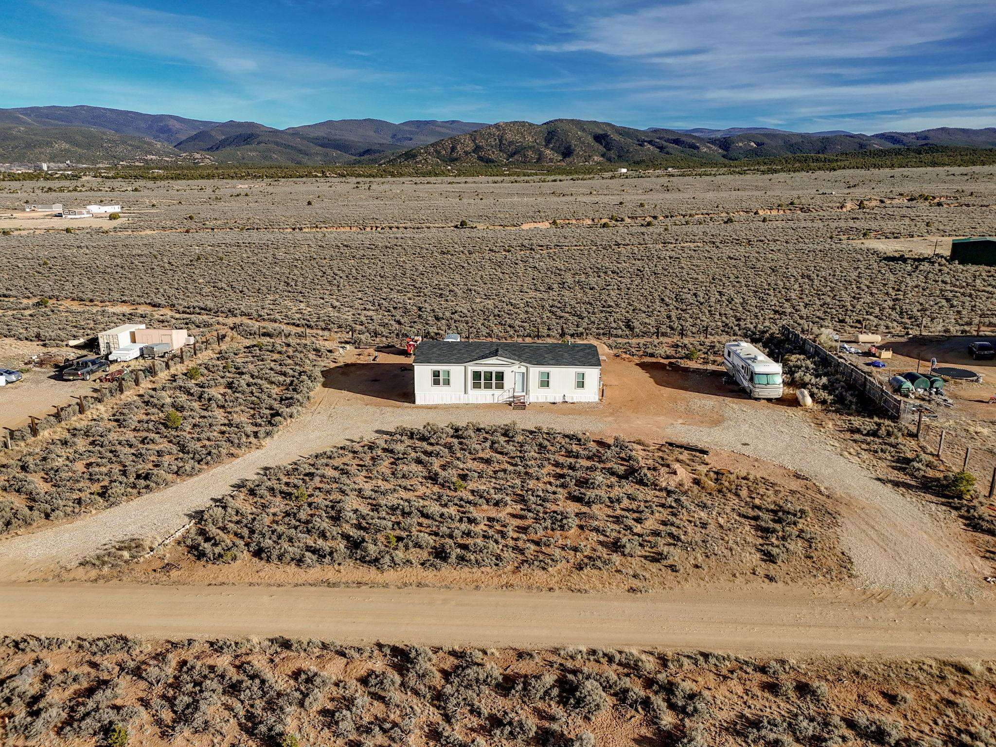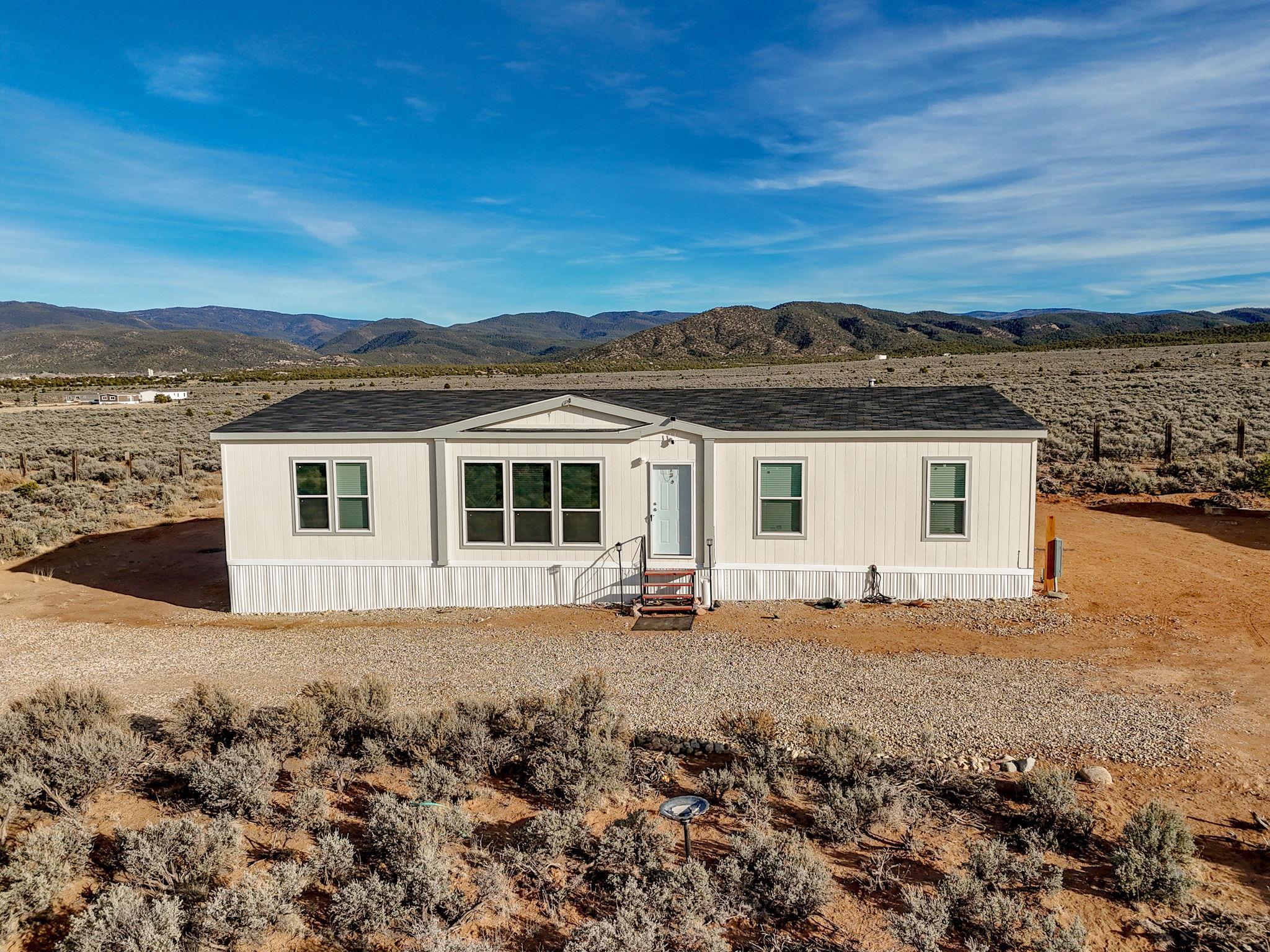 Experience wide-open skies and breathtaking 360 views from this beautifully situated 2025 Champion manufactured home on a permanent foundation. With 3 bedrooms, 2 bathrooms, and approximately 1,680 square feet, this lightly lived-in home offers modern comfort in a serene, expansive setting. Set on a full acre of flat, buildable land, the property captures sweeping views across the valley to Taos Mountain, the Gorge Rim, and beyond. Located at the end of a quiet road, you'll enjoy privacy and peace while remaining just 8 minutes to Taos Country Club and 13 minutes to the Taos Plaza, close to everything, yet comfortably removed from the hustle and bustle. The home features newly installed septic, water line, propane, and electric service, providing confidence and convenience for its next owner. With minimal restrictions and ample space for expansion, gardens, or additional structures, this property offers both flexibility and opportunity. Priced to sell, this is your chance to own an affordable and beautiful slice of Taos with unmatched views and room to breathe.