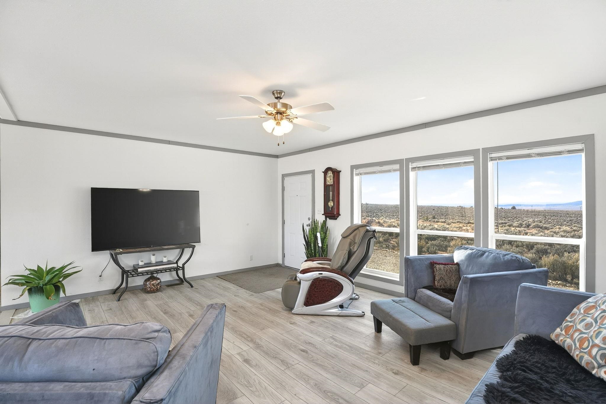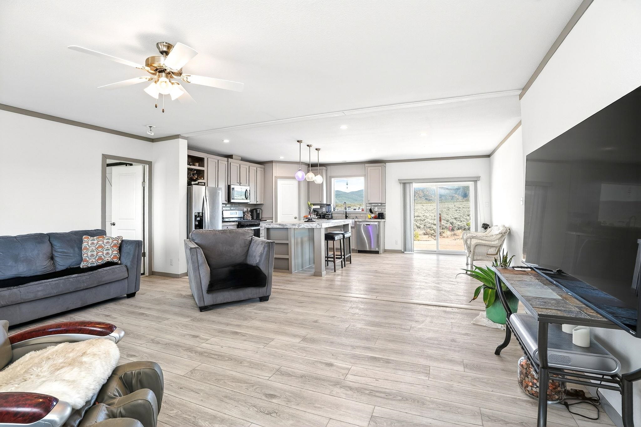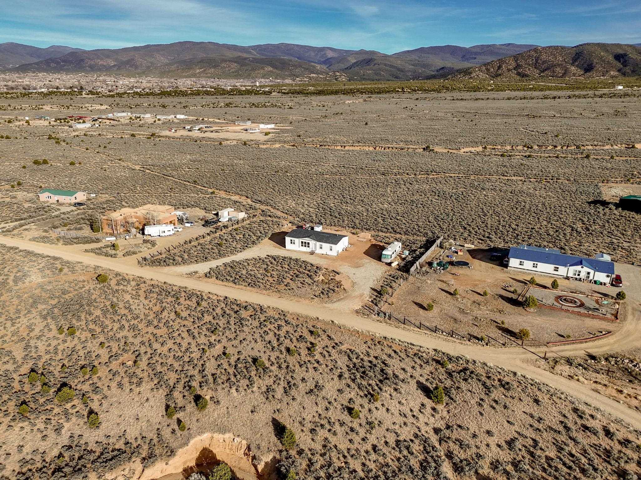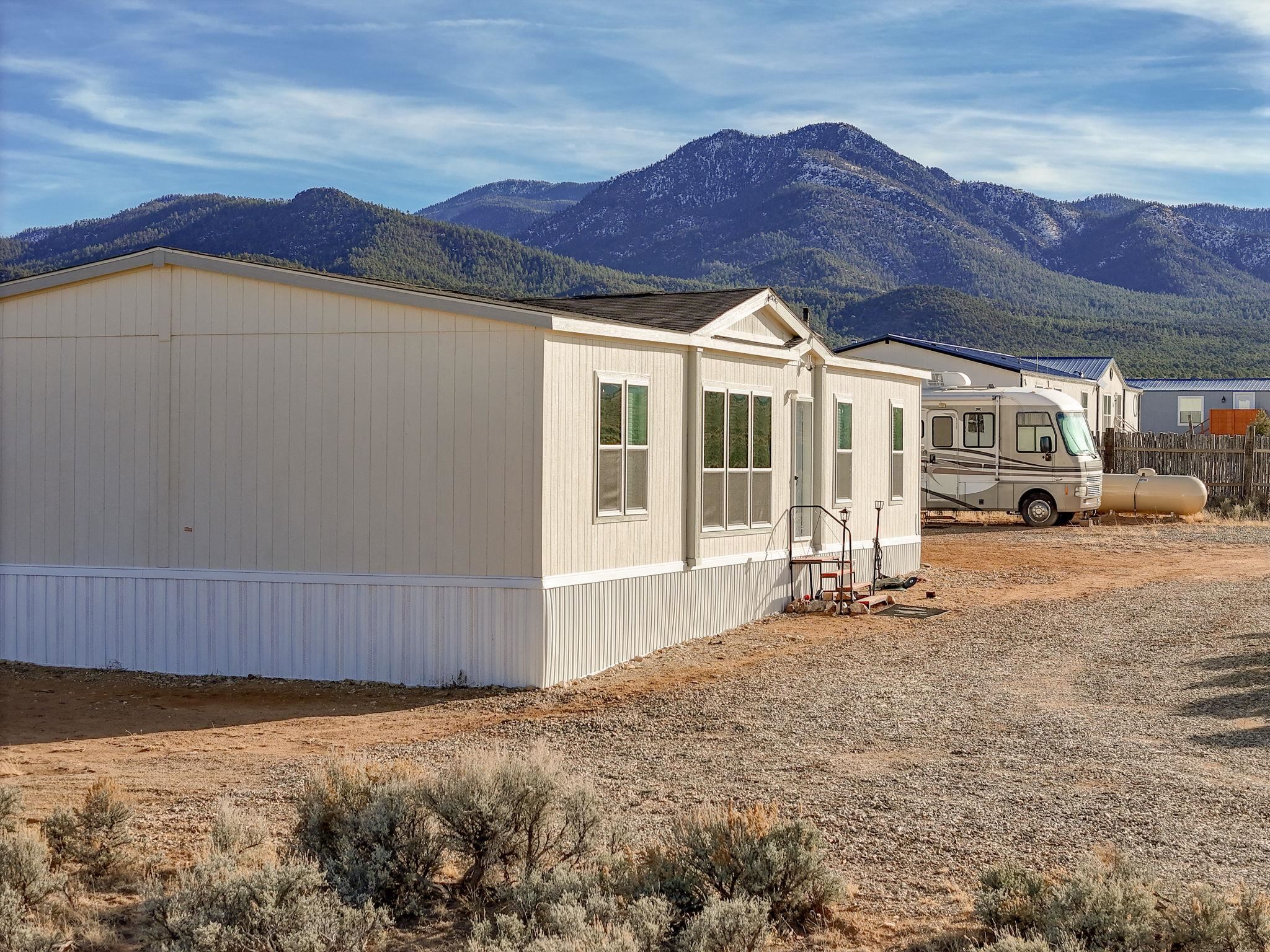Experience wide-open skies and breathtaking 360 views from this beautifully situated 2025 Champion manufactured home on a permanent foundation. With 3 bedrooms, 2 bathrooms, and approximately 1,680 square feet, this lightly lived-in home offers modern comfort in a serene, expansive setting. Set on a full acre of flat, buildable land, the property captures sweeping views across the valley to Taos Mountain, the Gorge Rim, and beyond. Located at the end of a quiet road, you'll enjoy privacy and peace while remaining just 8 minutes to Taos Country Club and 13 minutes to the Taos Plaza, close to everything, yet comfortably removed from the hustle and bustle. The home features newly installed septic, water line, propane, and electric service, providing confidence and convenience for its next owner. With minimal restrictions and ample space for expansion, gardens, or additional structures, this property offers both flexibility and opportunity. Priced to sell, this is your chance to own an affordable and beautiful slice of Taos with unmatched views and room to breathe.