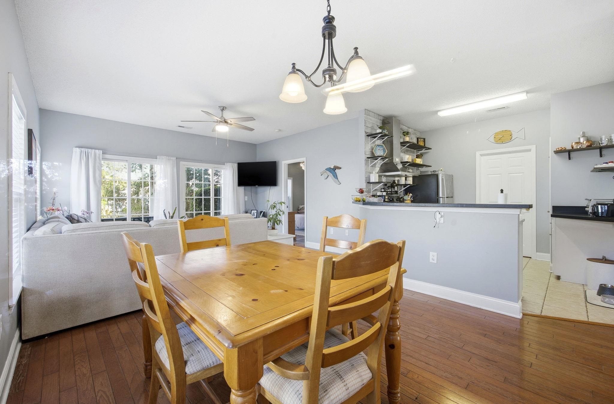 Beautifully maintained 3-bedroom, 2-bath first-floor end-unit condo located in the desirable gated community of The Fountains. This move-in-ready home features fresh paint and tasteful upgrades throughout, including LVP flooring in the primary bedroom, wood-look tile in the two additional bedrooms, and hardwood flooring in the living and dining areas. New, modern and unique ceiling fans are in every room. The bright, open kitchen boasts granite countertops, stainless steel appliances, a sleek stainless hood vent, and a designer shiplap accent wall with open shelving. A spacious laundry room just off the kitchen offers built-in cabinetry and extra storage. All appliances convey, including washer, dryer, refrigerator, oven, and dishwasher. The primary suite includes an en-suite bath, a walk-in closet. Additional bedrooms also have walk-in closets. A recently tiled storage closet is located off the front patio. This end unit is filled with natural light and features a screened-in Carolina room overlooking the woods, offering added privacy and a peaceful setting.The gated community offers a pool and is ideally located - approximately 10 minutes to Conway Medical Center, 15 minutes to Tanger Outlets (via Postal Way, avoiding Highway 501), close to restaurants, and just 25 minutes to the beach. Can include most furniture. Added bonus: upstairs neighbors live out of state and only visit a few times a year.