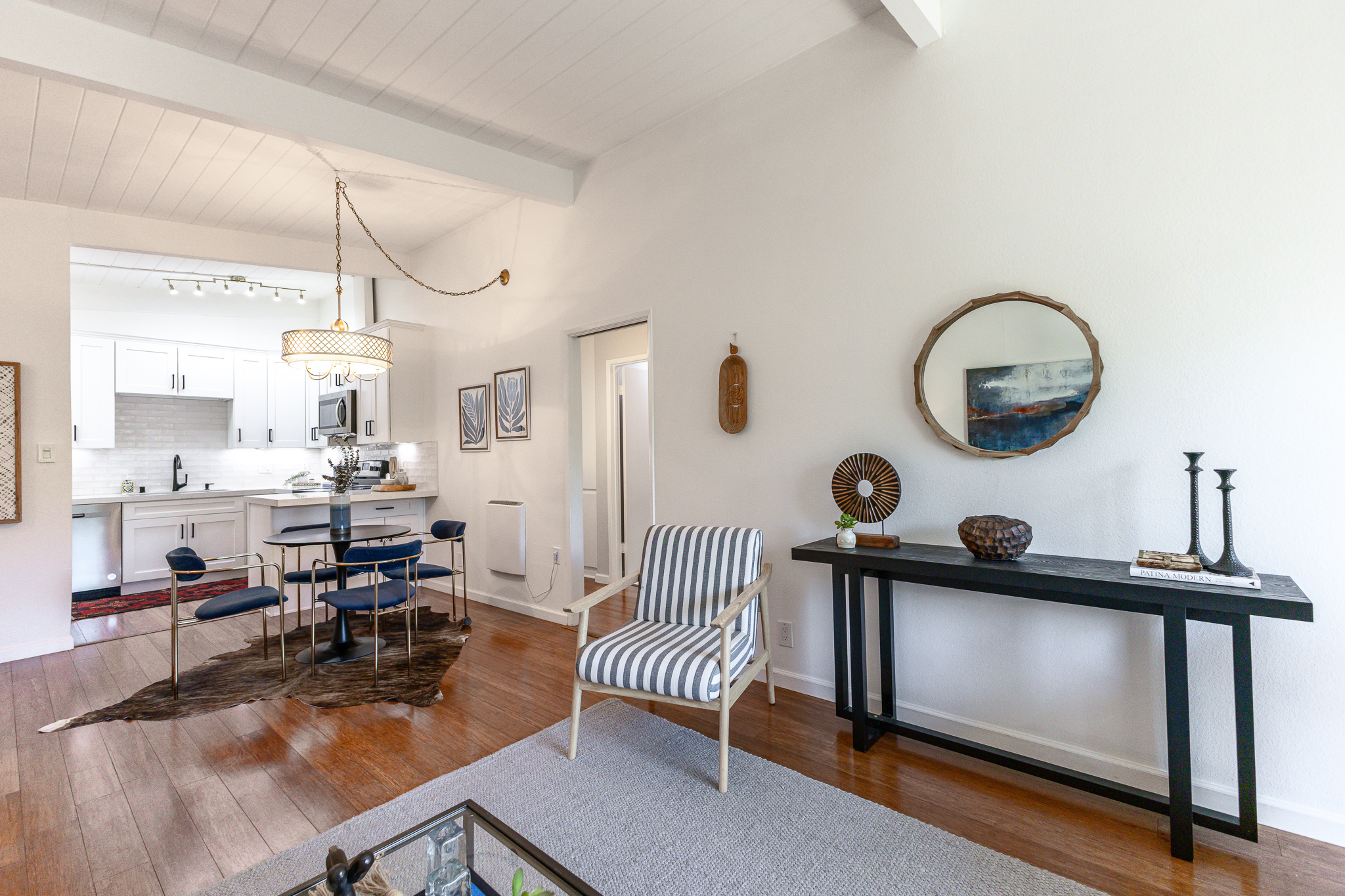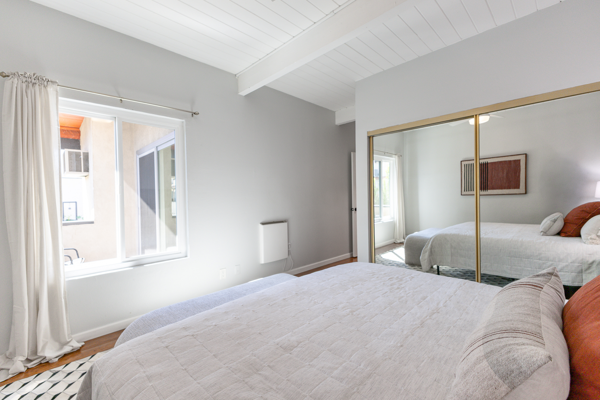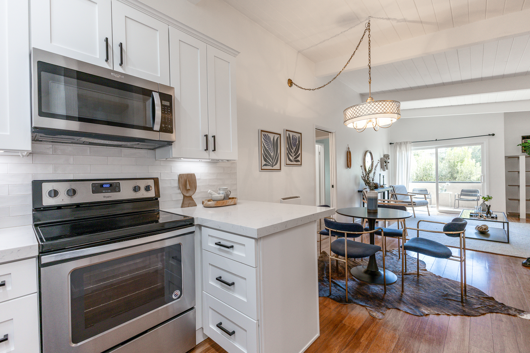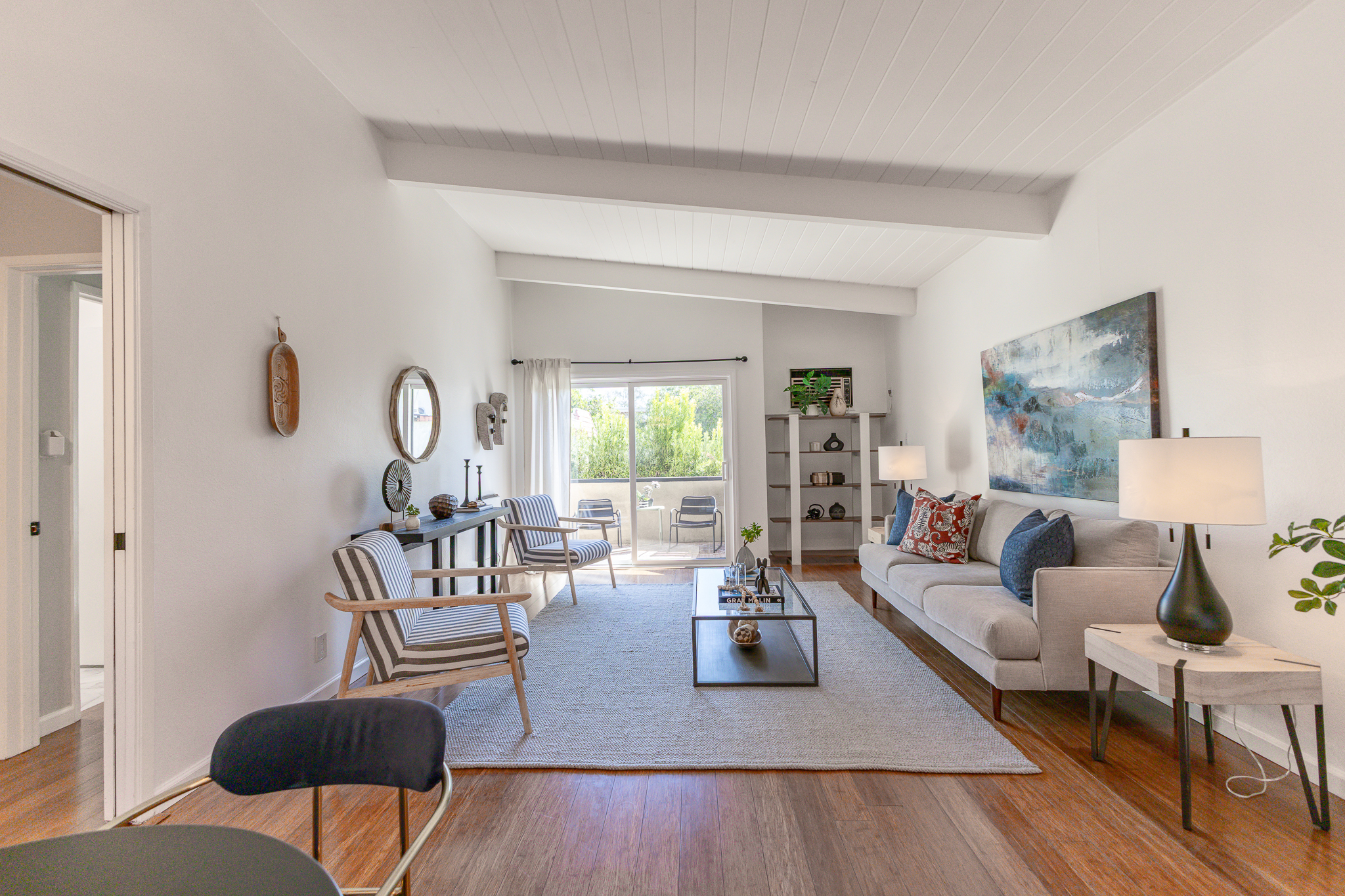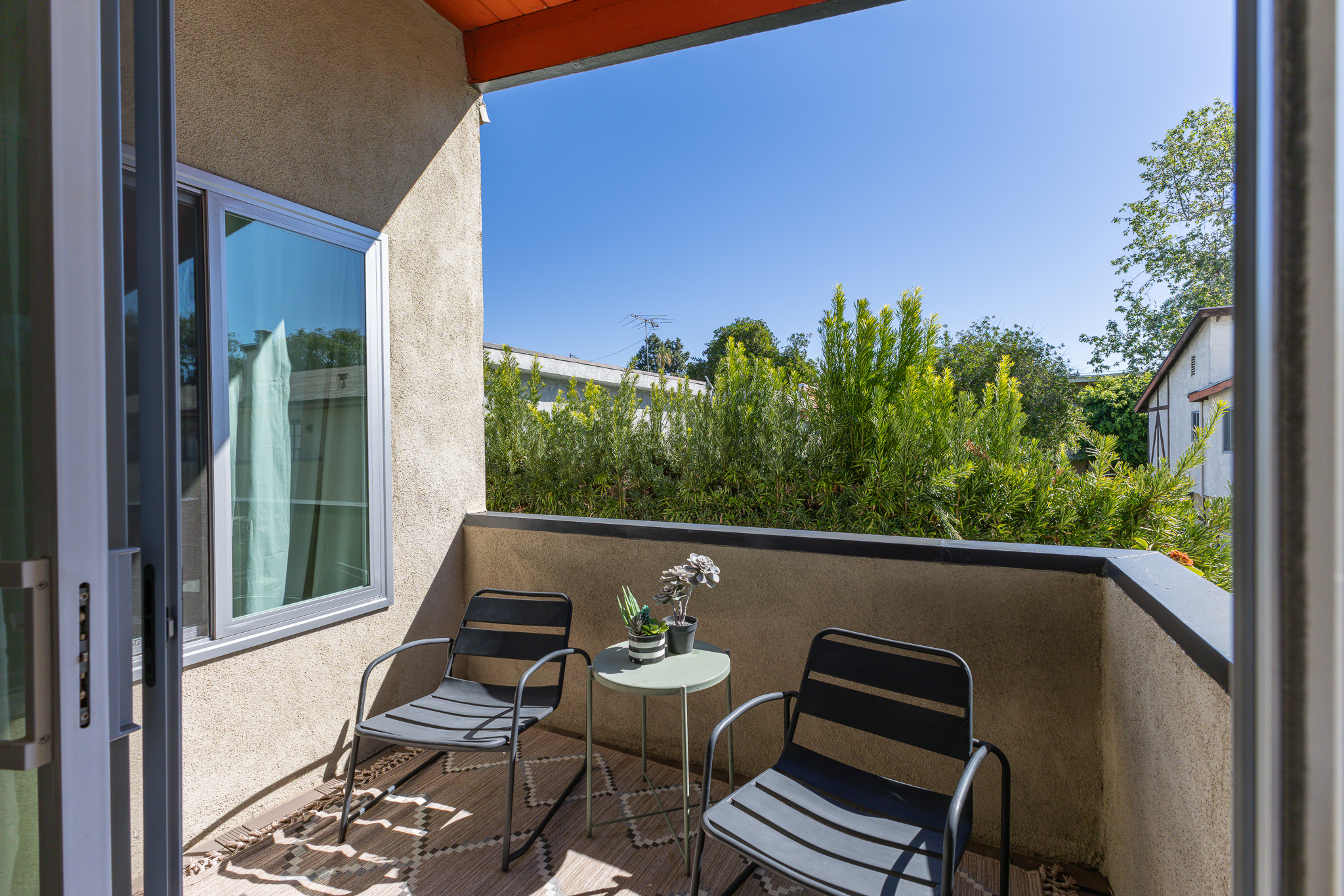 This light-filled 2-bedroom, 2-bathroom condo is ideally located in the prime Valley Village area of Studio City. Charming top-floor unit features soaring beamed wood ceilings and beautiful engineered hardwood floors throughout. The bright and open living room is perfect for relaxing or entertaining and opens to a private balcony overlooking the pool, an ideal spot for enjoying morning coffee or evening sunsets. The kitchen has been tastefully remodeled with upgraded appliances and convenient under-cabinet lighting, creating both style and functionality. The primary bedroom offers a spacious retreat with an en-suite bathroom featuring newly remodeled tile and updated fixtures. Both bathrooms include skylights, bringing in abundant natural light. Additional upgrades include energy-efficient windows/sliding door, an upgraded electrical panel, and sleek ENVI wall heaters that are both energy-efficient and streamlined in design. The well-maintained gated complex features attractive front landscaping, a pool and deck for lounging, resurfaced common areas, copper plumbing throughout, and a newer roof. The unit includes one covered, secure parking space conveniently located near the unit along with storage above. Enjoy a fantastic location close to everyday conveniences such as Starbucks and Gelson's Markets, along with nearby shops, restaurants, and markets. You'll also appreciate the easy access to the upscale dining and boutique shopping along Ventura Boulevard.