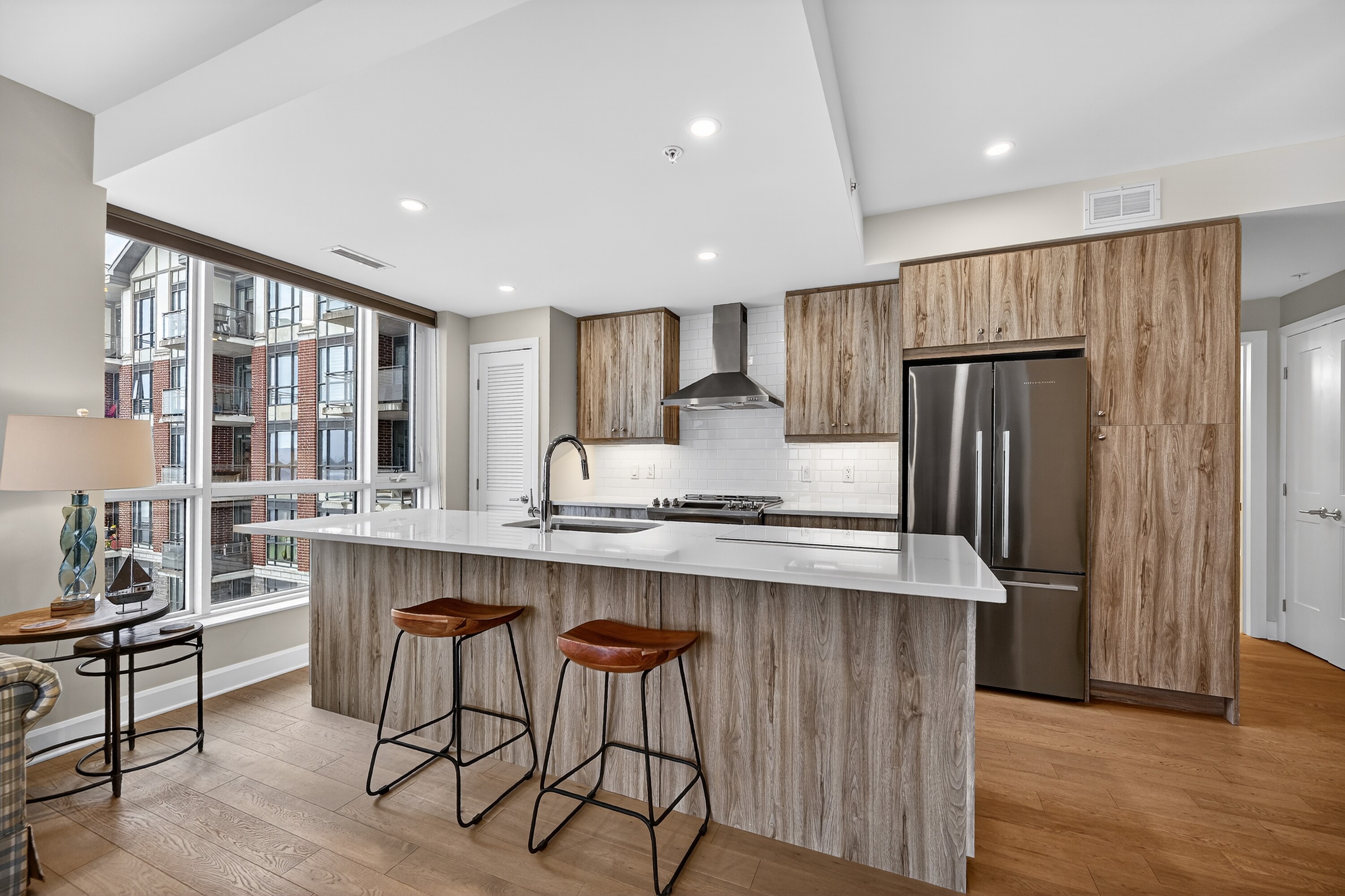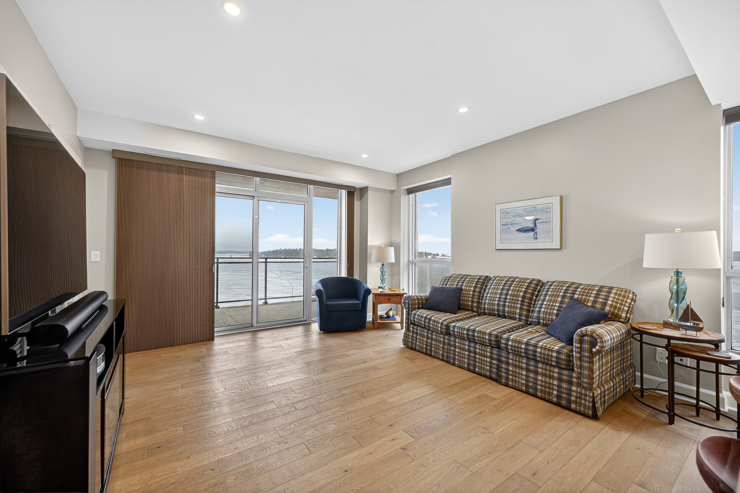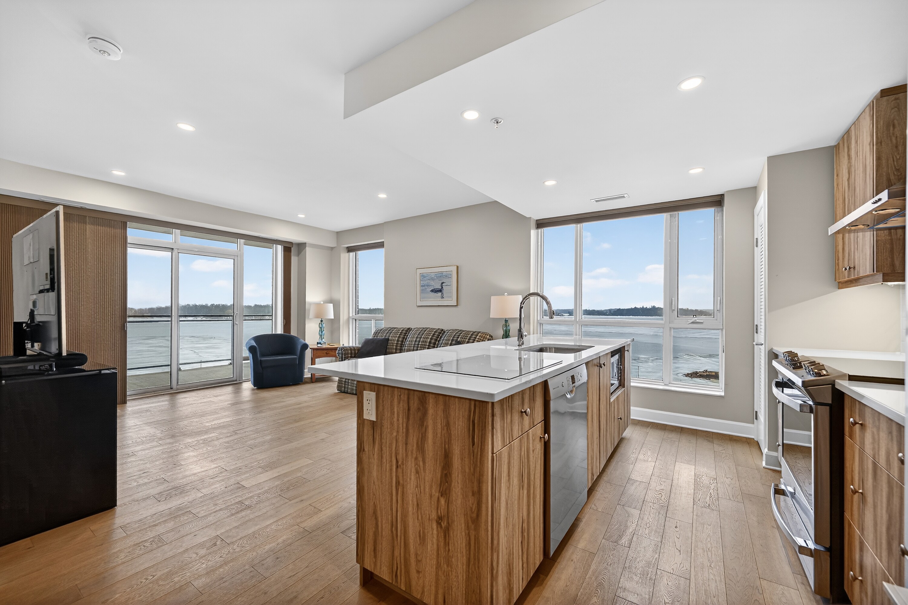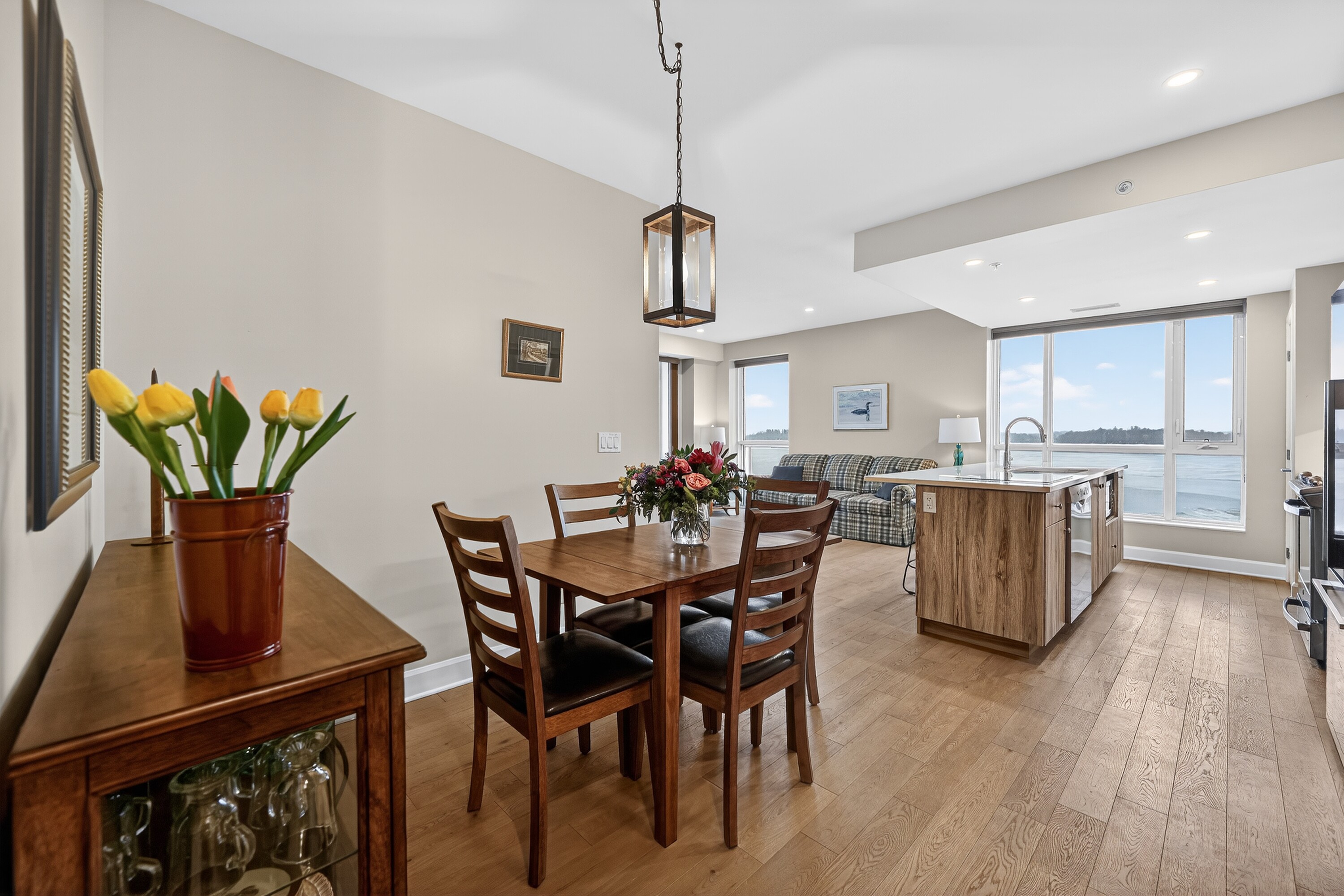 Take note of this luxury Thousand Islands waterfront two bedroom, two bathroom condominium available with flexible possession. Imagine spending the summer by the river with marina access and within walking distance of everything you need to enjoy the beauty and charm of this unique area. Your condominium features hardwood and ceramic floors, a chef's dream kitchen with an extended island and added cupboard space, in-suite laundry, and an ensuite bathroom with heated floors. Most importantly, it offers a panoramic view of the St. Lawrence River with a wraparound balcony to fully enjoy it. Click through the photos or take the tour to see how the outdoors pours into all the bright, airy spaces. Temporary rain keeping you indoors? Slip downstairs to the common room for a game of pool or some social interaction, visit the high-end gym and workout space, or simply watch the clouds roll by from your floor-to-ceiling windows. Walk to the Thousand Islands Playhouse, restaurants, and all the cultural panache Gananoque has to offer. Your storage locker is just down the hall for easy access. The perfect setup for years of enjoyment is waiting for you.