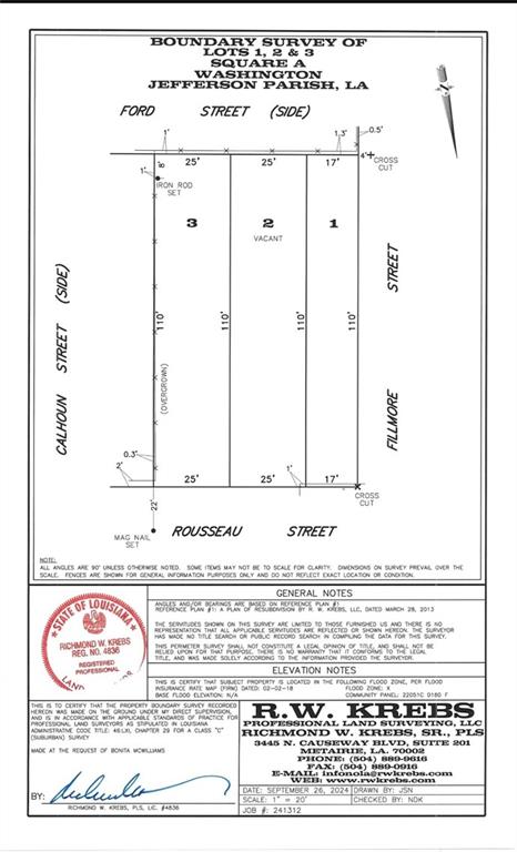 Don't miss this rare opportunity to own a triple lot (Lots 1-3) on Rousseau Street in the heart of Kenner. Situated in an established neighborhood near schools, parks, shopping, and major thoroughfares, this spacious parcel offers endless possibilities - build your dream single-family home with an expansive yard, or explore multi-lot development potential. Prime location - just five minutes from the New Orleans Saints Training Facility, Jefferson Performing Arts Center, and NOLA Gold Rugby Stadium, and only one block off Airline Highway for quick access to I-10 and the Louis Armstrong New Orleans International Airport. Zoned for residential use, the property offers both flexibility and value in a growing market, blending suburban comfort with city convenience. Lot Dimensions: 67' x 110' Total Size: 7,370 sq ft Utilities: Available at the street Flood Zone: X (per FEMA map - buyer to confirm) Vacant land in this area is scarce - act fast! Contact us today for more details. Land survey provided by sellers.