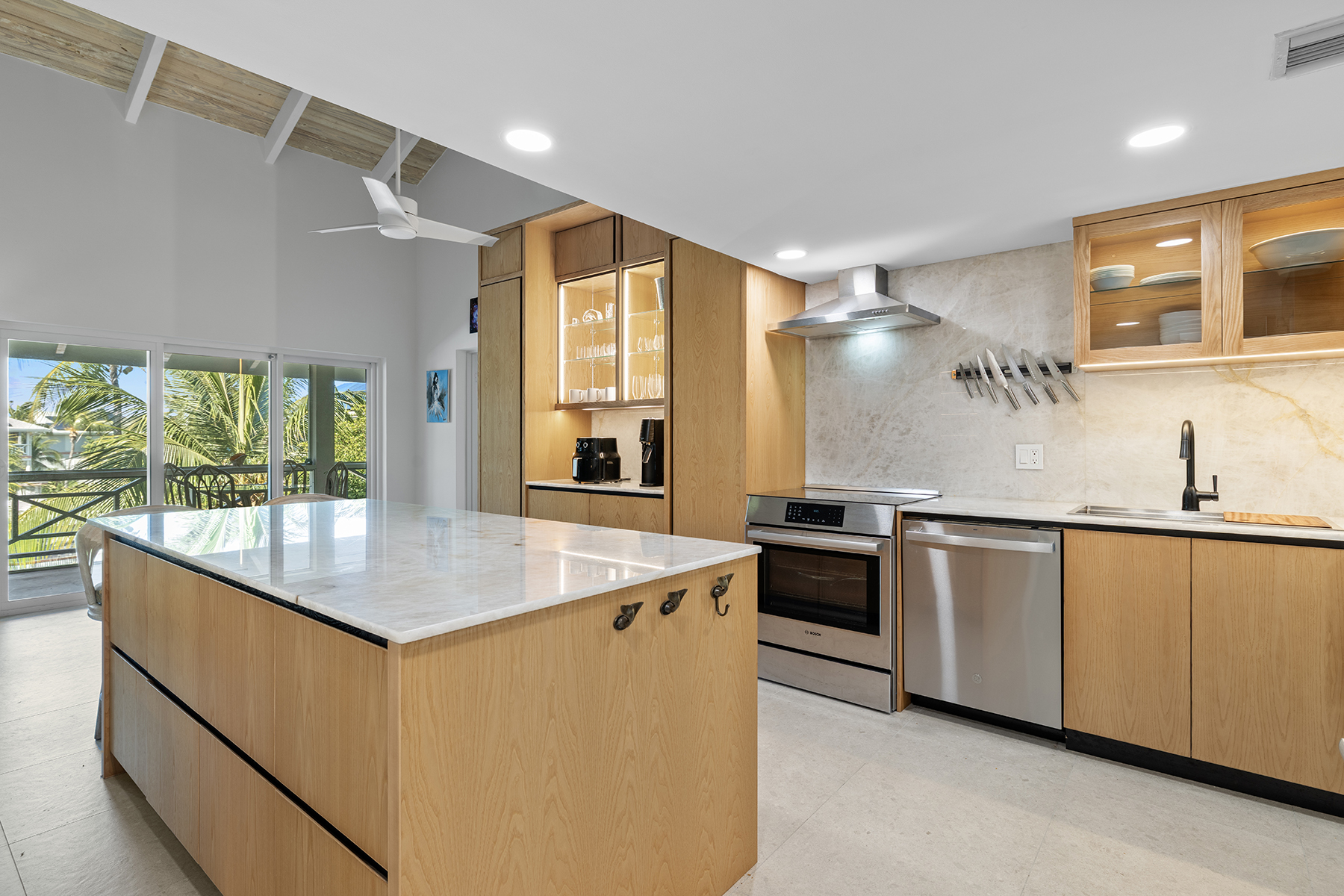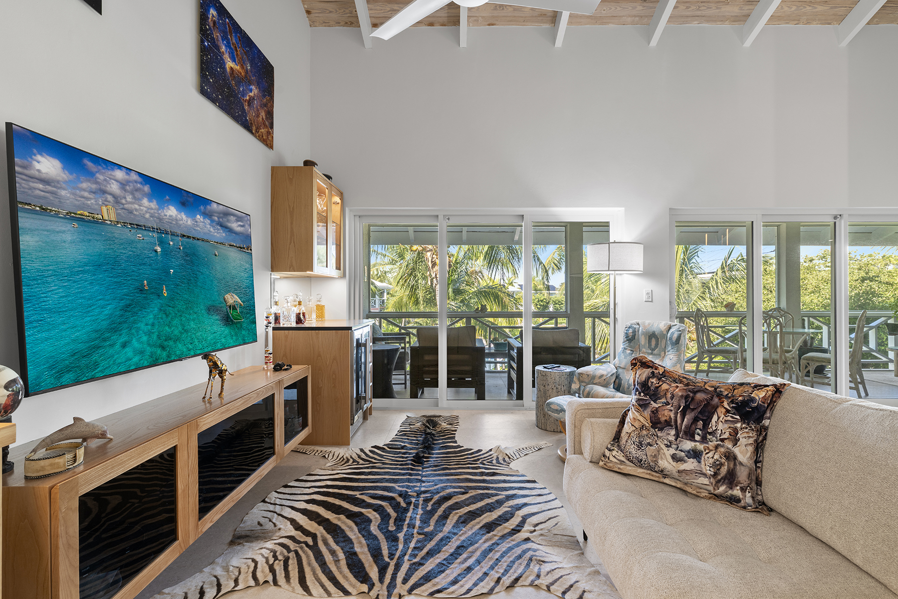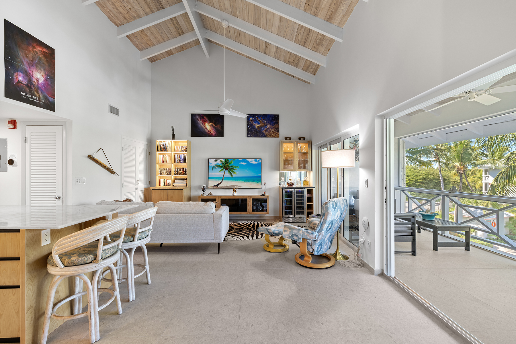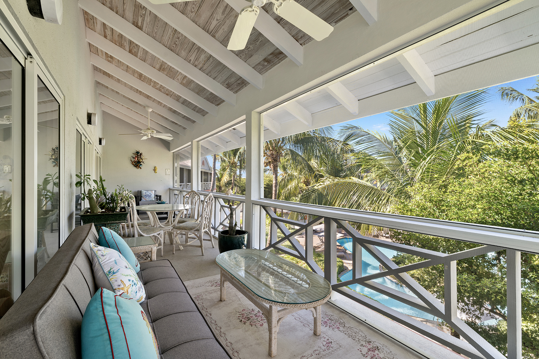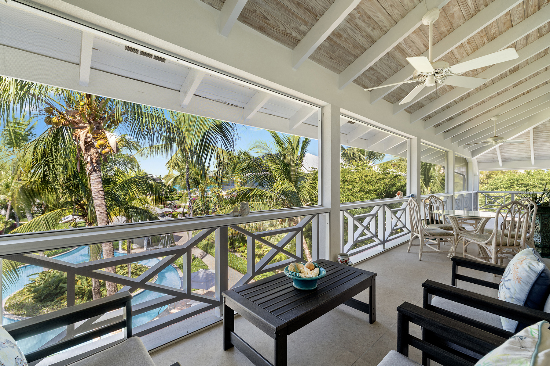 This beautifully renovated 2-bedroom, 3-bathroom pool view condo located on the top floor at Ocean Club East, offers spacious living in one of the most desirable locations on Grace Bay Beach. Overlooking the resort’s lush tropical landscaping and pool area, this 1,646 s.f. condo is just steps from the sun and sand of Grace Bay Beach and The Royal Turks and Caicos Golf Club a mere 5 minute walk with your clubs. The interior has been recently upgraded throughout the main living area, kitchen and bathrooms, creating a fresh and modern interior. The updated kitchen features beautiful quartz countertops and backsplash, stylish wood cabinetry and brand new Bosch appliances. The central island provides work space functionality, extra storage and a stylish focal point for entertaining or casual dining. The main living area is enhanced by 15’ open rafter vaulted ceilings, creating an open, airy atmosphere filled with natural light. A large wrap-around screened balcony extends the living space outdoors providing a relaxed setting with garden and pool views, outdoor dining and gentle island breezes. The resort enjoys its own on-site restaurant The Cabana Bar and Grill and is a quick walk to other popular dining destinations such as Opus Wine Bar & Grill, Ricky’s Flamingo Cafe and #19 Bar and Restaurant at the RTCGC. The Grace Bay tourist zone and amenities are only a 3 minute drive along Grace Bay Road which contributes to Ocean Club’s loyal guests returning year after year. This turnkey condo is currently a dedicated residence and presents an immediate opportunity for those seeking a vacation home and vacation rental investment offering modern upgrades, generous indoor-outdoor living, and direct access to the vibrant Grace Bay lifestyle.