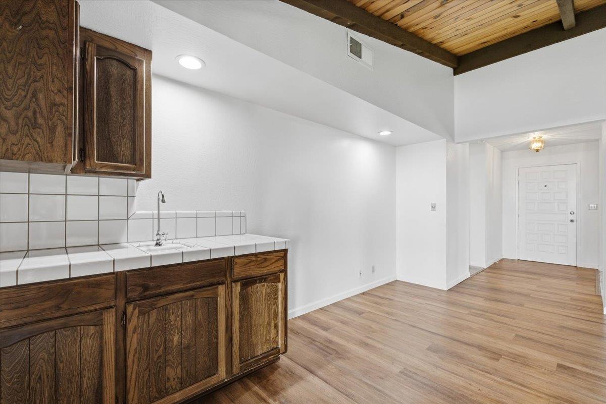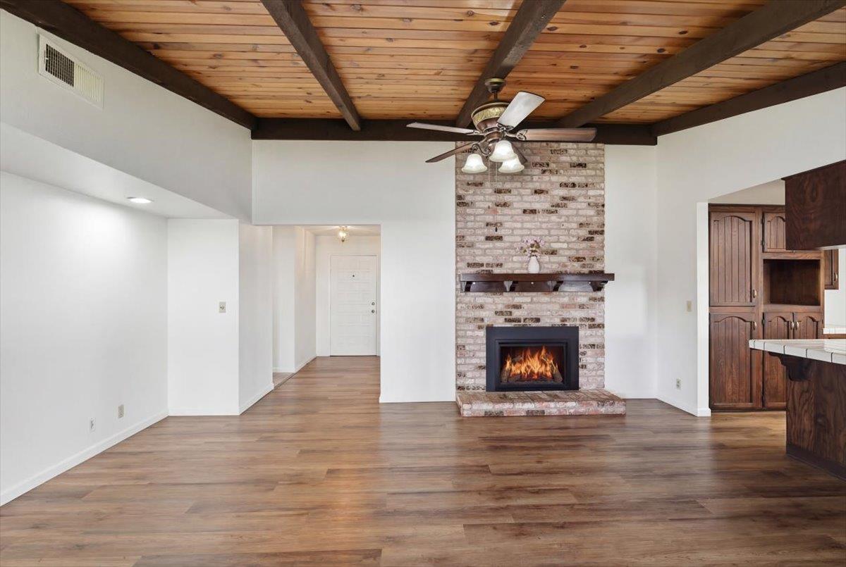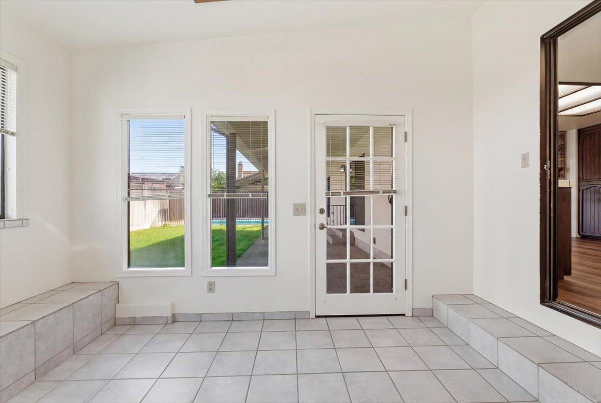 Welcome to West Vine St. This beautiful property features three bedrooms, two and a half baths, as well as a three car garage with gated RV parking for your recreational vehicles. Conveniently located near schools, parks, shopping, dining, and some of Lodi's best wineries. Upon entering, you'll find a spacious open floor plan with ceiling to floor windows that brings in abundant natural lighting, a living and dining area that flows seamlessly into the family room with a brick fireplace, vaulted ceilings with exposed beams, and a built in wet bar. The kitchen has plenty of cabinetry, countertop space, a pantry, and a breakfast nook area that leads into a versatile sunroom. The primary bedroom provides direct access to the backyard with sliding glass doors, each bedroom has ceiling fans for that added convenience. Indoor laundry room with storage space and a built in sink as well as a half bath. Step into the backyard where you can enjoy your summer months to come with relaxation and entertainment. Featuring a covered patio, gated swimming pool, and a manicured lawn.