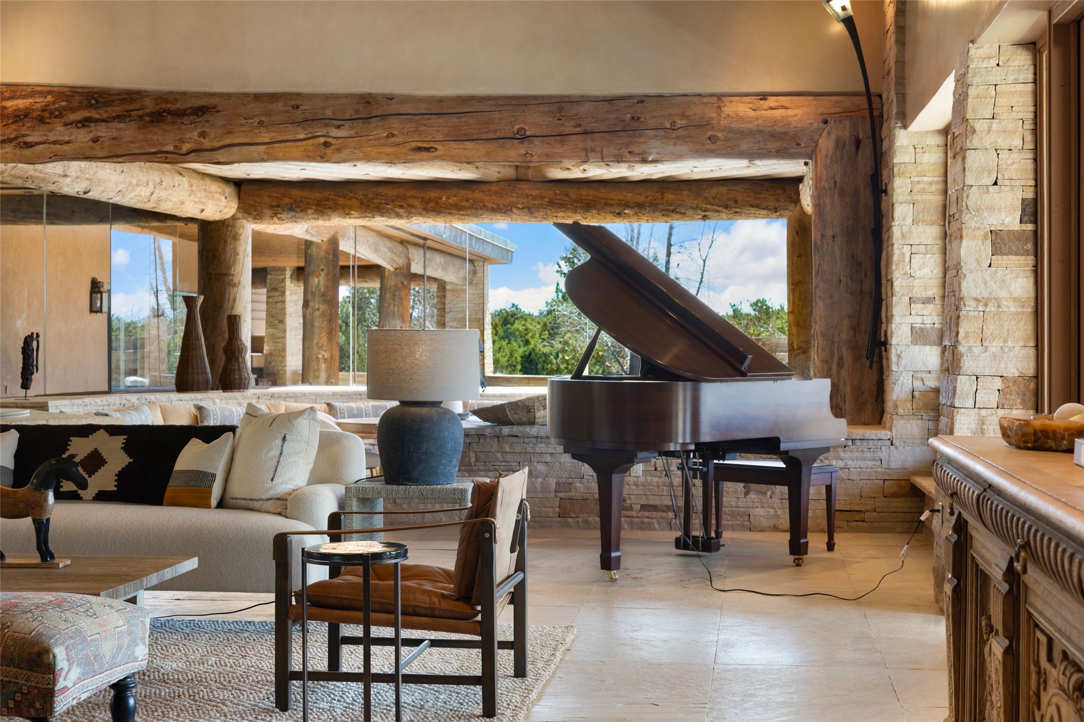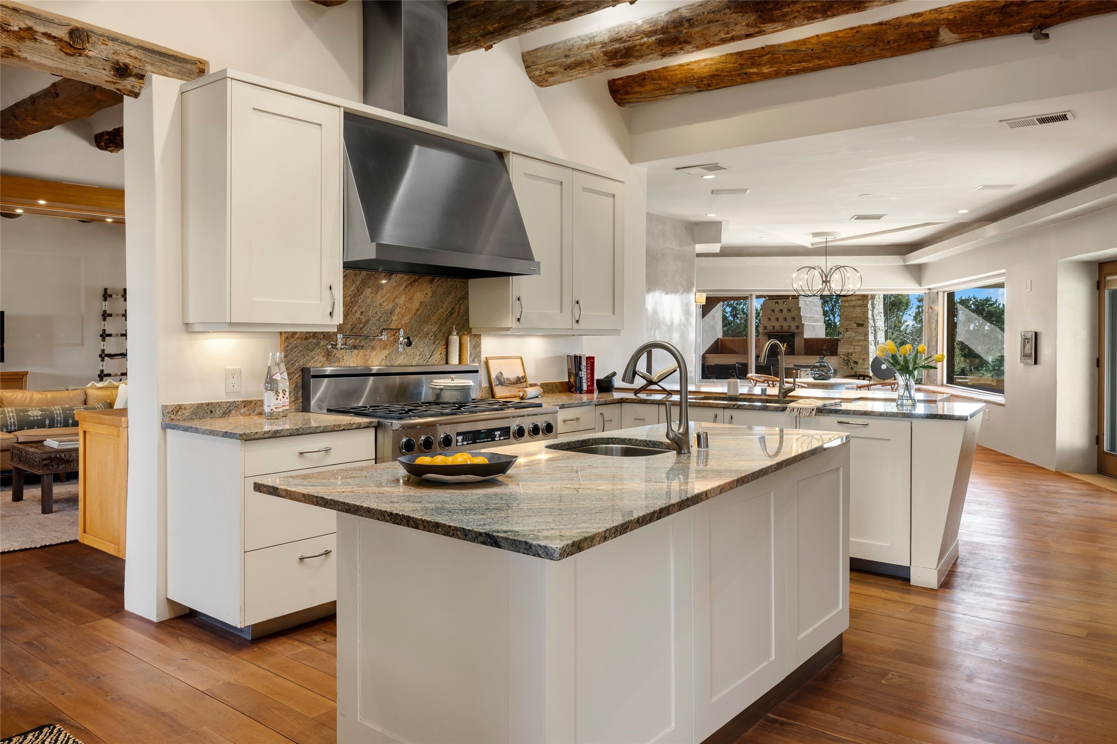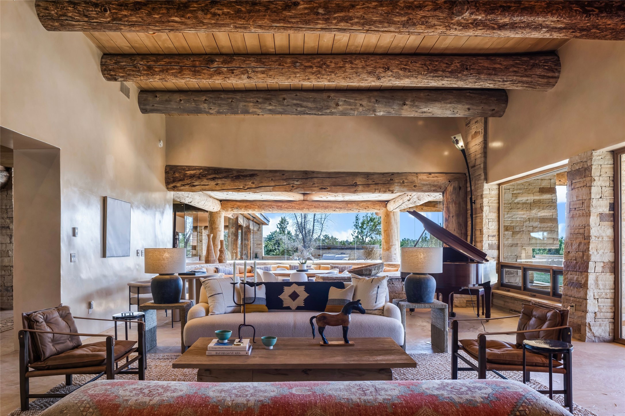 Welcome to 5 Penasco Circle, one of the most exciting estates in Santa Fe, this captivating estate impresses with commanding architecture, majestic mountain views and superior craftsmanship. Privately sited on a premiere 2.3-acre homesite within the famed Las Campanas community, this tour de force home by Turner Lechner & Romero, perfectly blends contemporary design with Northern New Mexico high desert luxury. The gallery-like formal living room stuns and welcomes as a grand centerpiece, flowing into a dining room encased in sheets of glass beneath an iconic hogan-style ceiling, framing surreal Jemez Mountain sunsets. At the heart of the home lies a professional-grade chef’s kitchen, an epicurean sanctuary featuring high-performance luxury appliances, walk-in pantry, butler’s pantry, and a breakfast bar that anchors the home’s casual living and breakfast areas. The primary wing is a sanctuary of refined comfort, offering dual bedroom options with ensuite baths, two private offices, and stone-surround fireplaces—all opening to secluded courtyard living spaces. Three total walk-in closets ensure ample storage for the most discerning homeowner. Guests enjoy ultimate privacy in a dedicated wing featuring a spacious ensuite bedroom, plus two additional guest suites with private entrances. Additional design features include a separate media room/den with its own bath and an attached heated studio. Exceptional craftsmanship is showcased throughout the single-level interior, from quality plaster walls and rare massive vigas to curated natural stone and hardwood flooring. The outdoor experience is unrivaled, featuring vast entertaining areas, deep covered portals, and two covered entry portcacheres. A welcoming front courtyard leads to a rooftop deck providing 360-degree vistas of the high-desert landscape. With extensive guest parking and a tranquil, park-like setting, this estate represents the ultimate Santa Fe and Las Campanas lifestyle.