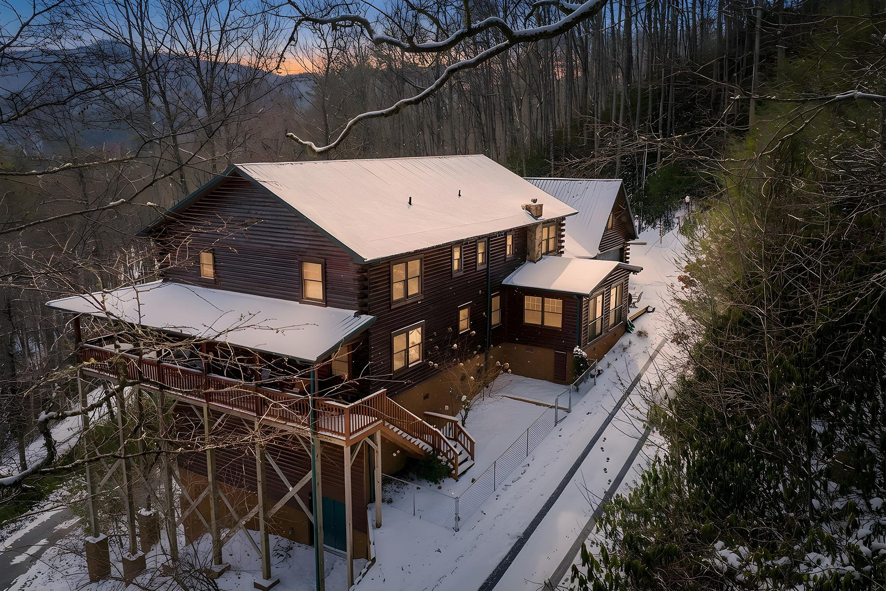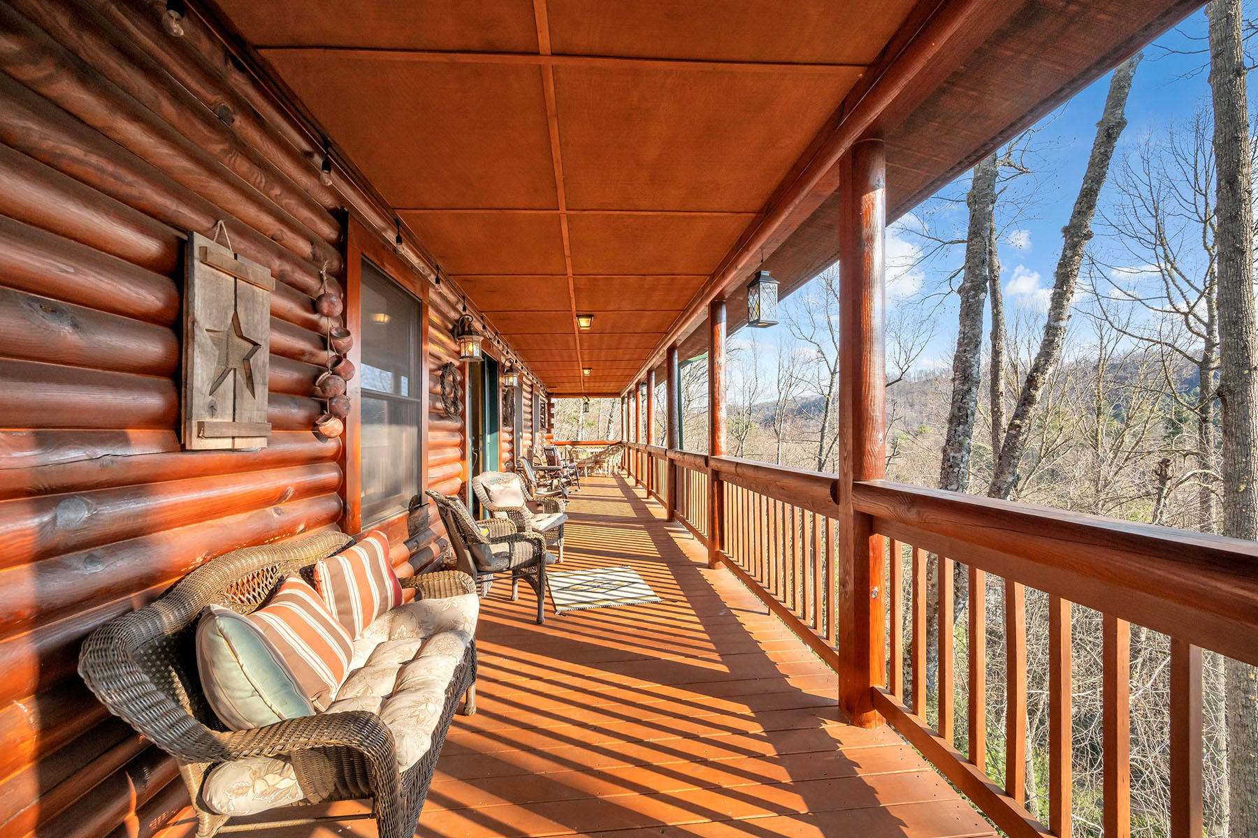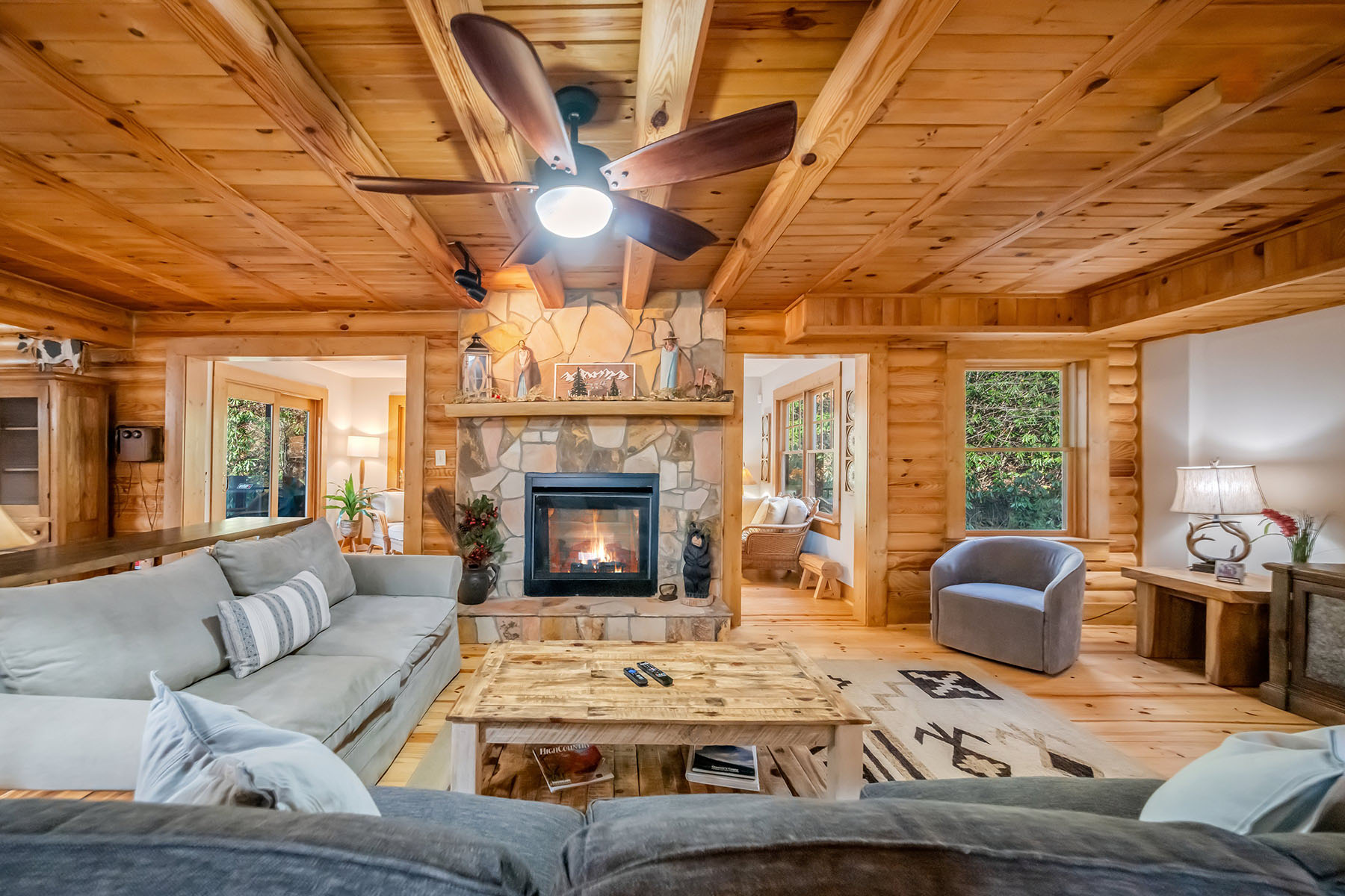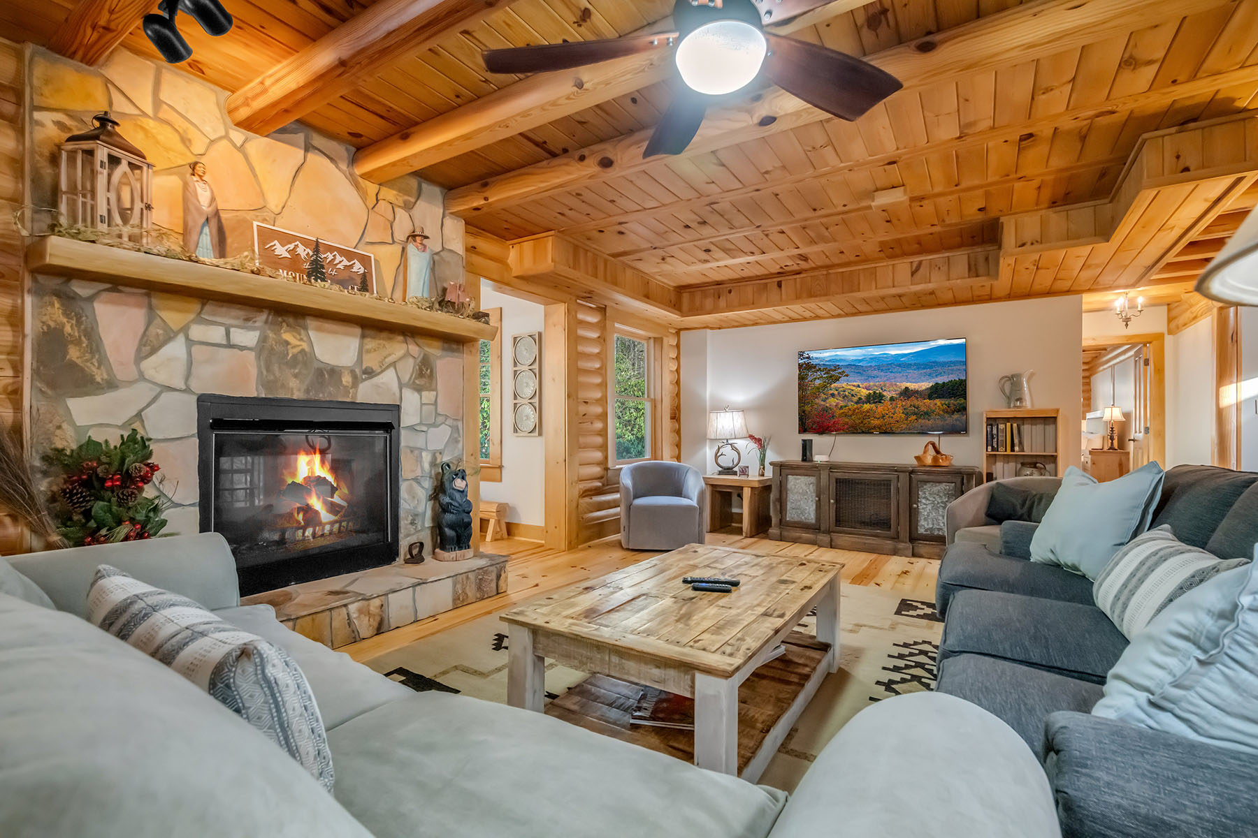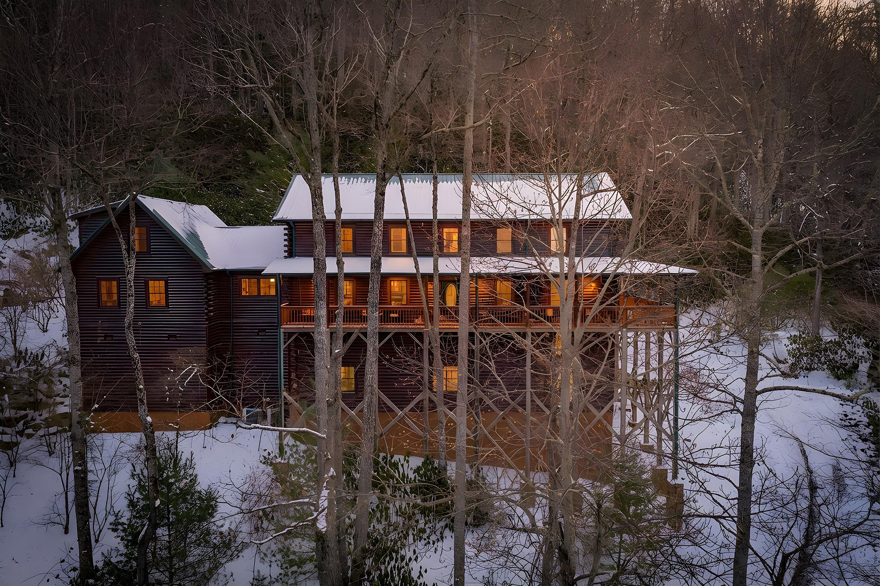 Welcome to Mountainside Lodge, a fully furnished custom log retreat set on 5.73 private acres in the heart of historic Valle Crucis. Offering nearly 4,000 square feet, five bedrooms and seven sleeping areas, this expansive property is designed to host, gather and generate potential income, delivering exceptional value at $1,150,000. An additional 544 square feet of heated finished living space above the garage, used as a game room, is not included in the total square footage. Originally operated as a bed and breakfast and now a successful vacation rental, the home is thoughtfully configured with five private bedroom suites, each with an en-suite bath, allowing guests to enjoy comfort and privacy. Multiple indoor and outdoor gathering spaces make it easy to accommodate large groups, creating an ideal setting for family retreats, group vacations or potential income-producing stays. The main living area is anchored by a double-sided stone gas fireplace, complemented by a warm log interior that reflects classic mountain design with updated finishes. The oversized kitchen is built for connection and entertaining, featuring three ovens, a large central island and multiple refrigeration options, allowing for seamless hosting of large gatherings. A separate heated game room above the garage provides an additional private retreat, complete with a pool table, air hockey, dart board and large television. This flexible space allows guests to gather and unwind without disrupting the main living areas. Outdoor living is a defining feature of the property. A wraparound covered porch offers multiple seating areas, outdoor dining space and a swing, while the hot tub and fire pit overlook wooded surroundings and mountain views. A fenced area for pets is conveniently accessed directly from the wraparound deck, adding functionality and ease for pet owners. Recent improvements include a metal roof installed in 2022, paved driveway and exterior enhancements, contributing to long-term durability and accessibility. The property also offers an oversized two-car garage and ample parking for guests. Just minutes from Valle Crucis Community Park, the Watauga River and a short drive to Banner Elk, Boone and Blowing Rock, the home provides convenient access to hiking, fishing, skiing and year-round High Country attractions. With its established rental history, ability to accommodate large groups and turnkey furnishings, this property presents a compelling opportunity for a private mountain estate, vacation home or potential income-producing investment property. Rental evaluation available upon request. A distinctive mountain retreat where space, setting and versatility come together to support memorable gatherings and long-term value.